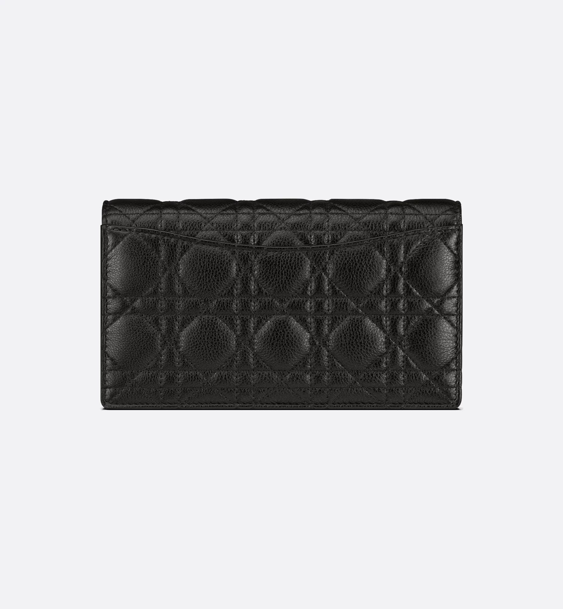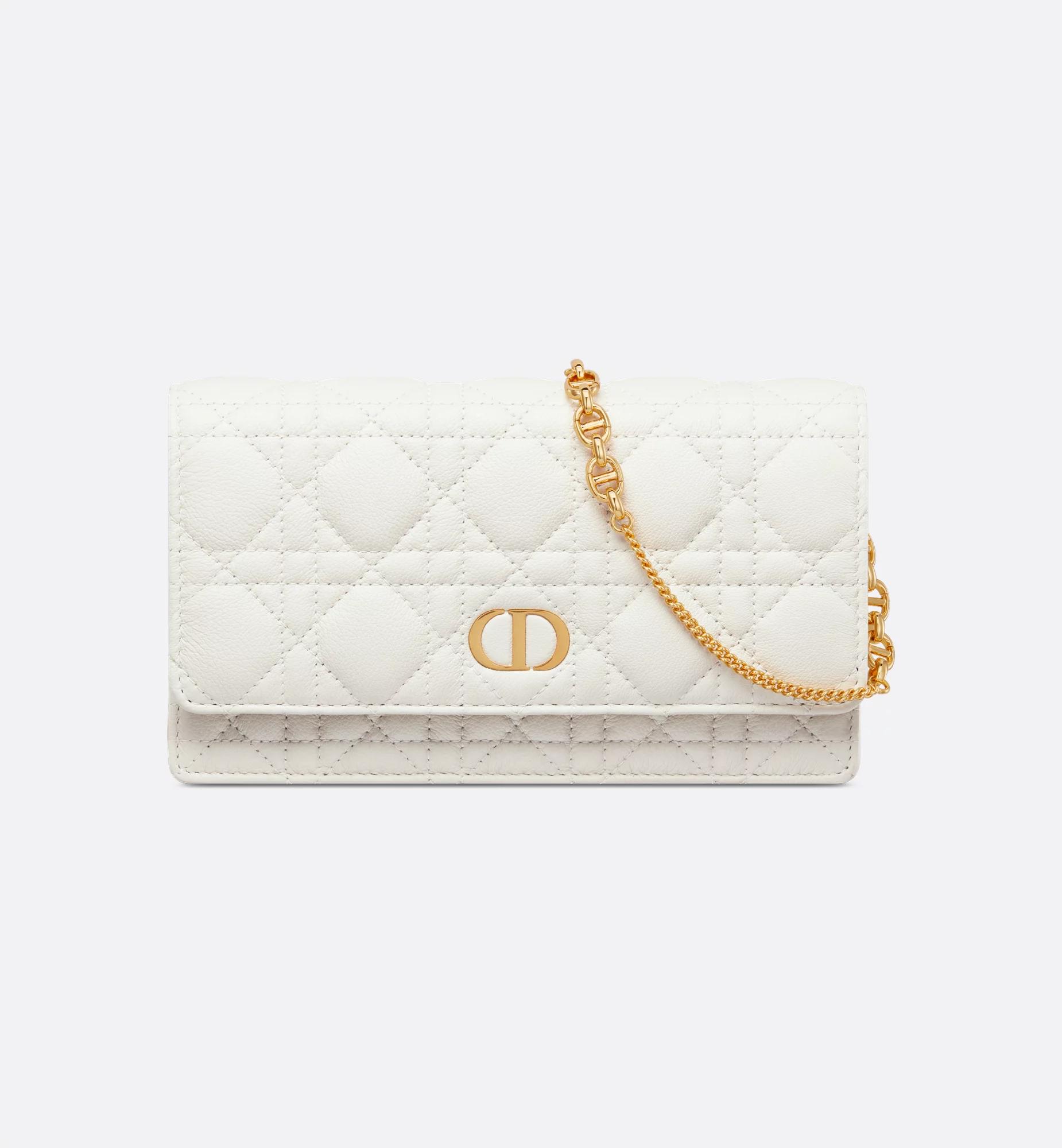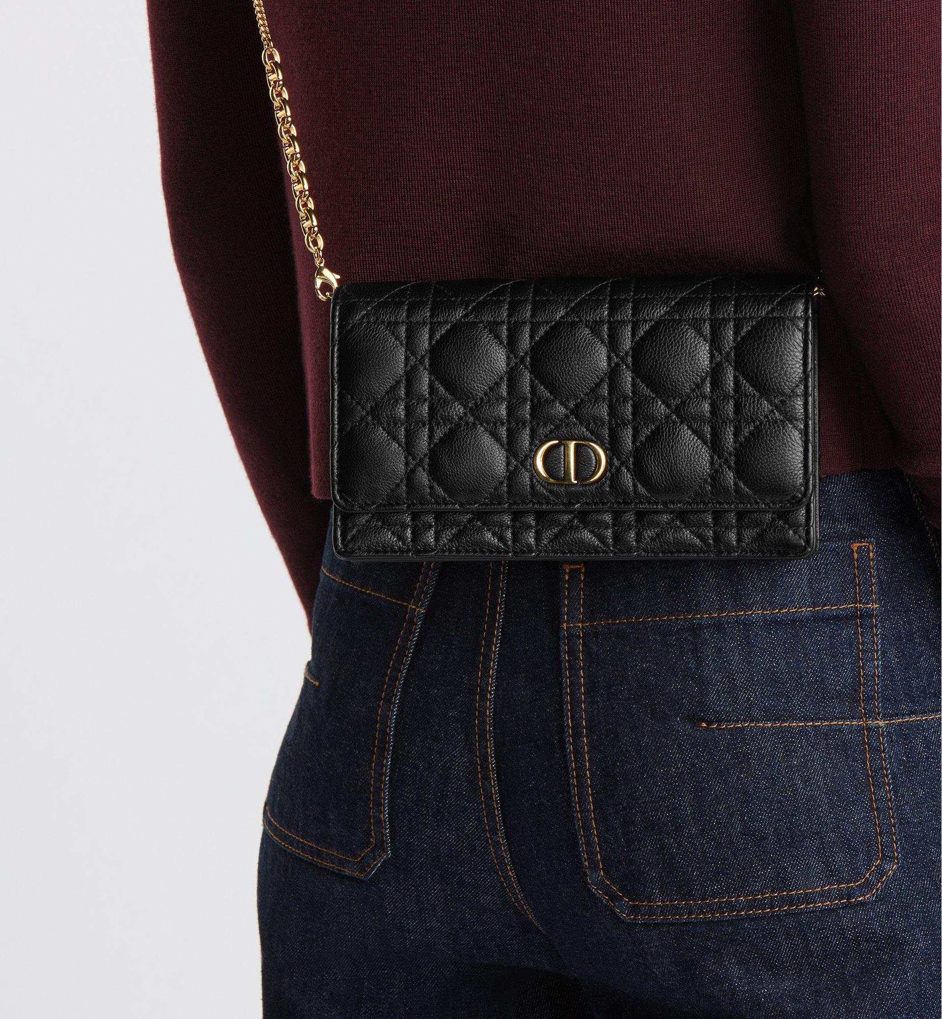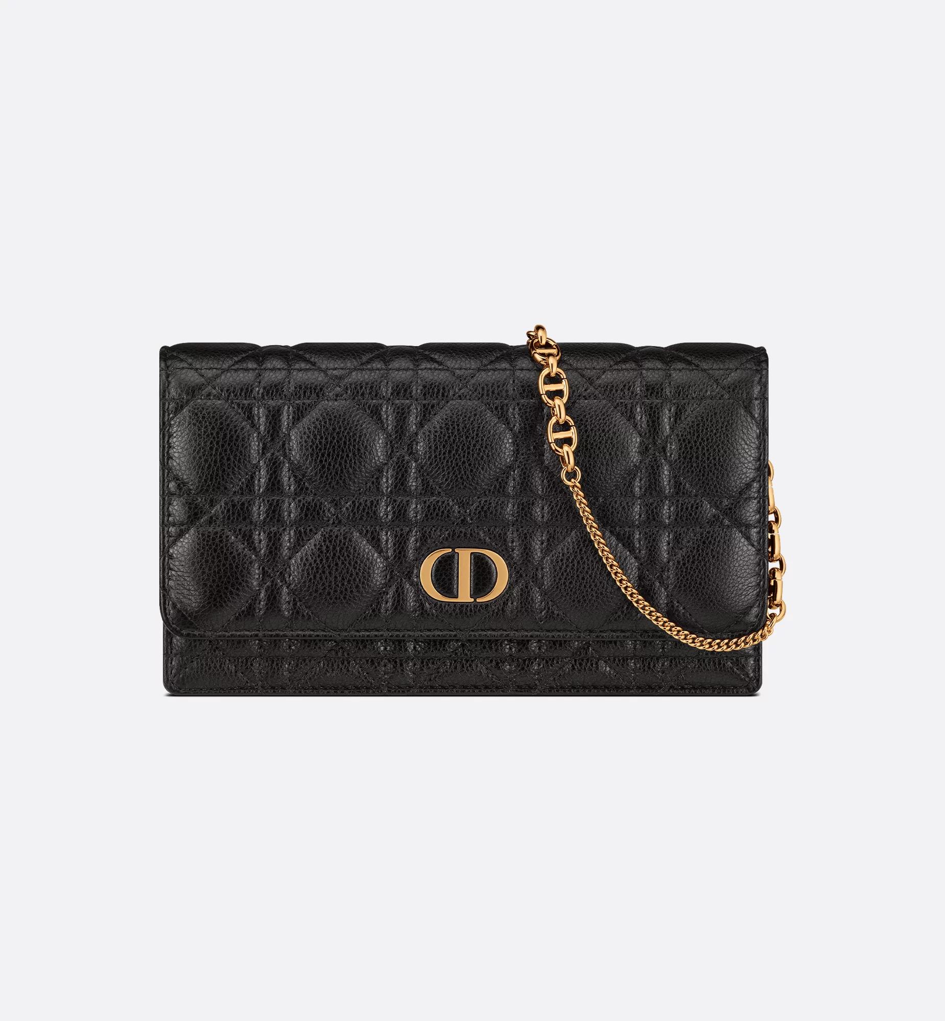 The Dior Caro pouch with chain is a practical and elegant creation. Crafted in black supple calfskin with Cannage stitching, it features an antique gold-finish metal CD signature flap that reveals a compartment to hold all the essentials. The removable CD-link chain allows it to be carried by hand, worn over the shoulder or crossbody, thus making it an ideal daily companion.