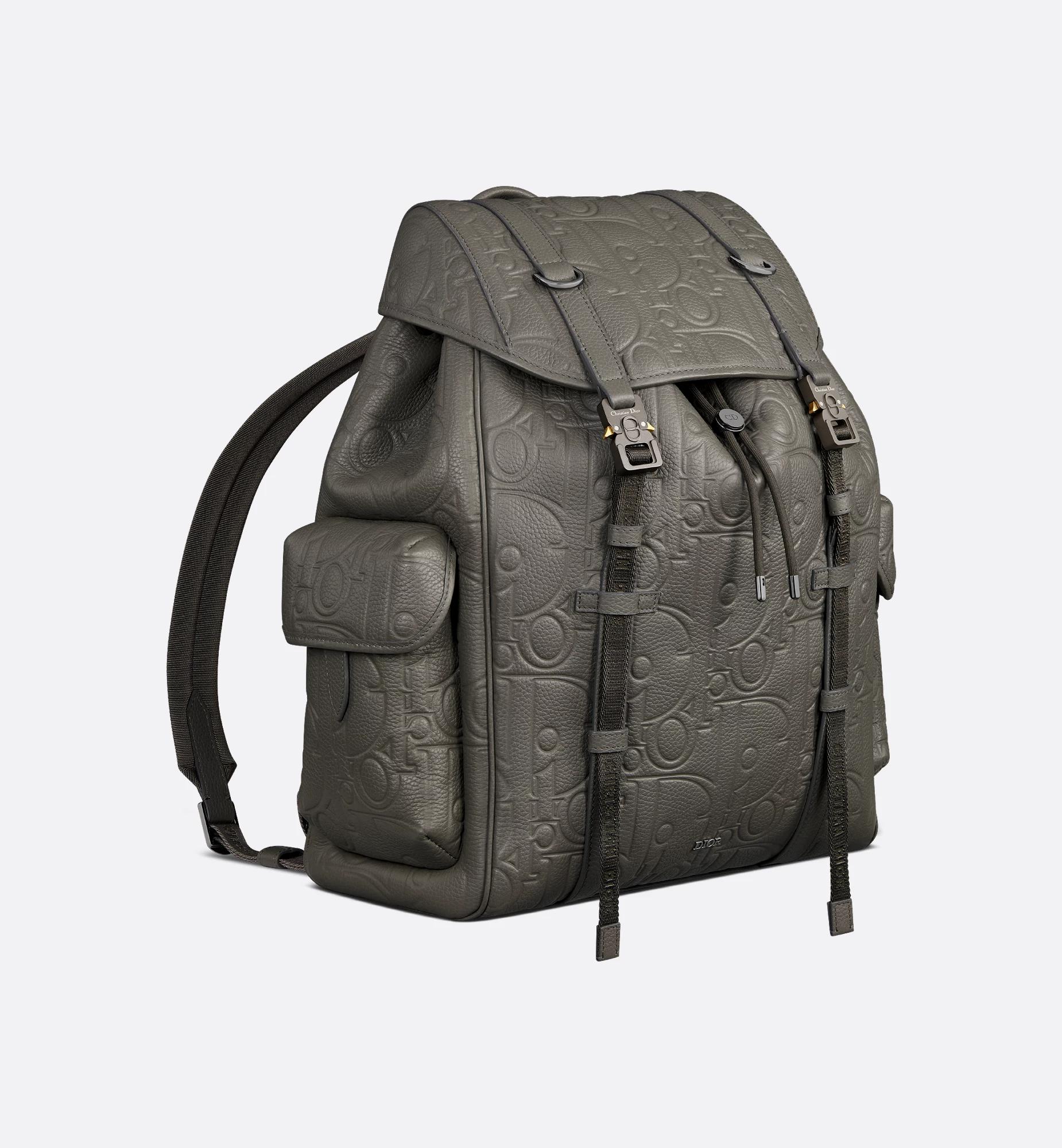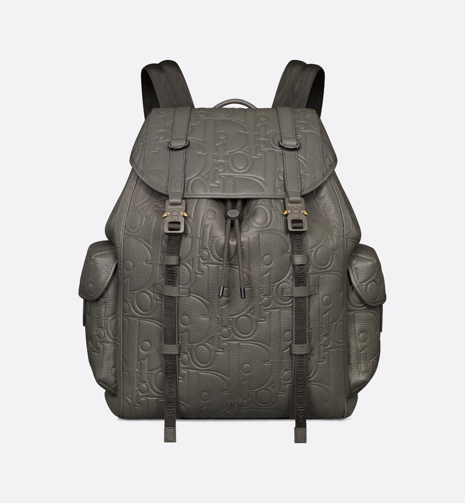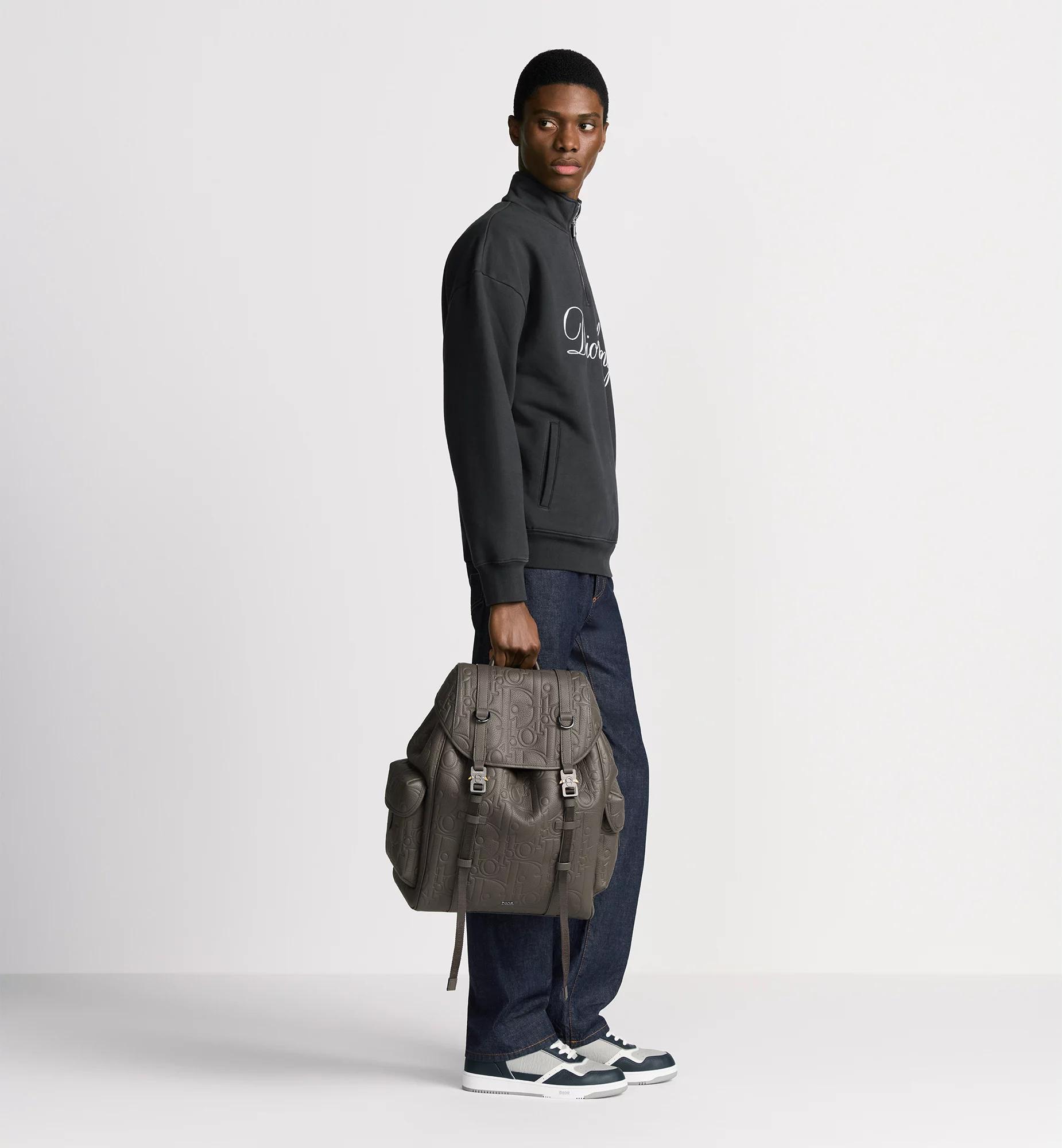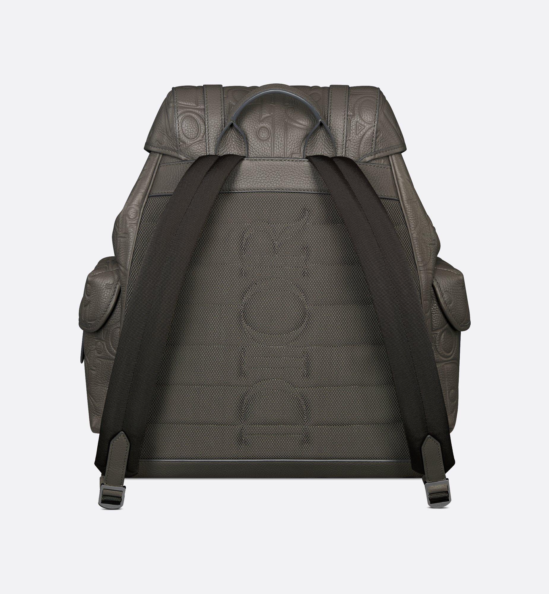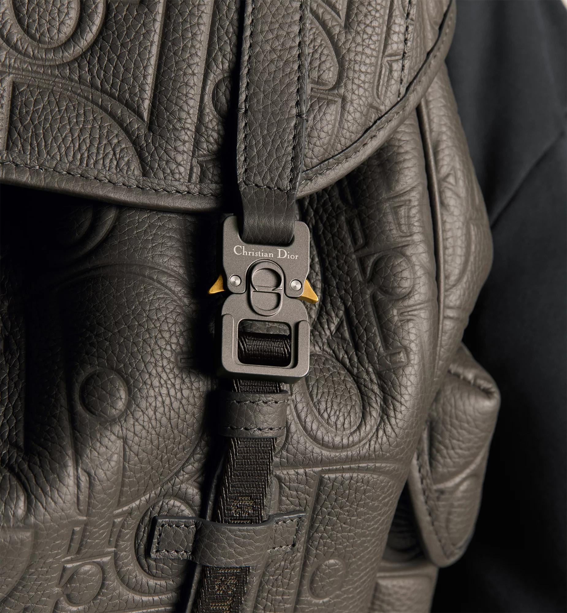 The Dior Hit the Road backpack with flap offers a modern take on the House's couture spirit. Displaying the virtuosity of Dior's ateliers, the Dior Gravity leather showcases the iconic motif delicately embossed on gray calfskin and accented by gray grained calfskin detailing and the Dior signature on the front. It features a flap equipped with aluminum CD mini buckles and two Christian Dior nylon jacquard straps, as well as a spacious main compartment and two side pockets with magnetic flaps. The practical backpack will complete casual outfits. Main composition: calfskin and technical fabric. Technical fabric, cotton and calfskin lining. Main compartment with flap and drawstring cord. CD aluminum mini buckles and D-rings. Interior flat compartment for laptop. Magnetic side flap pockets. Leather top handle. Adjustable padded shoulder straps. Padded mesh back with Dior signature. Ruthenium-finish brass Dior signature on the front. Embossed Dior signature on the interior. Dust bag included. Made in Italy