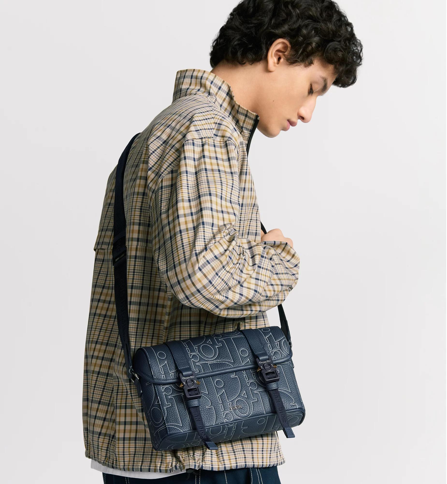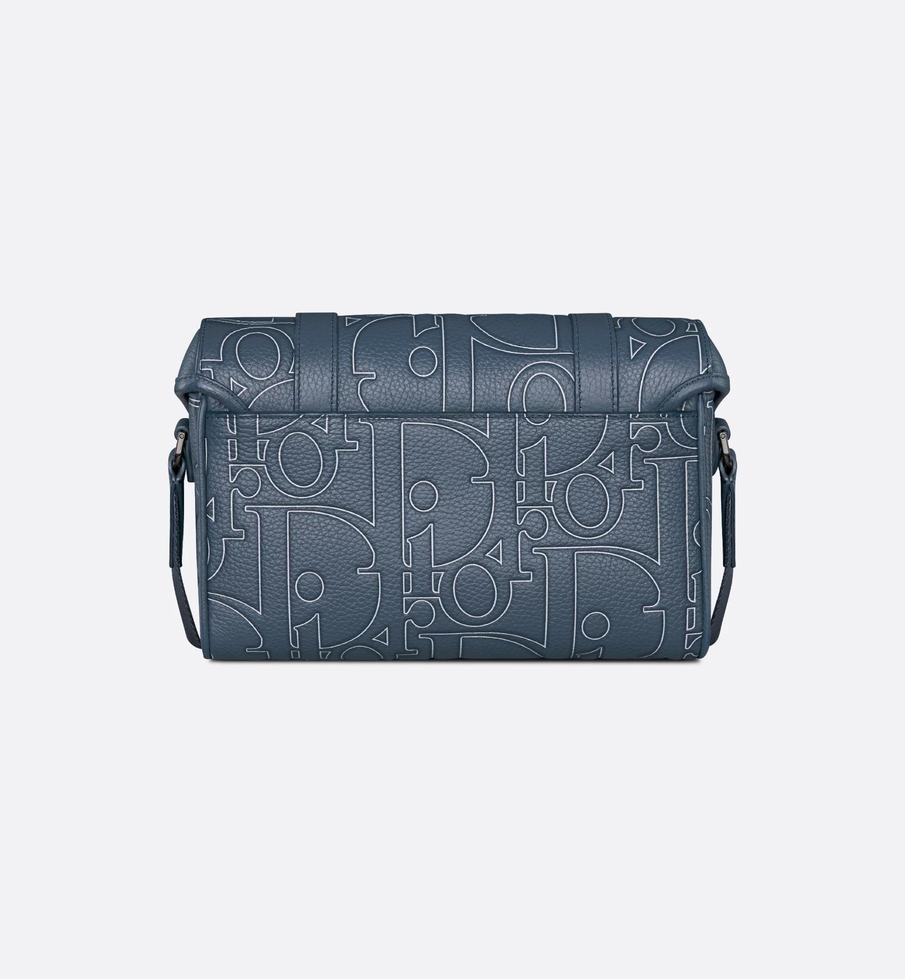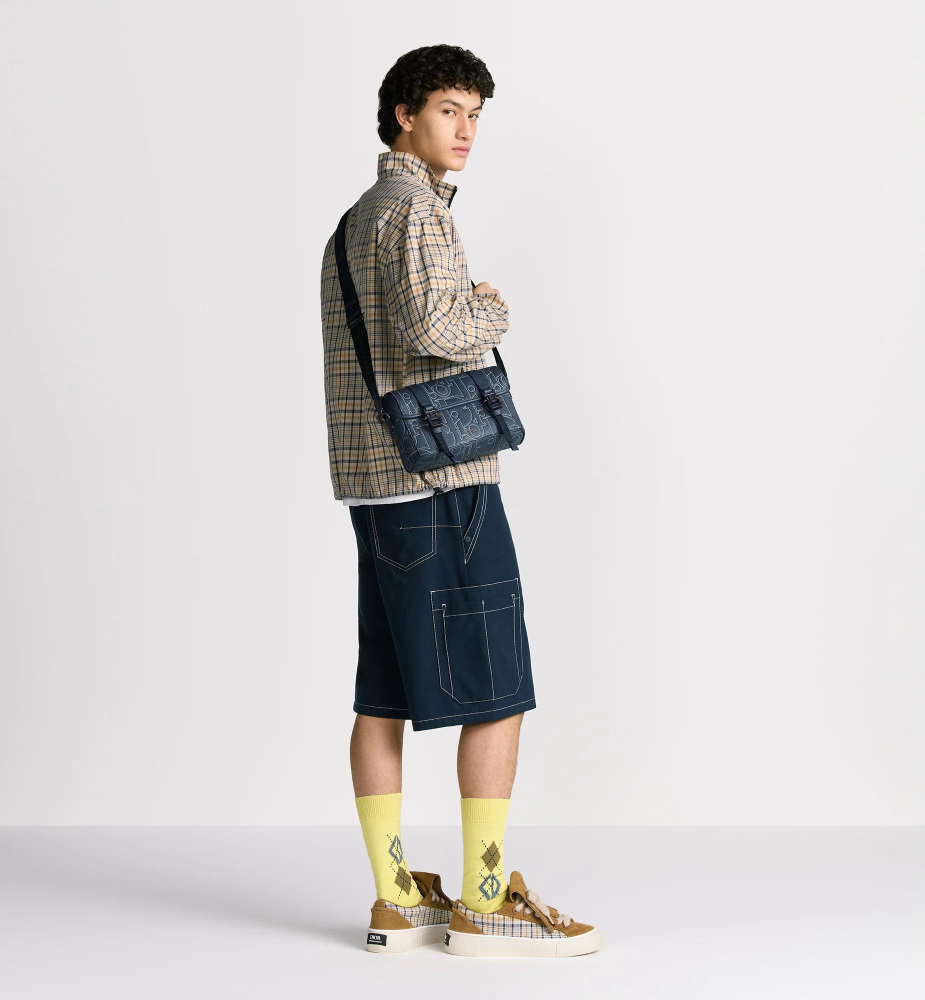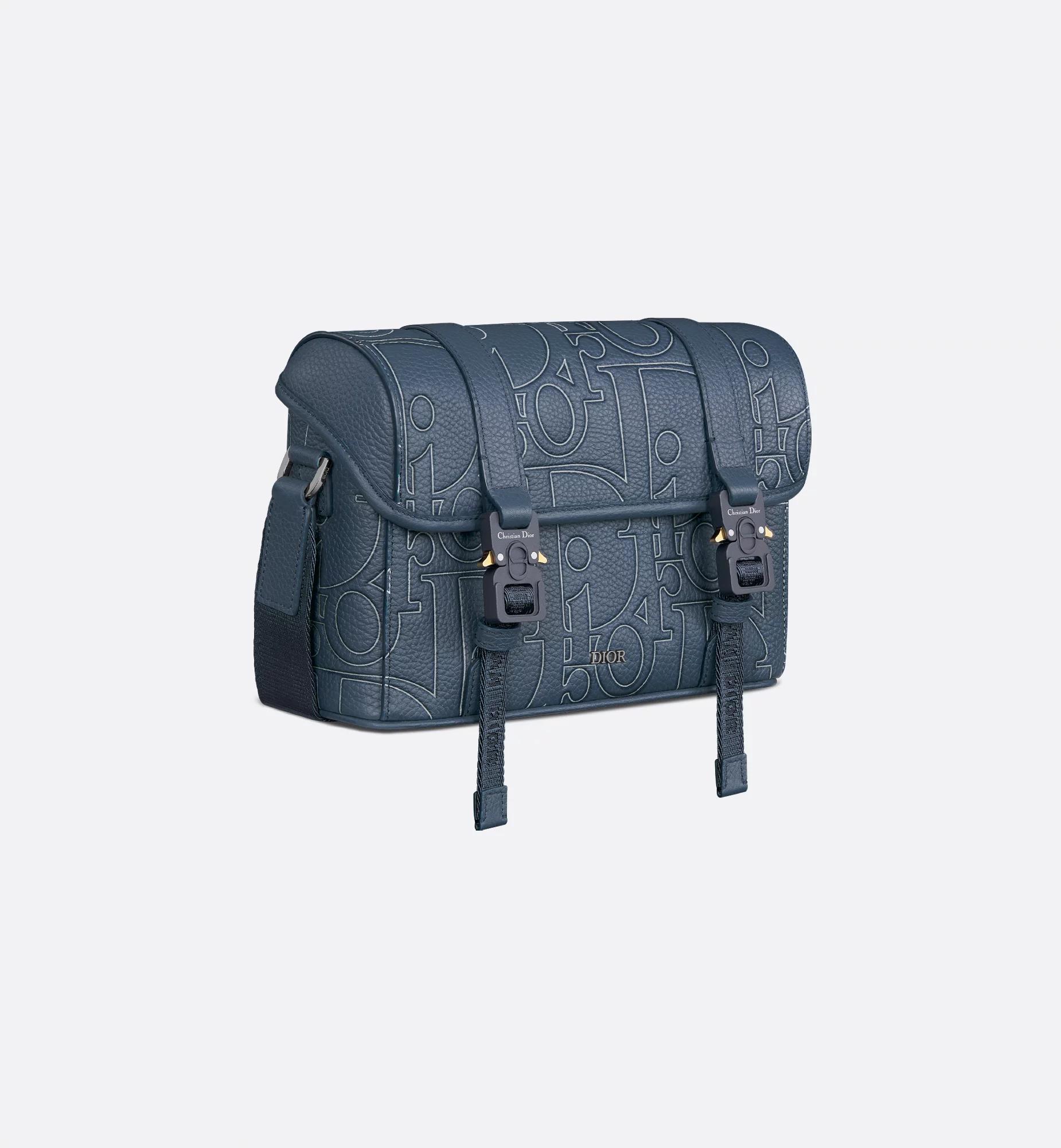 The messenger bag with flap expands the Dior Hit the Road line with a modern design that embodies the House's couture spirit. The style is crafted in navy blue Dior Gravity Outline leather, a grained calfskin embossed with the iconic House motif for a 3D effect with graphic appeal. Accented by the Dior signature on the front, it has a flap with tonal CD aluminum mini buckles and two Christian Dior nylon jacquard straps. Its spacious compartment can accommodate all the essentials. Completed by an adjustable shoulder strap, the practical bag will lend the finishing touch to casual attire. Main composition: calfskin and technical fabric. Technical fabric, cotton and calfskin lining. Main compartment with flap and tonal CD aluminum mini buckles. Interior slip pocket. Adjustable Christian Dior nylon jacquard and calfskin shoulder strap. Ruthenium-finish brass Dior signature on the front. Embossed Dior signature on the interior. Dust bag included. Made in Italy