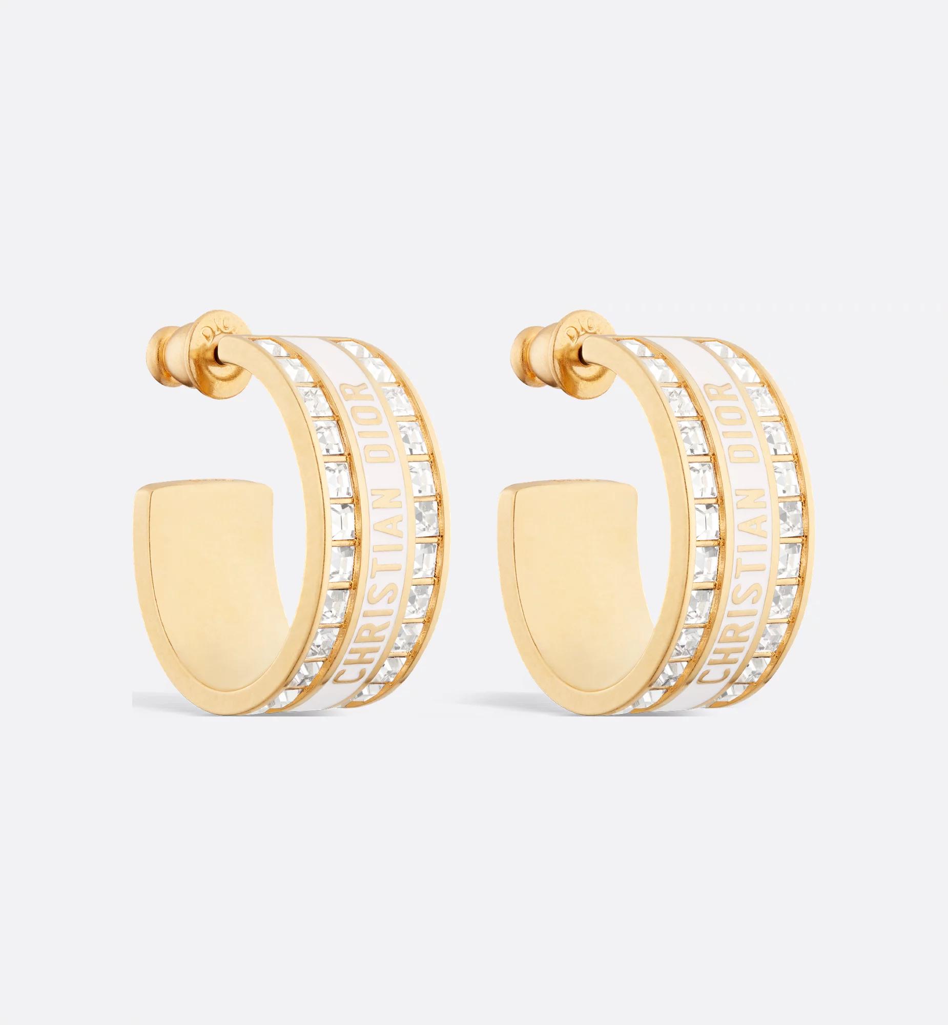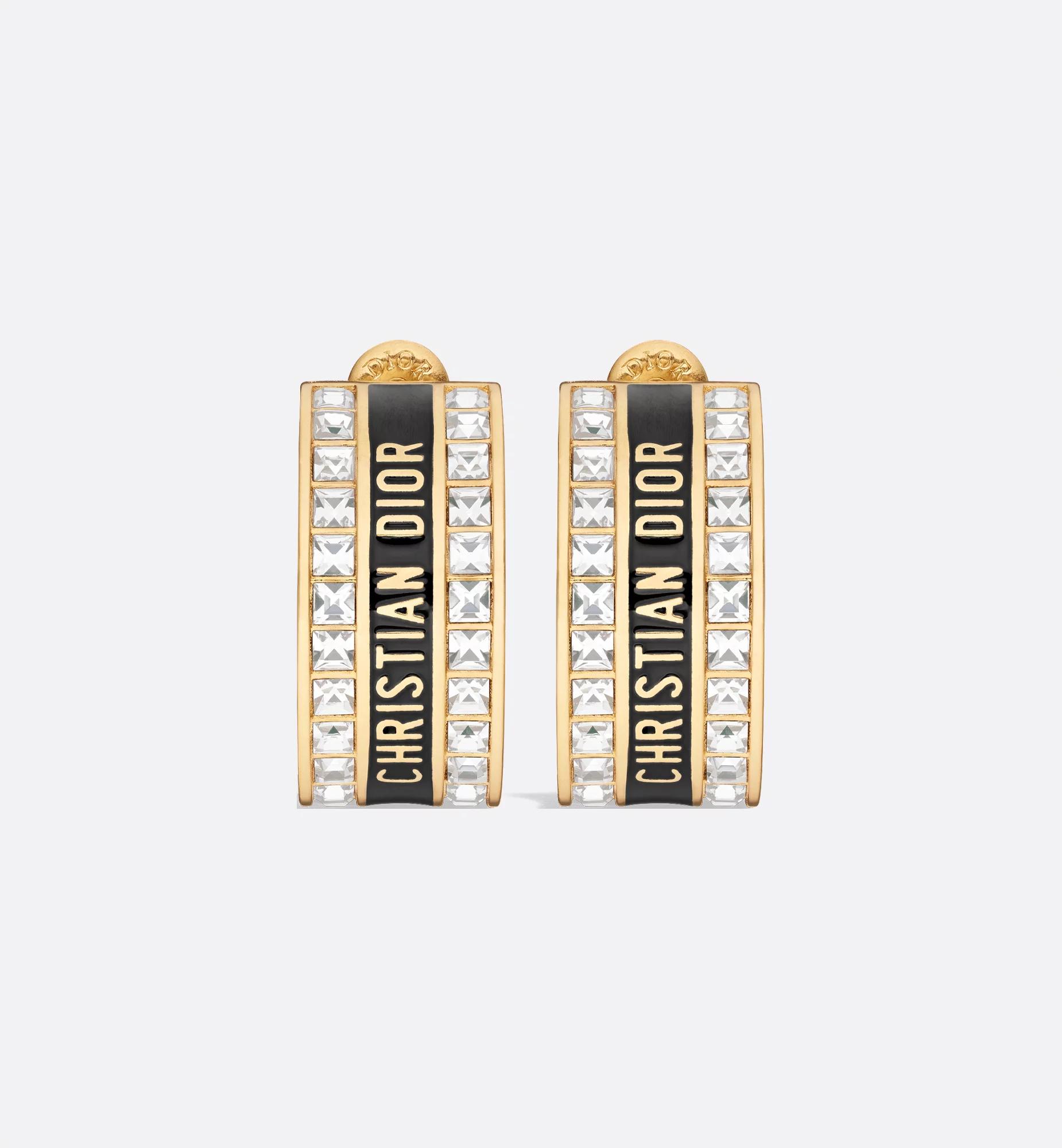The small Dior Night Code hoop earrings offer modern and refined appeal. The Christian Dior signature adorns a gold-finish metal hoop embellished with black lacquer and white crystals. The earrings can be paired with other creations from the Dior Night Code line. White crystals. Christian Dior signature. Black lacquer. Gold-finish metal. Push clasp. Sold as a pair. Made in Germany or Portugal
