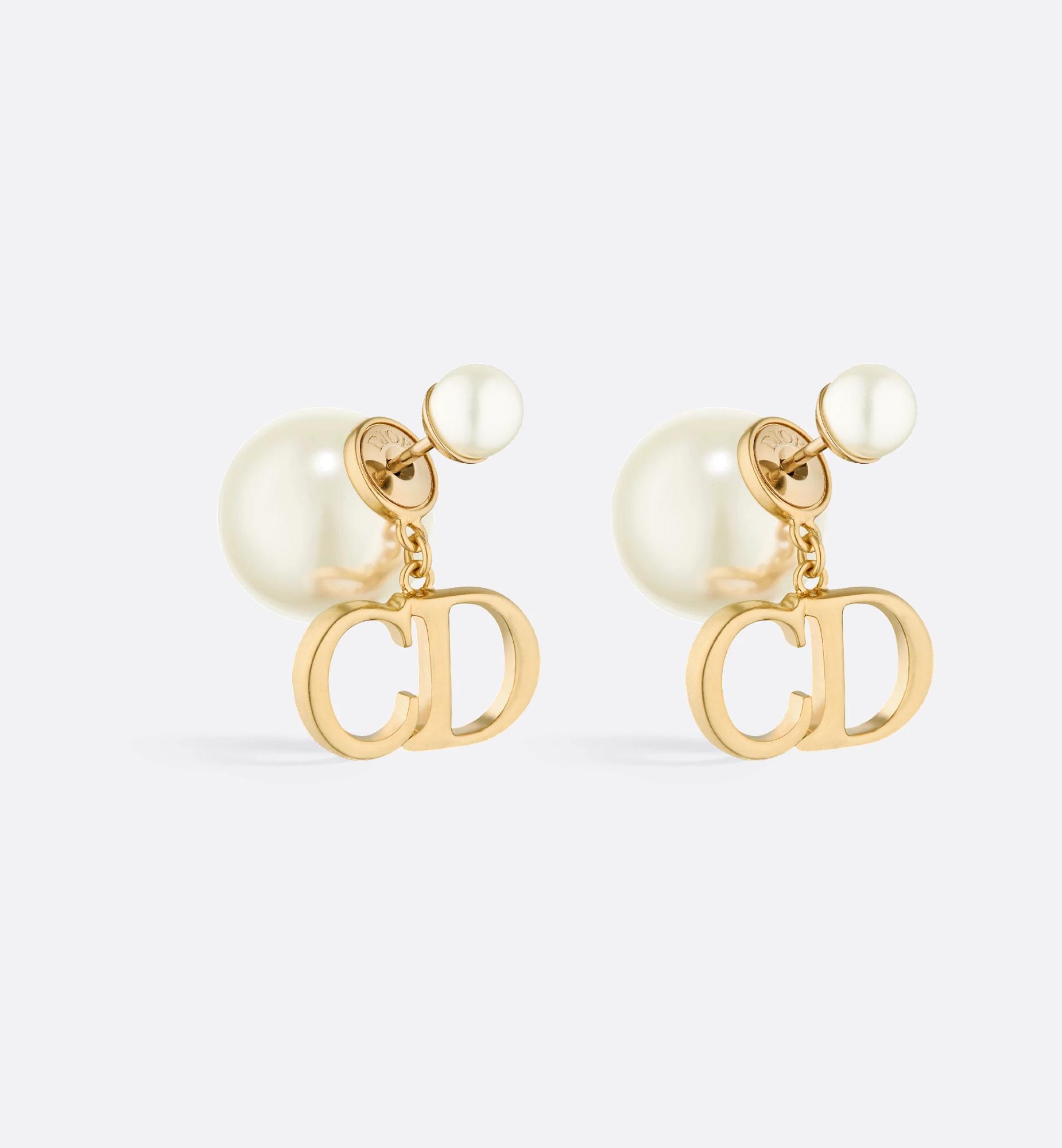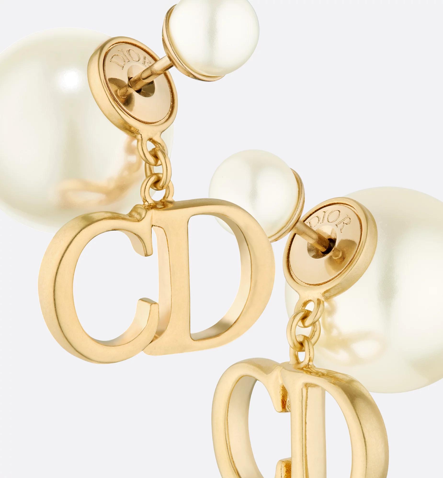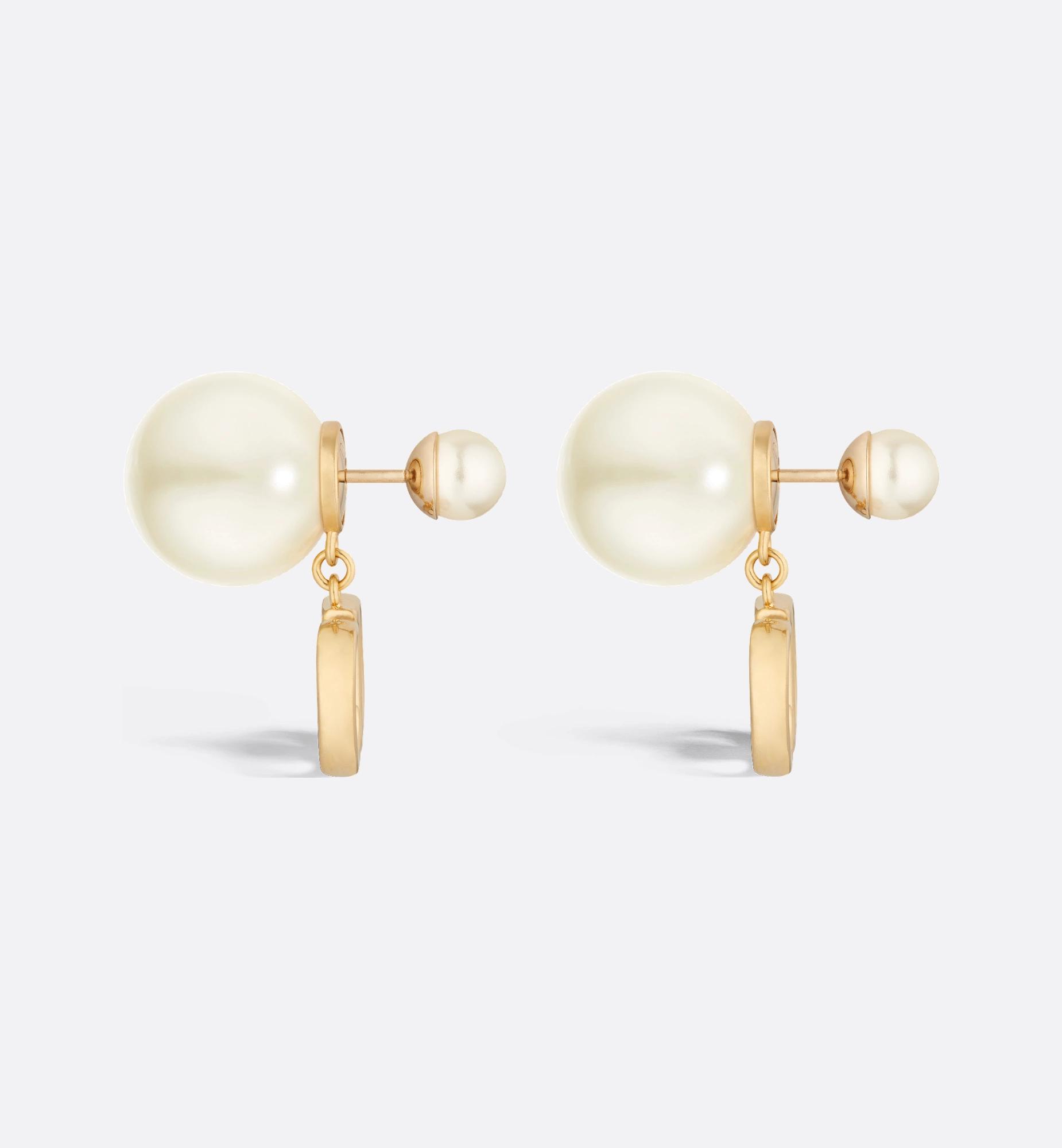 The Dior Tribales earrings play with the timeless signature of the Saddle bag, a true House icon. The hallmark resin pearls showcase the CD signature in gold-finish metal. The earrings can be combined with other Saddle creations. White resin pearls. CD signatures. Gold-finish metal. Integrated clasp on the rear pearl. Sold as a pair. Made in Germany