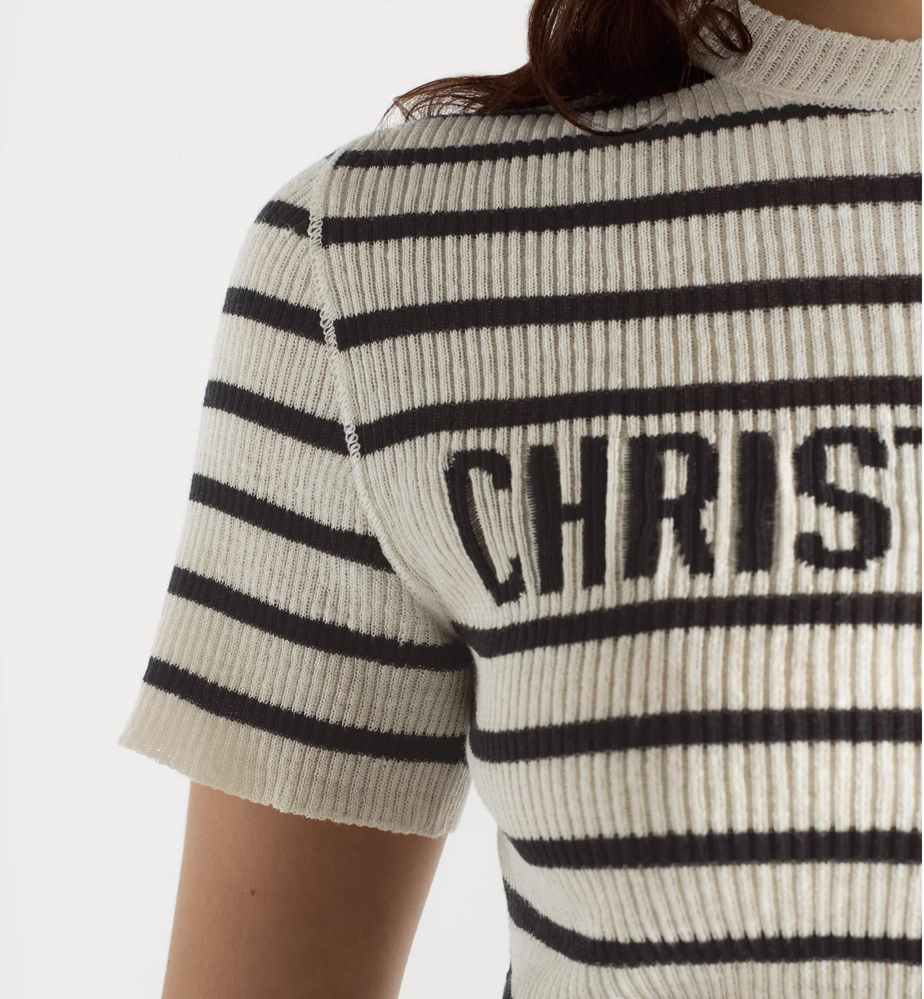 Part of the Dioriviera capsule, the short-sleeved sweater is a modern and elegant design. Crafted in a white and navy blue linen and silk knit with the D-Stripes motif, it features a fitted silhouette embellished with the Christian Dior signature on the front. The sweater can be coordinated with other Dioriviera creations. Christian Dior signature on the front. Unlined. 80% linen, 20% silk (14 gauge)*. Made in Italy. Treat with extra care and gently dry clean