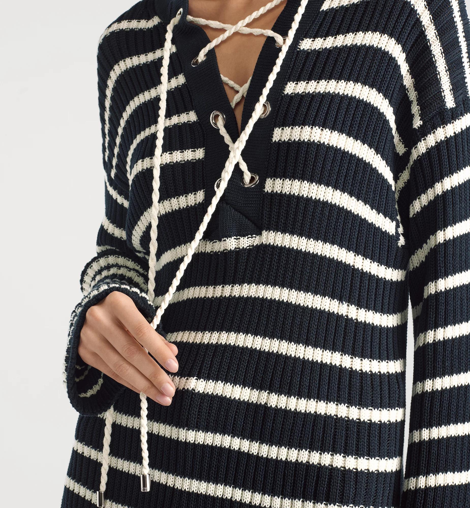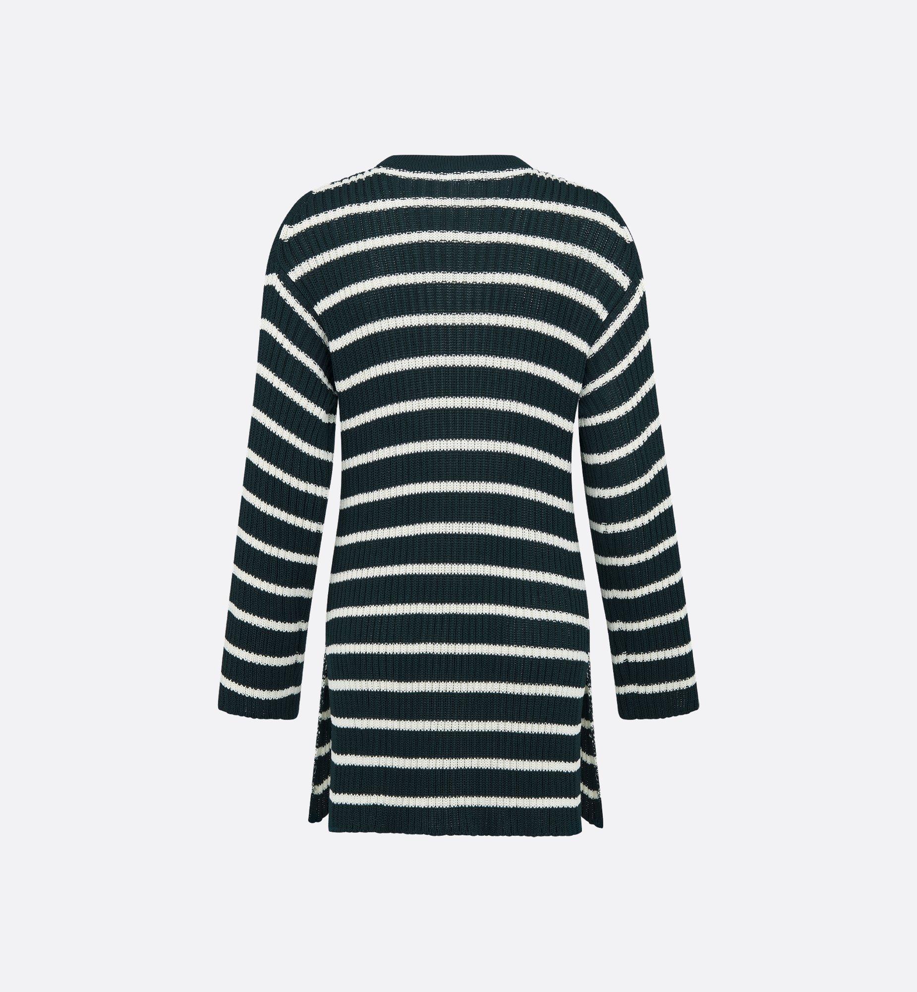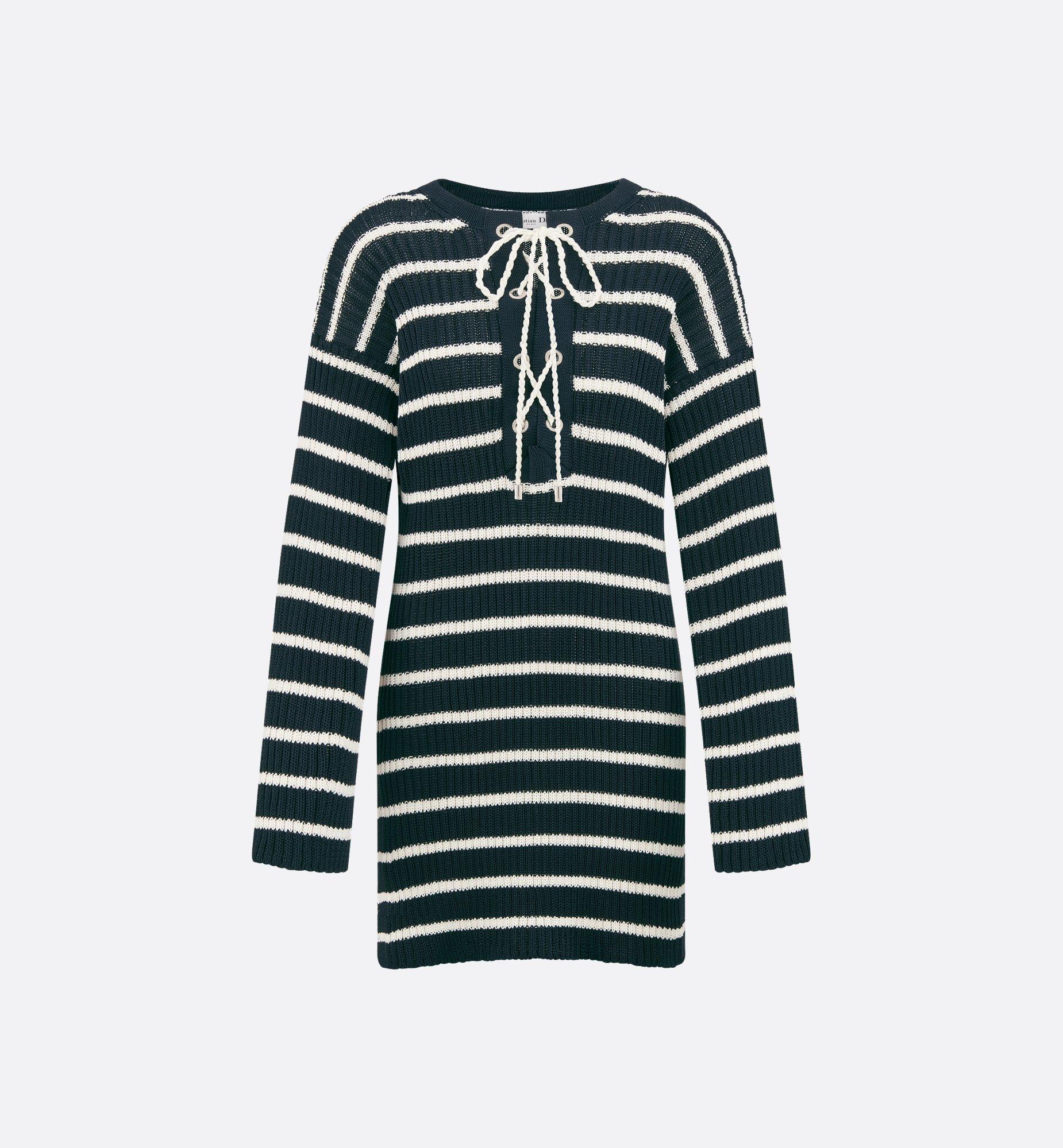 Part of the Dioriviera capsule, the long sweater is a modern and elegant design. Crafted in a navy blue and white cotton knit with the D-Stripes motif, it features a regular-fit silhouette enhanced by a lace-up neckline with Christian Dior Paris metal eyelets, as well as side slit detailing. The long sweater can be coordinated with other Dioriviera creations. Lace-up neckline with Christian Dior Paris metal eyelets. Side slits. Unlined. 100% cotton (5 gauge)*. Made in Italy. Treat with extra care and gently dry clean