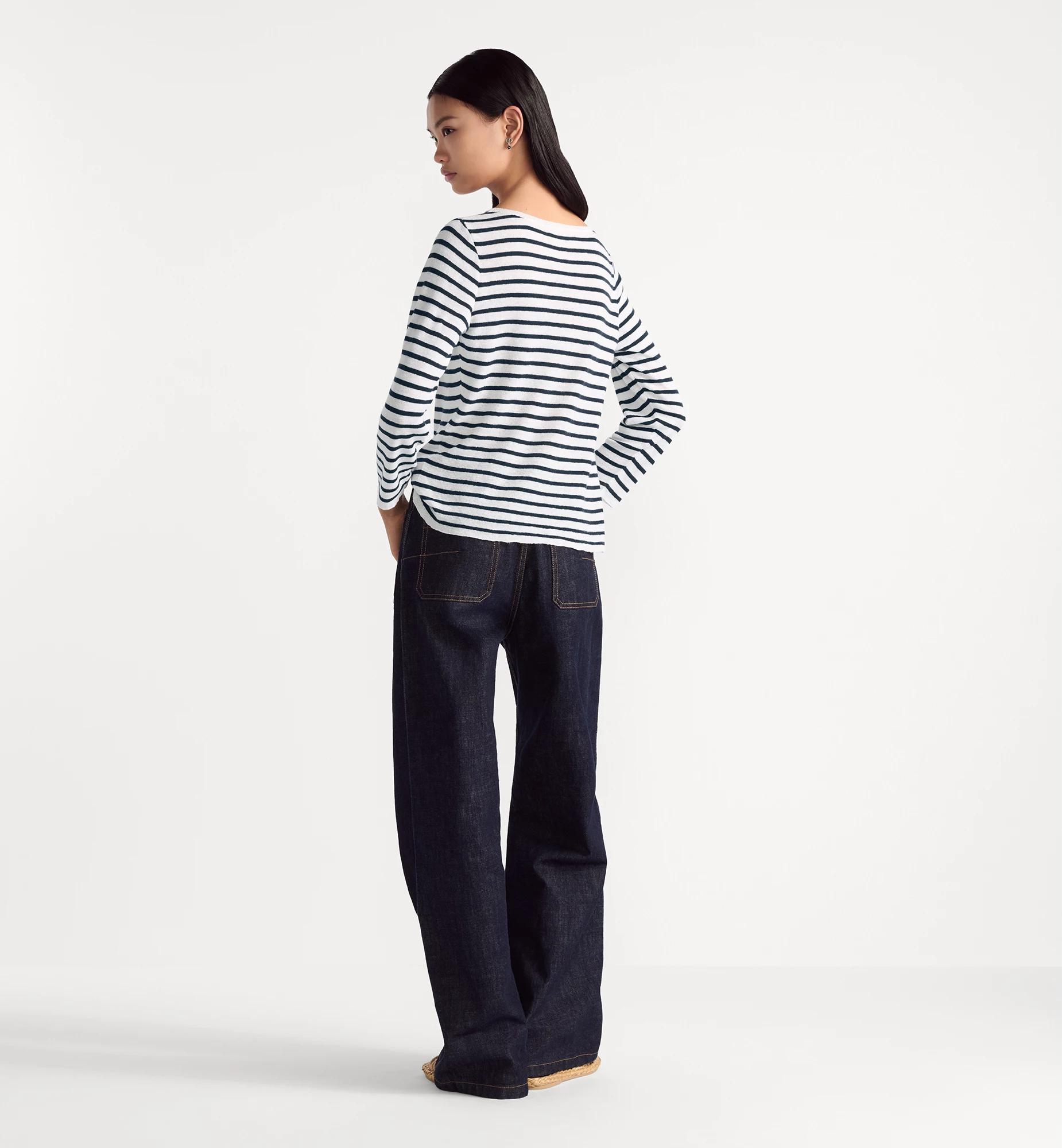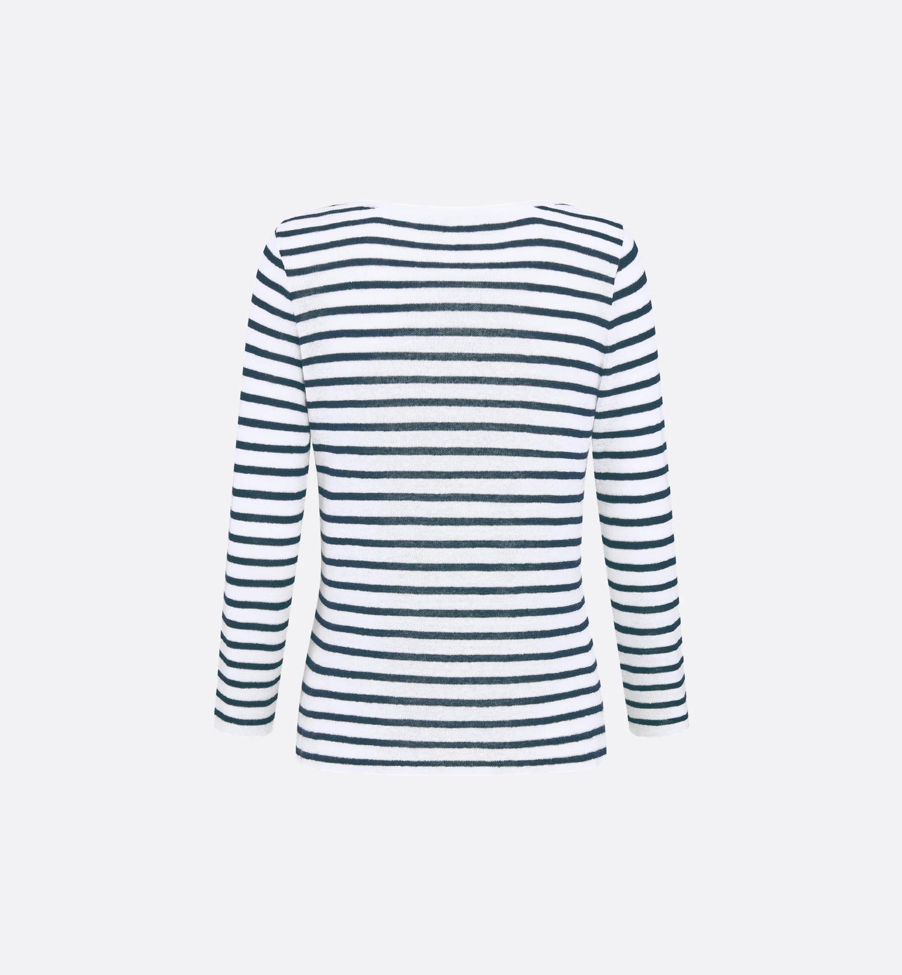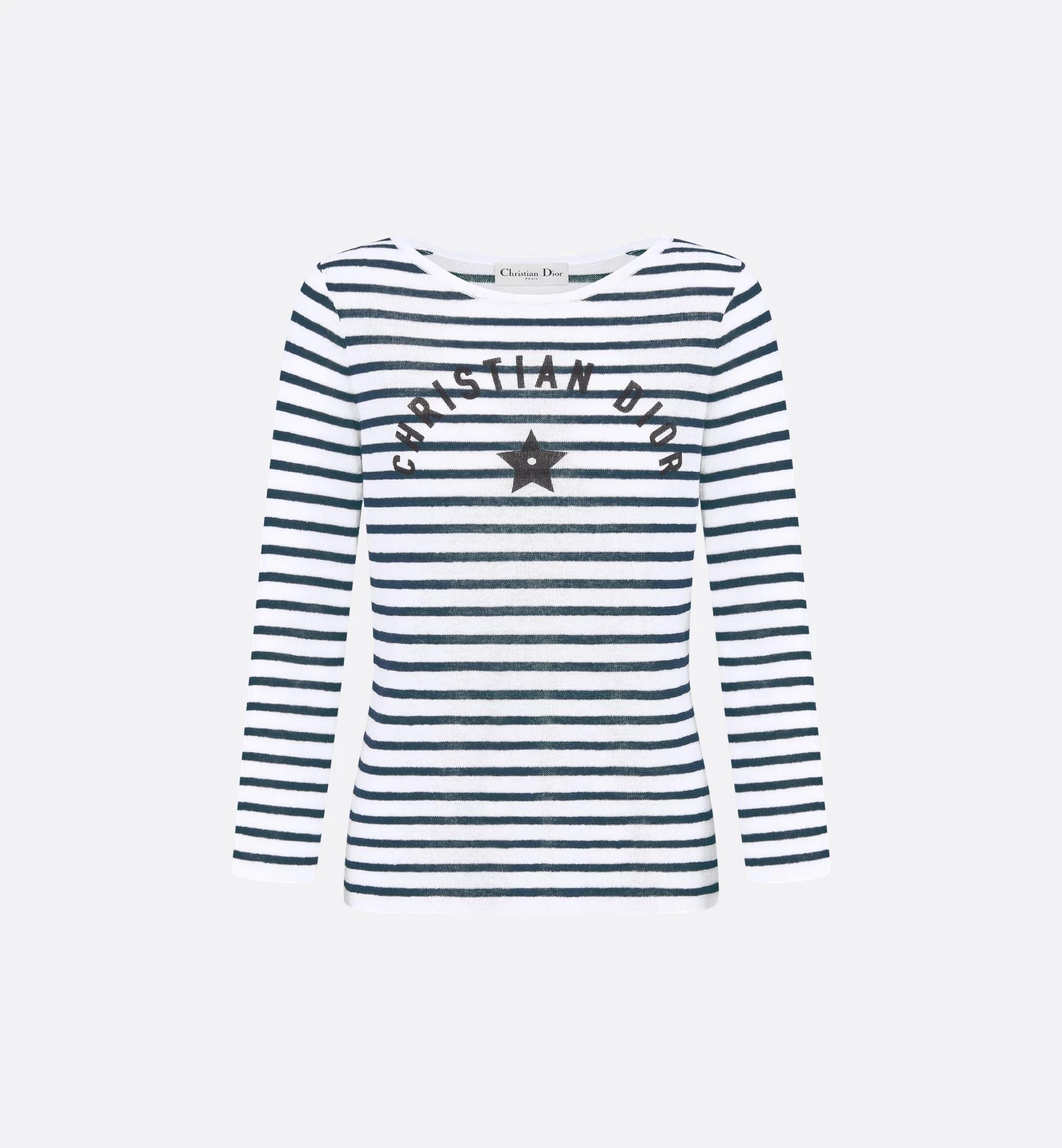 Part of the Dioriviera capsule, the sweater is adorned with the timeless D-Stripes motif in ecru and navy blue. Made in striped linen, cashmere and silk, it features the Christian Dior signature embellished with the House star. The sweater can be paired with this season's Bermuda shorts to complete an iconic look. Star and Christian Dior signature printed on the front. Ribbed collar, cuffs and hem. Unlined. 75% linen, 18% cashmere, 7% silk (16 gauge)*. Made in Italy. Treat with extra care and gently dry clean