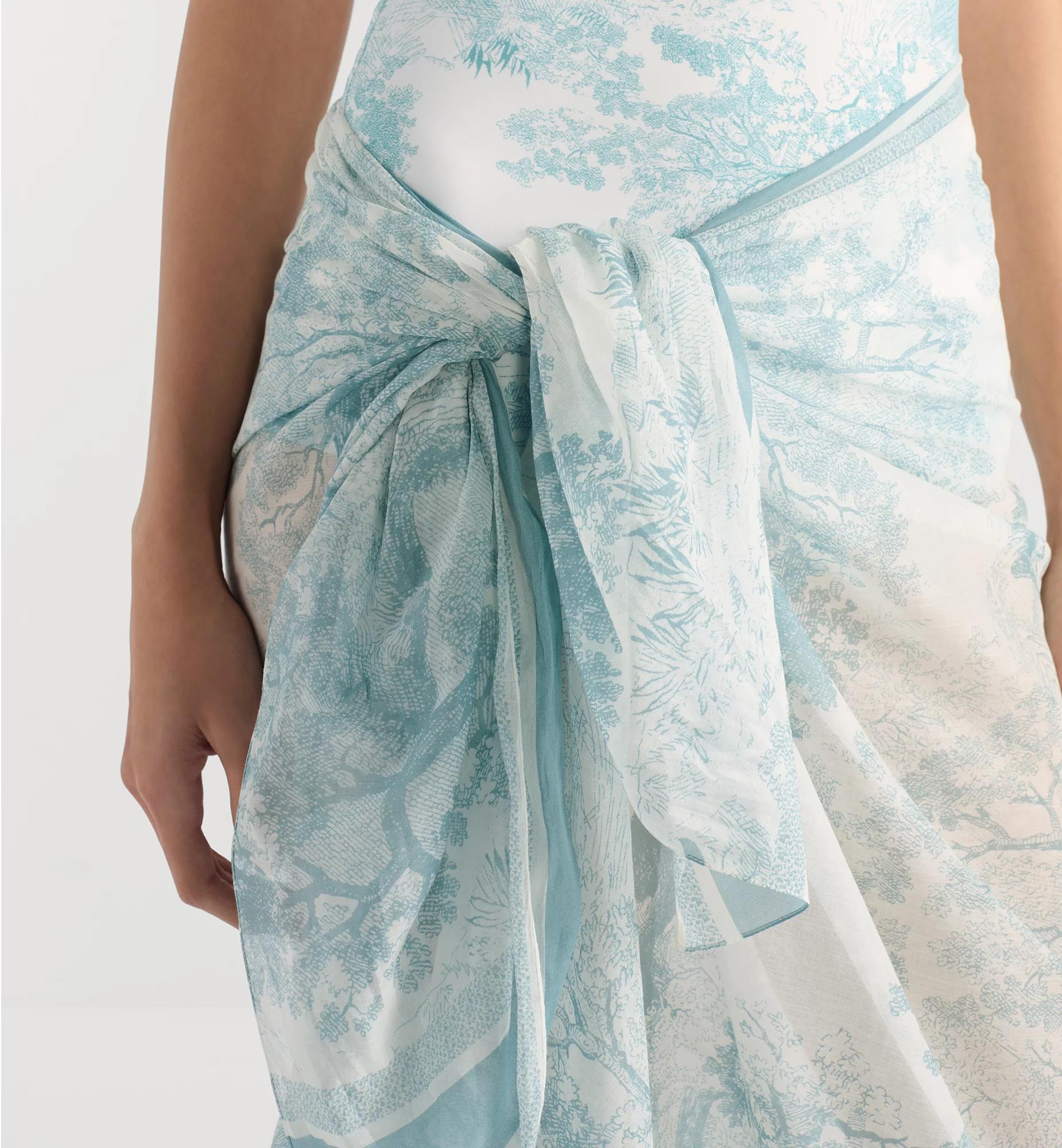 Part of the Dioriviera capsule, the sarong showcases the Toile de Jouy Sauvage print in a new take on the hallmark House motif. Crafted in white and turquoise cotton, the design features rolled edges and is enhanced by a contrasting Christian Dior signature band. The piece can be tied around the neck, worn over the shoulders or as a sarong, and it will pair well with other Dioriviera creations. White and turquoise Toile de Jouy Sauvage print. Contrasting band with Christian Dior signature. Rolled edges. 100% cotton. Made in Italy