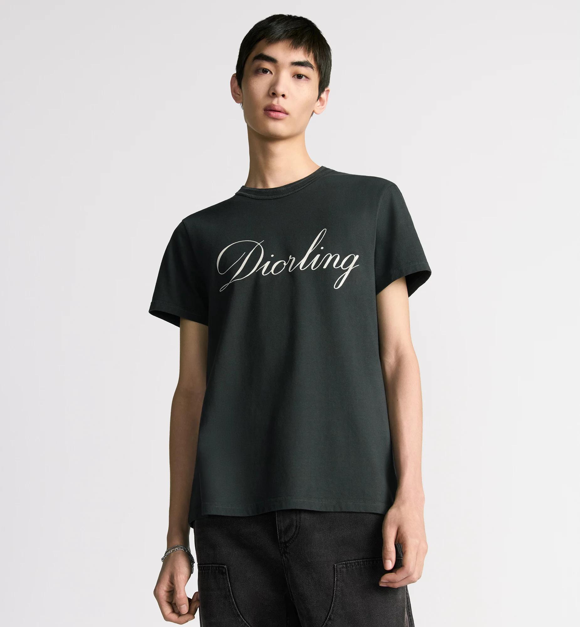 New for Winter 2025, the T-shirt celebrates Dior heritage with the Diorling flocked print, inspired by House archives. Crafted in gray cotton jersey, it features a ribbed crew neck. Its regular fit will pair just as easily with pants as carpenter jeans. Diorling flocked print on the chest. Ribbed crew neck. 100% cotton. Made in Italy