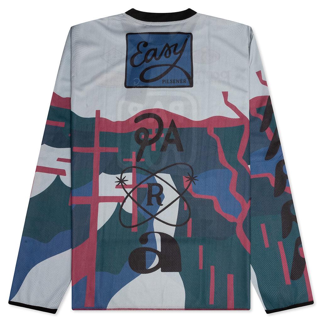 By Parra merges artful personality with a sporty silhouette. Crafted from polyester mesh for an airy feel, this shirt features a round neckline, contrasting lockstitch hem, and elastic piping on the sleeves. Showcased all over the ensemble are sublimated printed patterns and By Parra graphics. 100% Polyester Mesh Sublimation printed graphics Round neckline Woven label on front Lockstitch hem Elastic piping on sleeves Style No: 54135 GREY