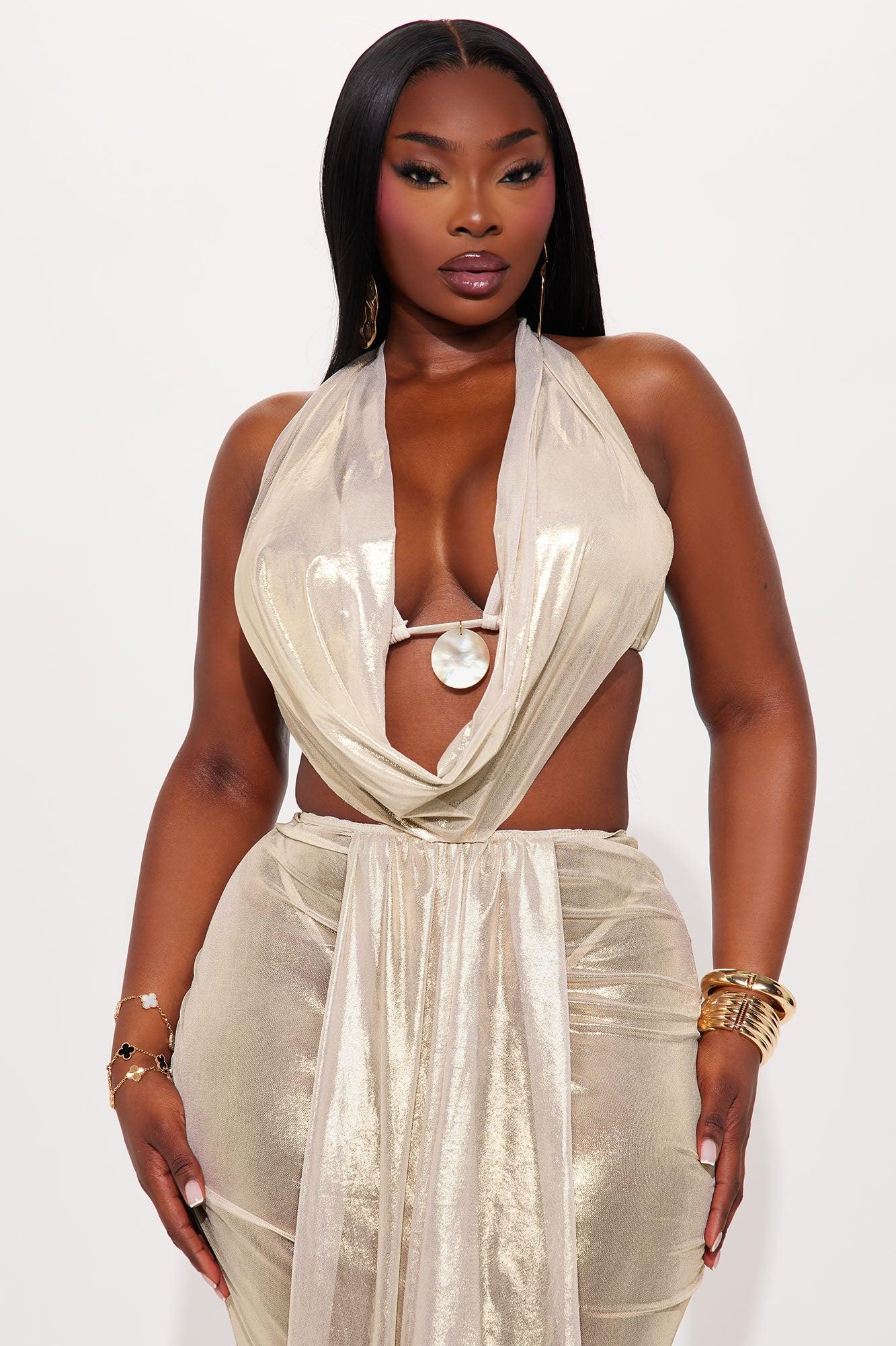 Available In White. 3 Piece Bikini Set Triangle Bikini Top Removable Cups Seashell Charm Bikini Bottom Cheeky Matching Swim Cover Up Skirt Ruching Detail Maxi Full Stretch Final Sale Shell: 94% Polyester 6% Spandex Lining: 95% Polyester 5% Spandex Imported California Proposition 65WARNING: Cancer and Reproductive Harm - www.P65Warnings.ca.gov.