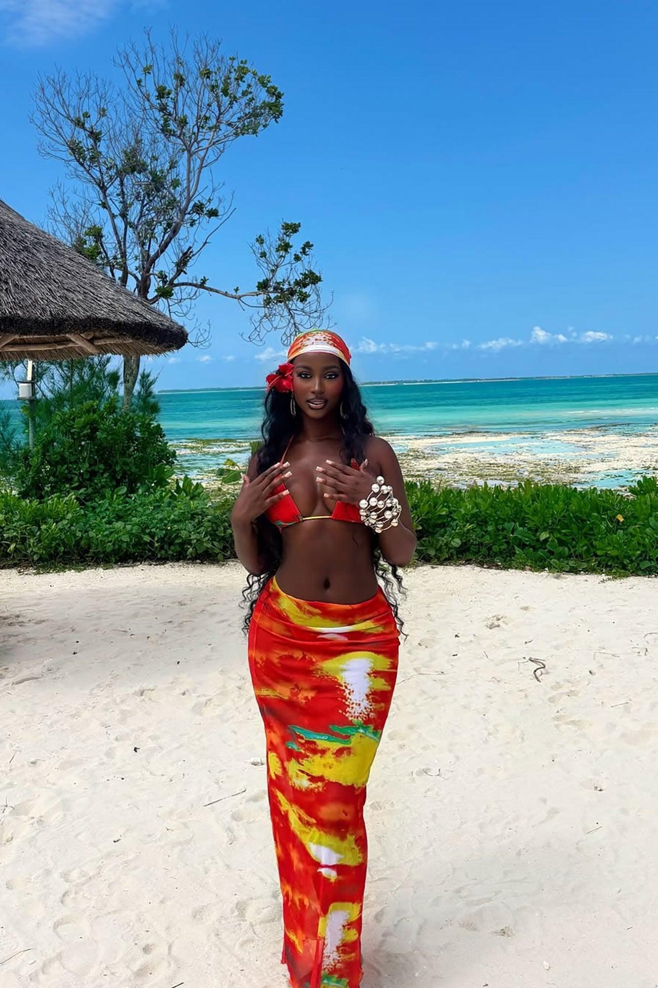 Available In Red/combo. 4 Piece Bikini Set Triangle Bikini Top Removable Cups Side Tie Bikini Bottom Cheeky Printed Mesh Maxi Matching Swim Cover Up Skirt Headscarf Included Full Stretch Final Sale Disclaimer: Print Placement May Vary Shell: 85% Polyester 15% Spandex Lining: 92% Polyester 8% Spandex Cover Up / Headscarf: 90% Polyester 10% Spandex Imported California Proposition 65WARNING: Cancer and Reproductive Harm - www.P65Warnings.ca.gov.