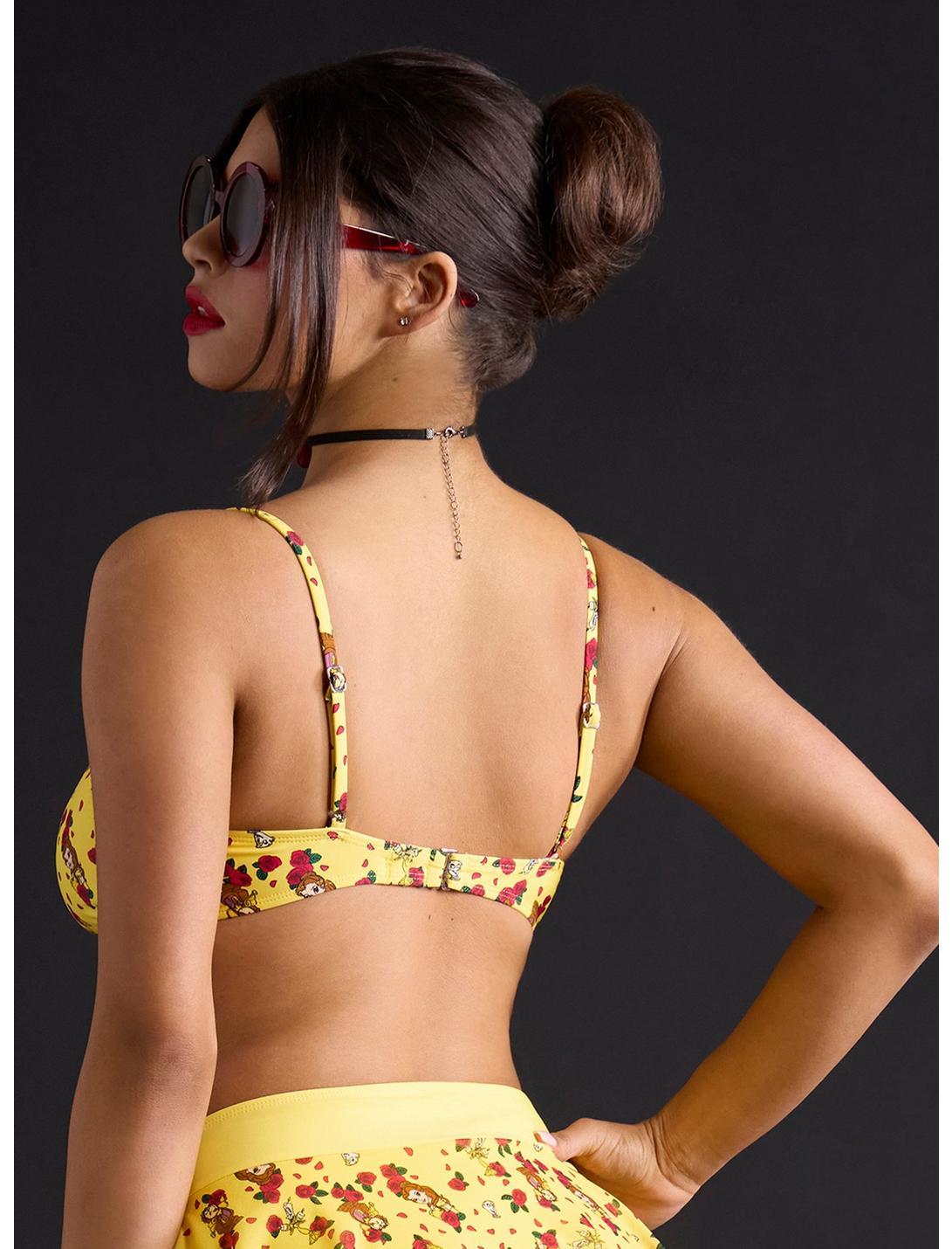 Escape your provincial town for a swim day! This Beauty and the Beast swim top features an allover print of roses, Belle and the enchanted objects. Designed with ruching at the center chest and a hook and loop on the back. Comes with removable padding. Pair it with the matching bottoms for a royal beach day vibe!Bottoms not included.Swimwear can only be returned unworn with original tags intact and sanitary panel in place.82% nylon; 18% spandexHand wash cold; dry flatImportedListed in junior sizesModel wears size Small