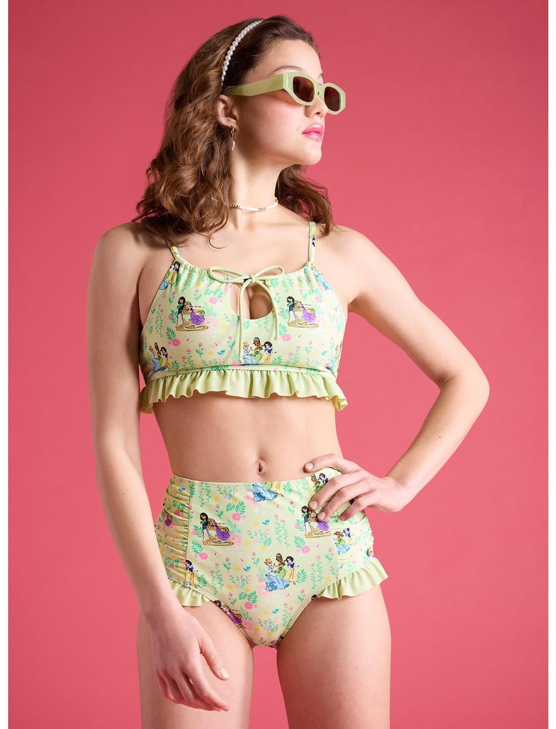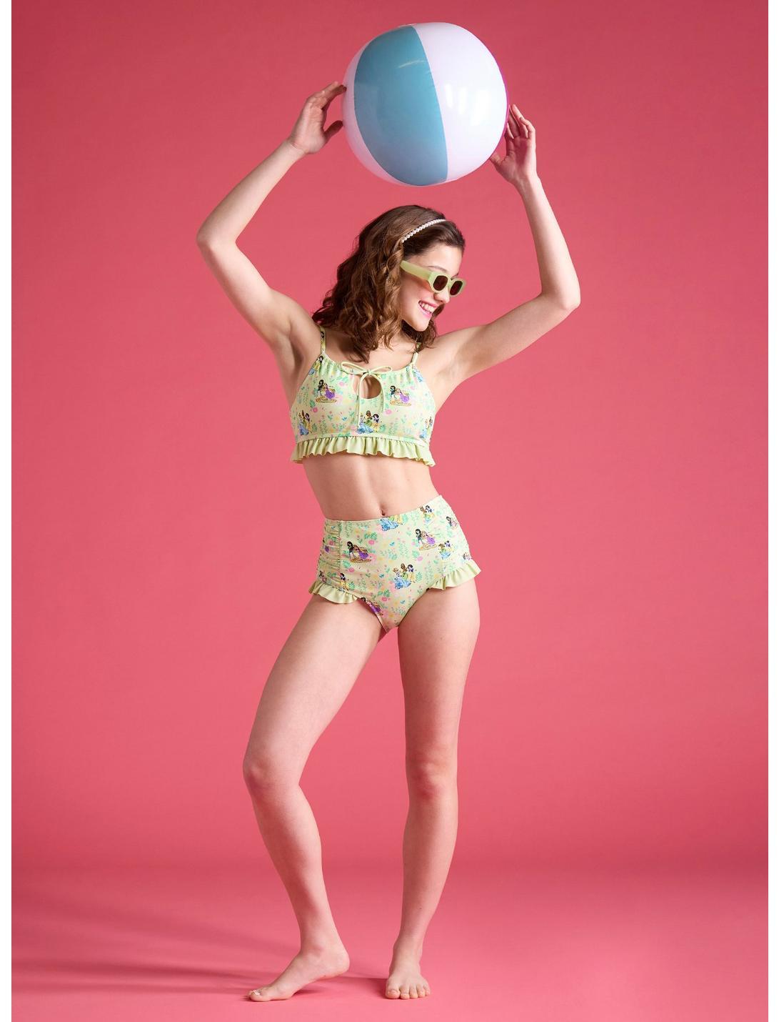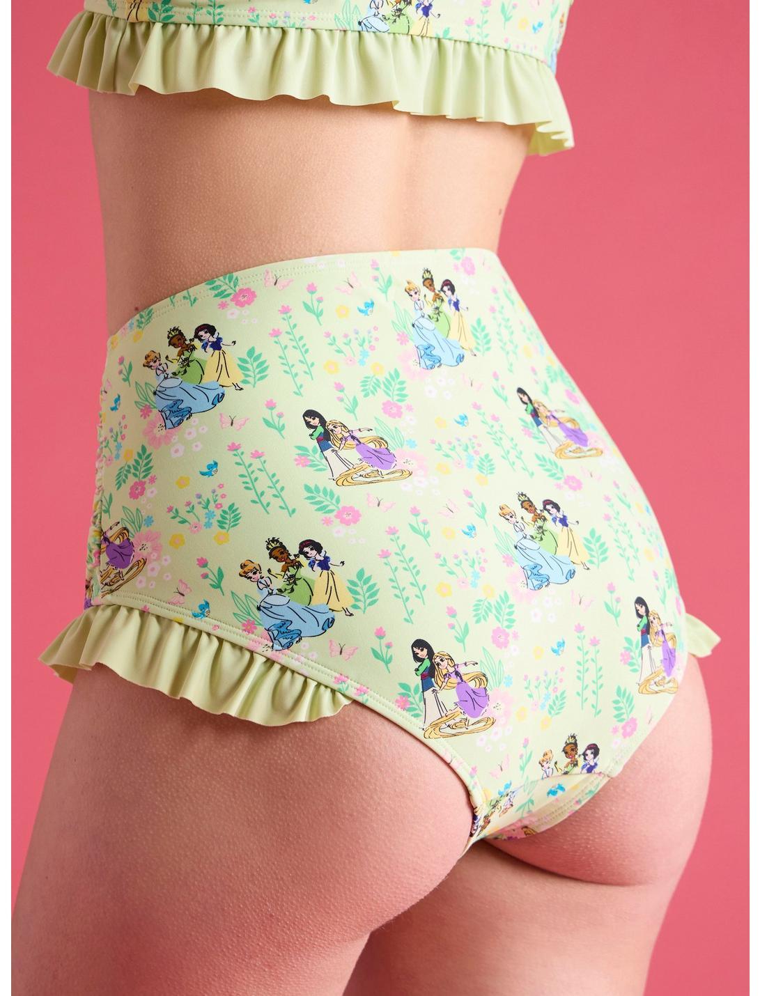 Rule the pool like true royalty! These high-waisted swim bottoms feature an allover print of Disney Princesses and floral accents. Designed with a ruffle trim and ruching on the sides. Pair them with the matching top for the ultimate beach day vibe!Top not included.Swimwear can only be returned unworn with original tags intact and sanitary panel in place.82% nylon; 18% spandexHand wash cold; dry flatImportedListed in junior sizesModel wears size Small