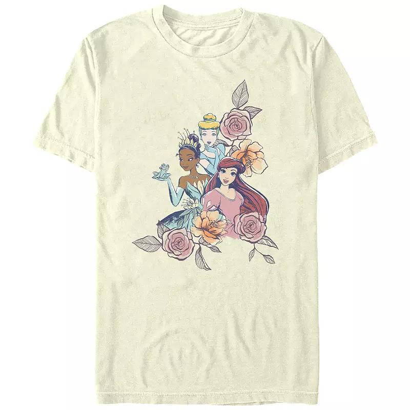 Dress with royal flair in this Disney Princesses Juniors' Floral Motif Boyfriend Graphic Tee. © Disney Dress with royal flair in this Disney Princesses Juniors' Floral Motif Boyfriend Graphic Tee. © Disney FEATURES Short sleeves CrewneckFABRIC & CARE Cotton Machine wash Imported Size: Medium. Color: Natural. Gender: female. Age Group: adult.