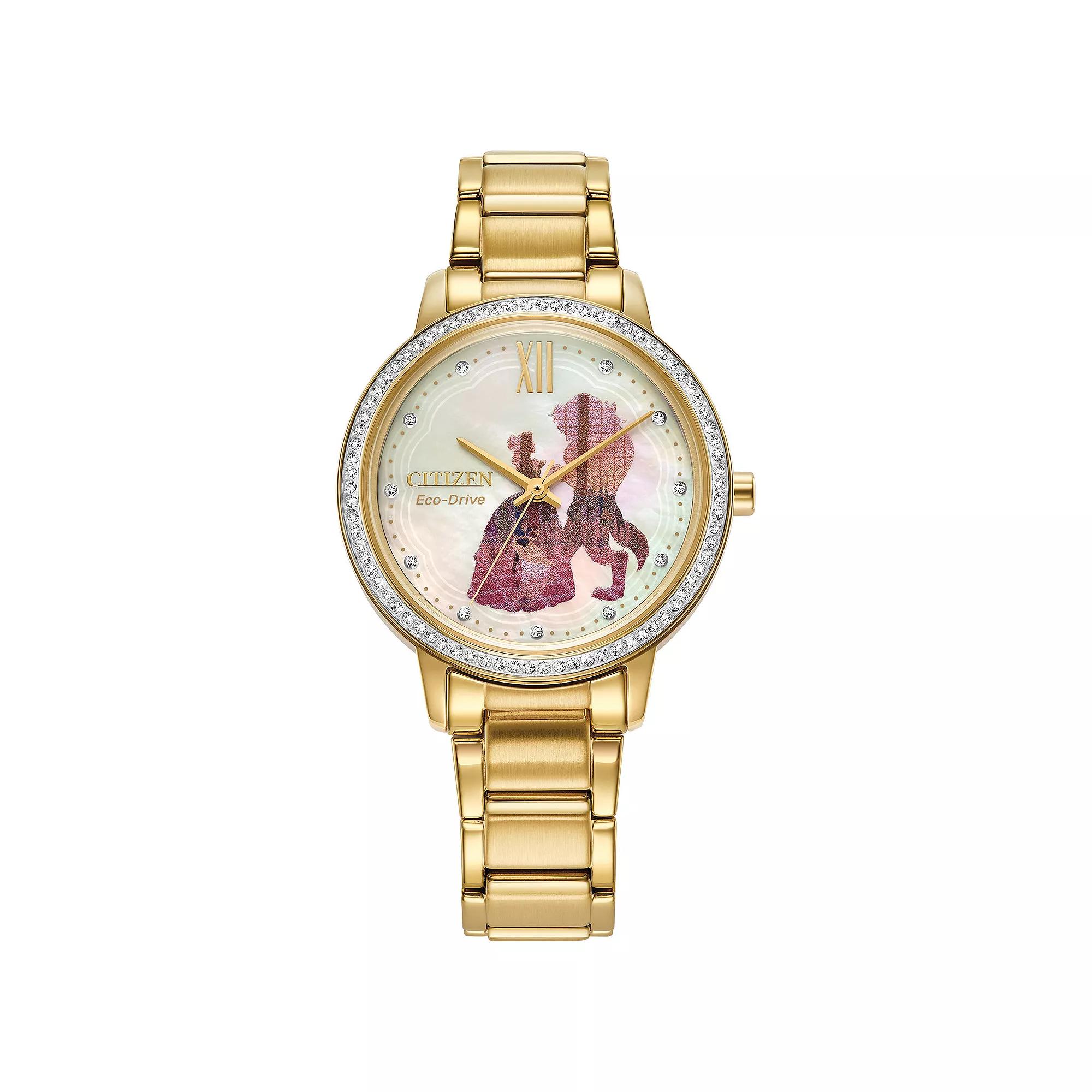 From Citizen, the Citizen Womens Disney Collection Belle & Beast Three Hand Gold Stainless Steel Bracelet Watch and Pin Set features:Gold-tone stainless steel case and braceletSpherical mineral crystal mother of pearl dial89 crystal accents Fold over clasp with push buttonsThree-hand movementCase size approx. 36mm Water resistance: 5ATMImported.