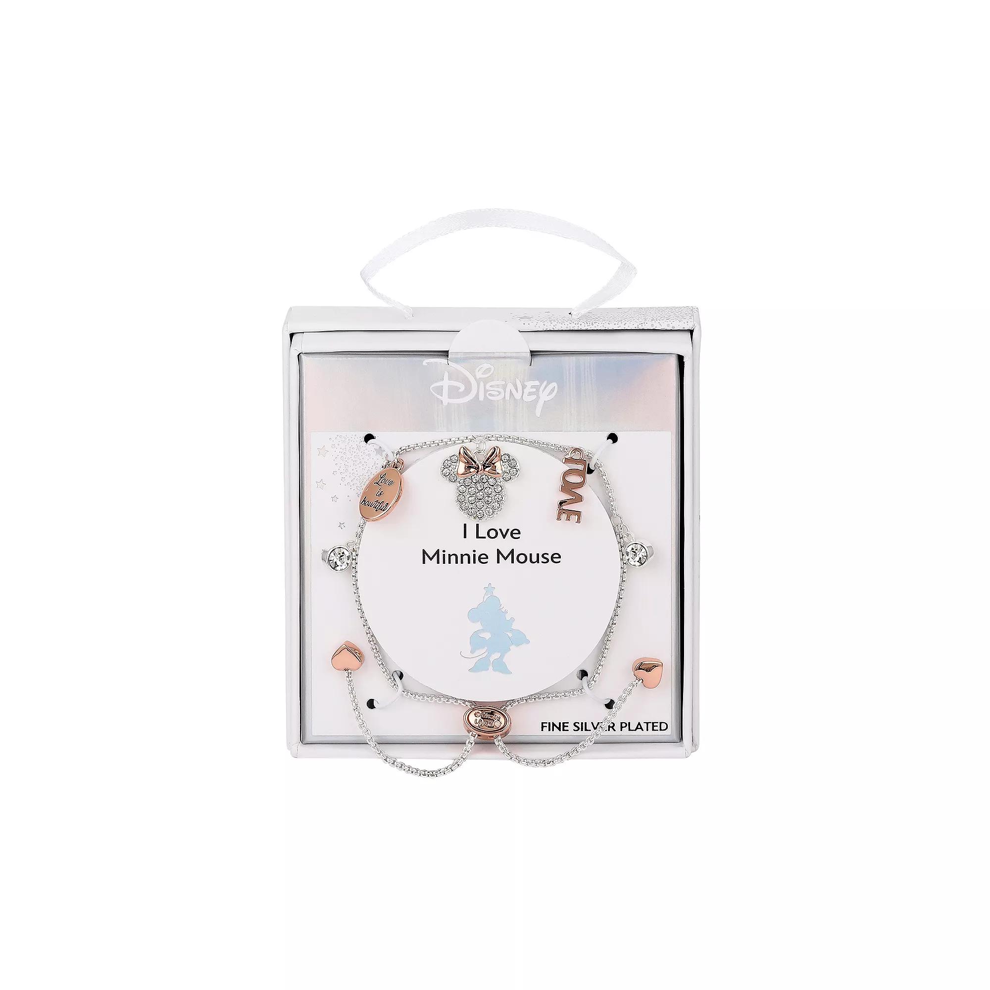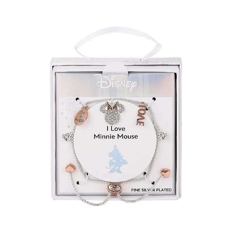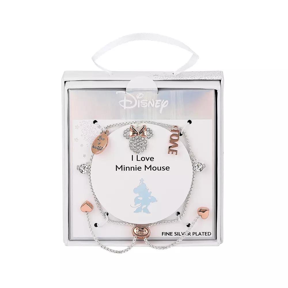 The fun design of this Minnie Mouse bracelet makes it a must-have for any Disney fan. Disney Click on this JEWELRY & WATCHES GUIDE to learn about fit, styles, materials and more! The fun design of this Minnie Mouse bracelet makes it a must-have for any Disney fan. Disney Click on this JEWELRY & WATCHES GUIDE to learn about fit, styles, materials and more! FEATURES Length: 9.75 in. Clasp: slider Nickel free Metal: brass Plating: 14k rose gold flash plated, fine silver Finish: polished Love is Bowtiful, Love Packaging: boxed ImportedSTONE DETAILS Stone type: crystal 4 mm Shape: round Setting: glue, epoxy Size: 5-9 ADJ. Gender: female. Age Group: adult.