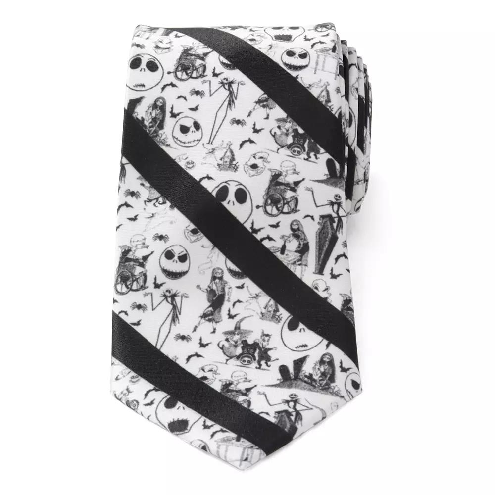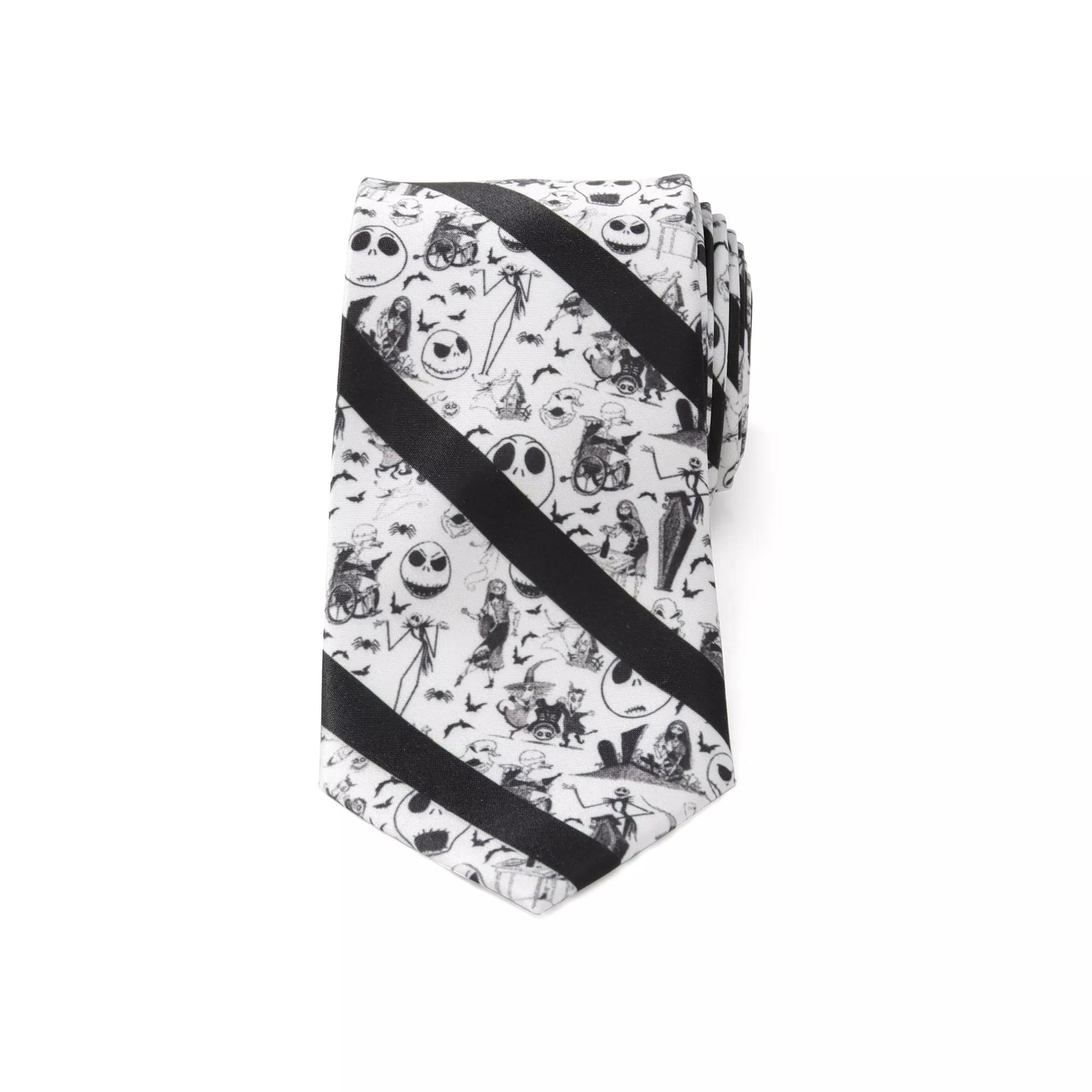 Perfect for Halloween, Christmas, or just the lover of everything spooky, this Nightmare Before Christmas tie will have you festive and frightening at the same time. From Jack Skellington all the way down to Oogie Boogie, this black striped tie is printed with recognizable scenes and symbols from the film. You'll be dying to wear it for any occasion. Officially licensed by Disney. | Disney Men's Nightmare Before Christmas Stripe Black Tie, White