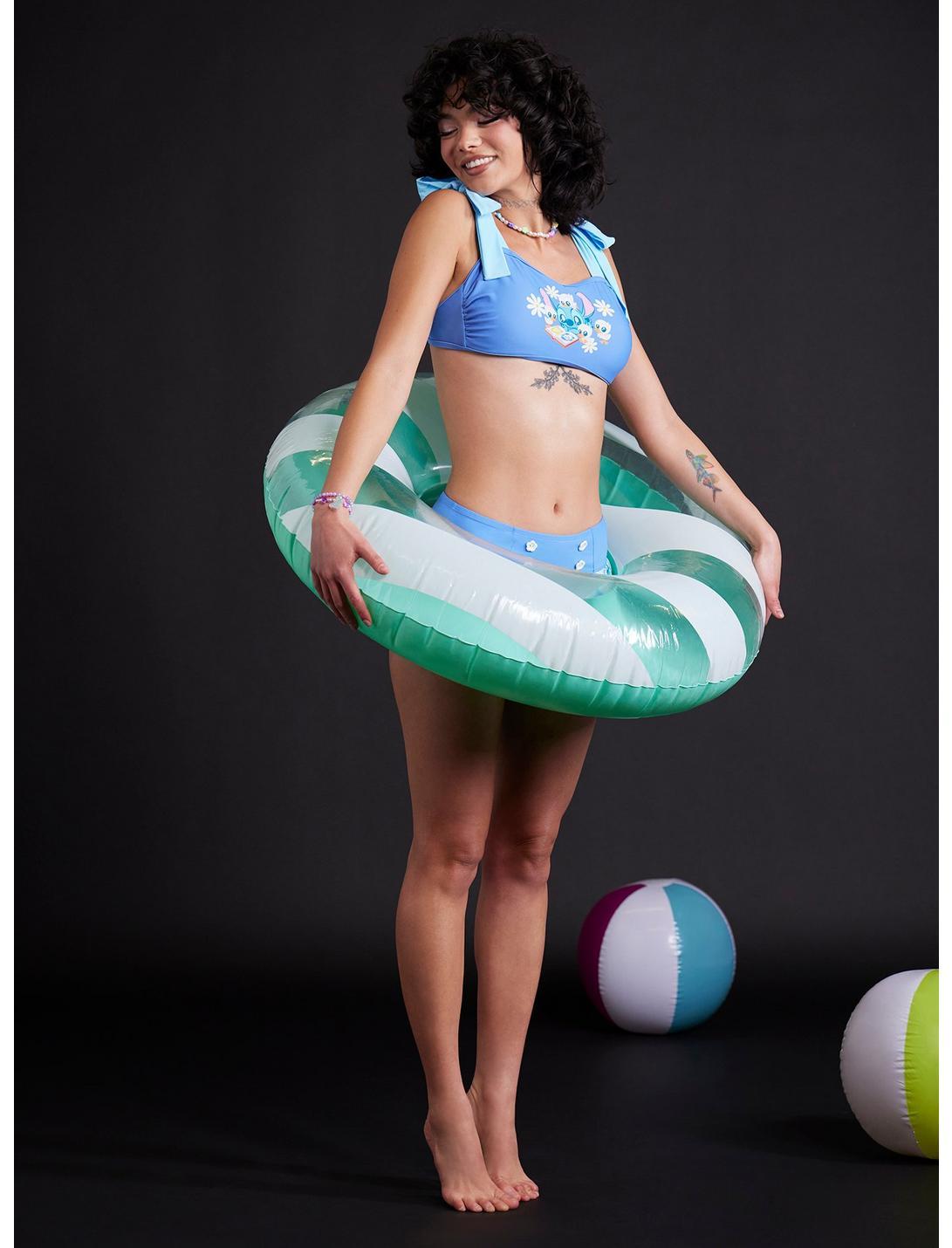 Catch some waves with your ohana in this supercute swim top! Featuring an adorable image of Stitch reading a story to ducklings, surrounded by flowers. Designed with light blue shoulder tie straps and a back tie. Comes with removable padding. Pair it with the matching bottoms for the ultimate beach day vibe!Bottoms not included.Swimwear can only be returned unworn with original tags intact and sanitary panel in place.82% nylon; 18% spandexHand wash cold; dry flatRemovable paddingImportedListed in junior sizesModel wears size Small