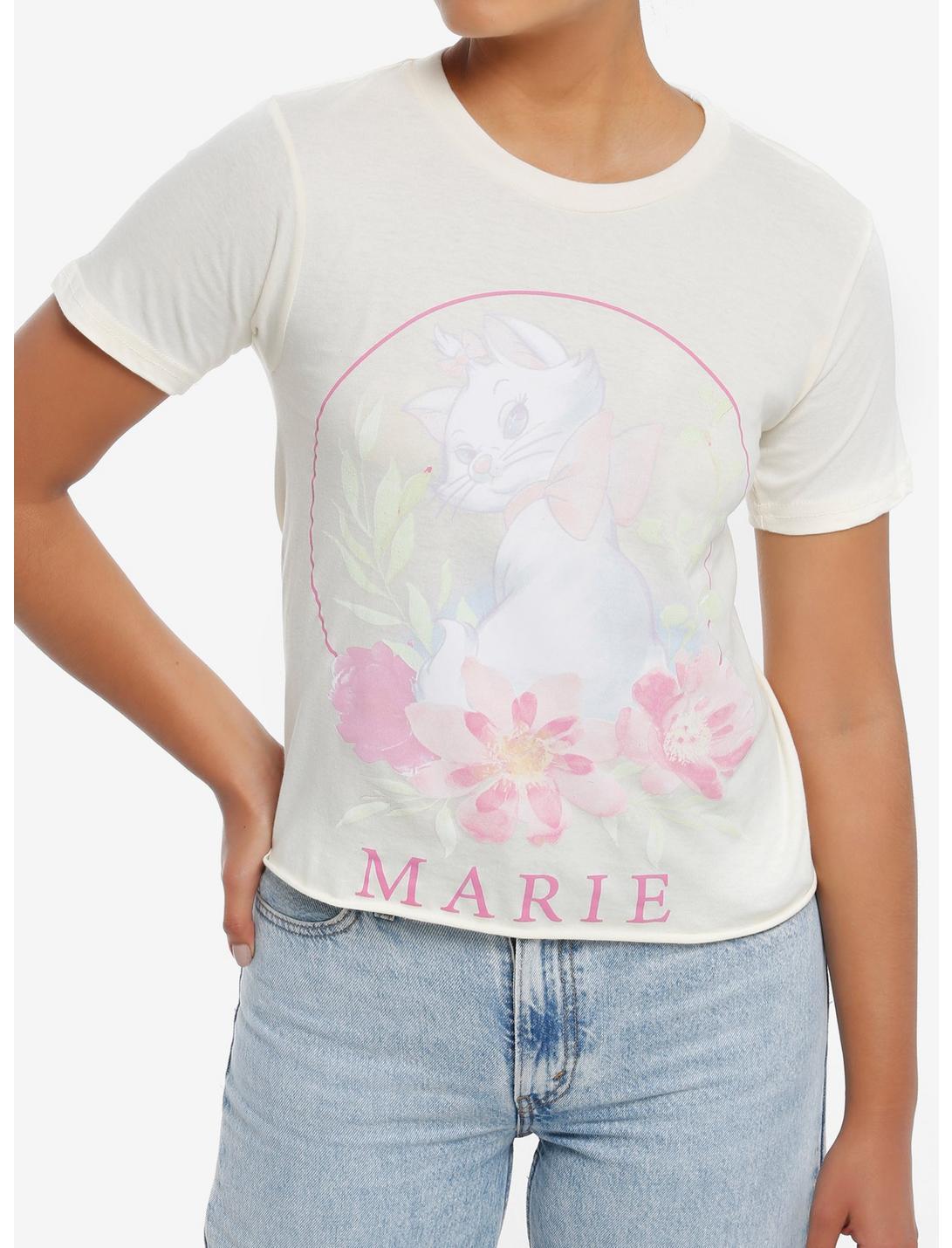 This cream-colored tee shows a light and delicate print of Marie from The Aristocats framed by flowers and her name appears in pink below. The tee has a raw bottom hem and slightly cropped fit.100% cottonWash cold; dry lowLength: 20 1/2"ImportedListed in junior sizesModel is 5'9"Model wears size Small