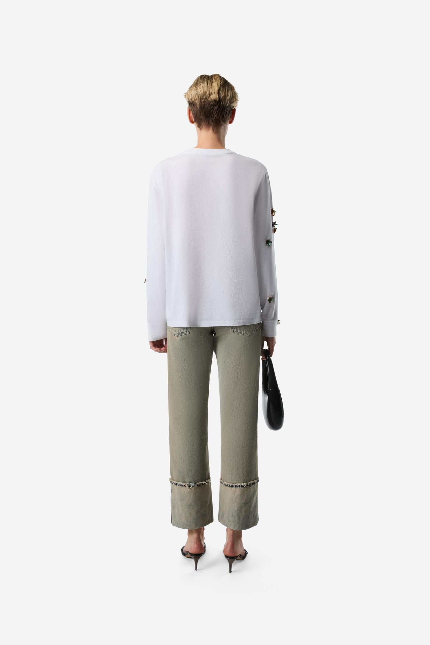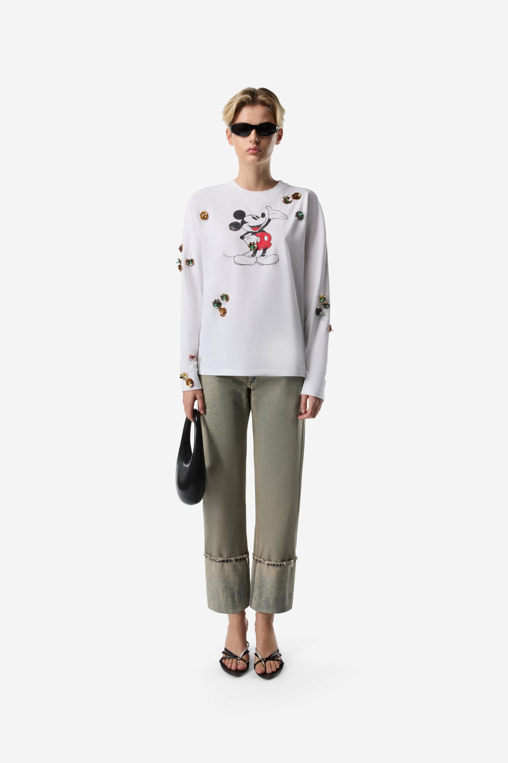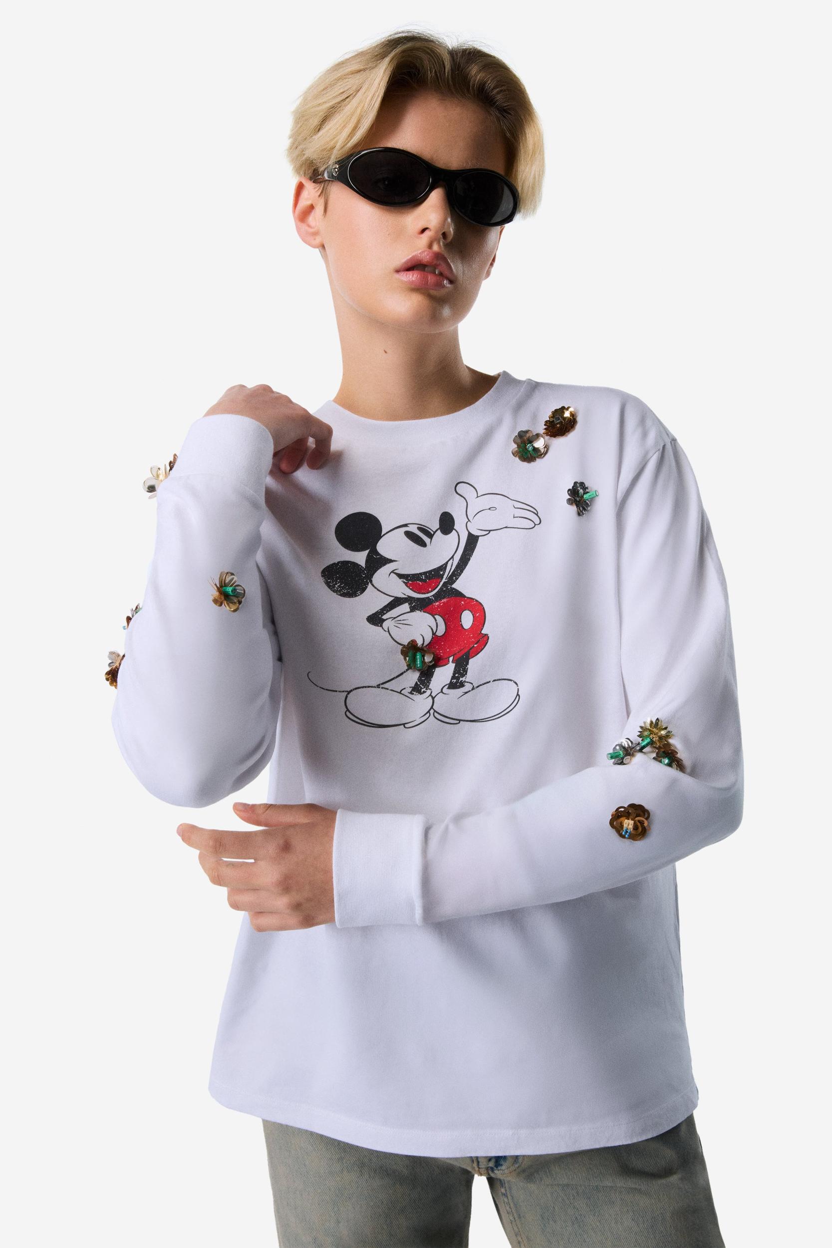 Mickey Mouse print long sleeve T-shirt Part of an exclusive collaboration, this long sleeve organic cotton T-shirt has a loose fit with a classic crew neckline. Decorated with a charming Mickey Mouse print, it also features intricate flower appliqués and clusters of colourful beads. DetailsWhite-Multicolour100% Organic CottonMade in PortugalSize and Fit