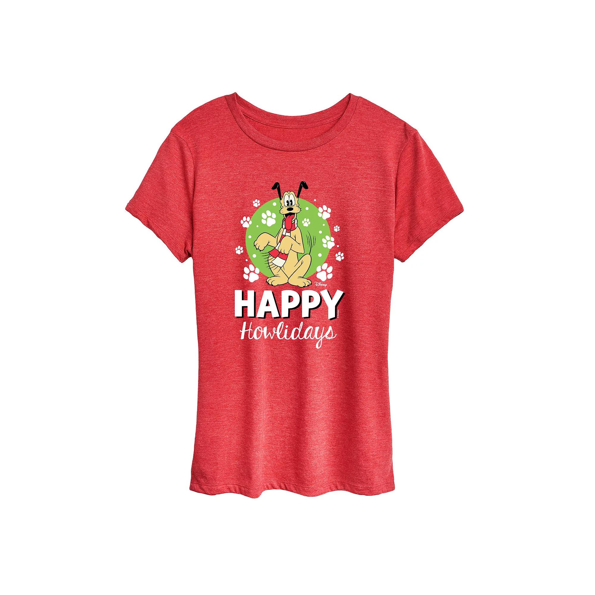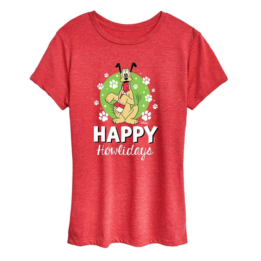Heather Red Disney Pluto Happy Howlidays Graphic Tee - Women. Short-sleeve tee featuring a classic crewneck and festive graphic.Full graphic text: Happy howlidays.Size S: 26 long from high point of shoulder to hemSize & fit: Relaxed-fit garment with a slightly longer hem. Fits true to size.50% cotton / 50% polyesterMachine wash; tumble dryImported, screen printed in the USA