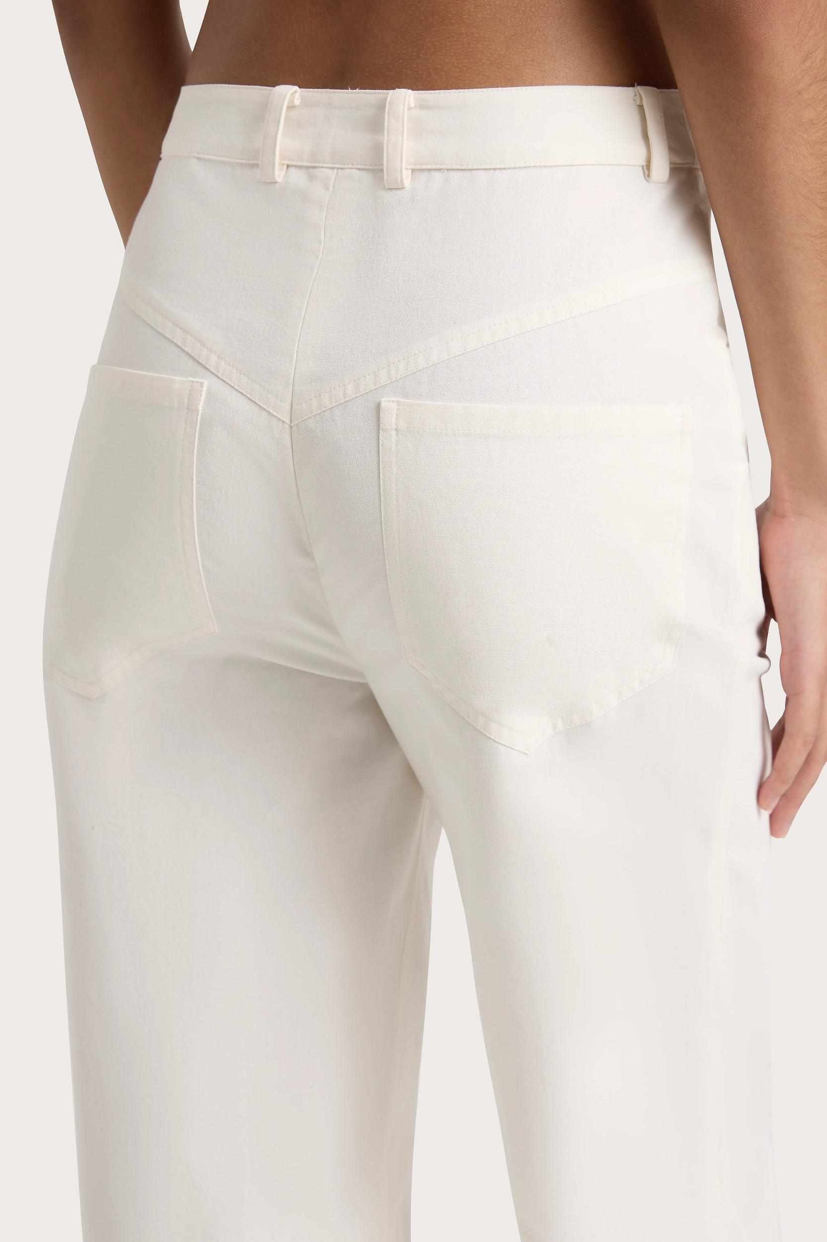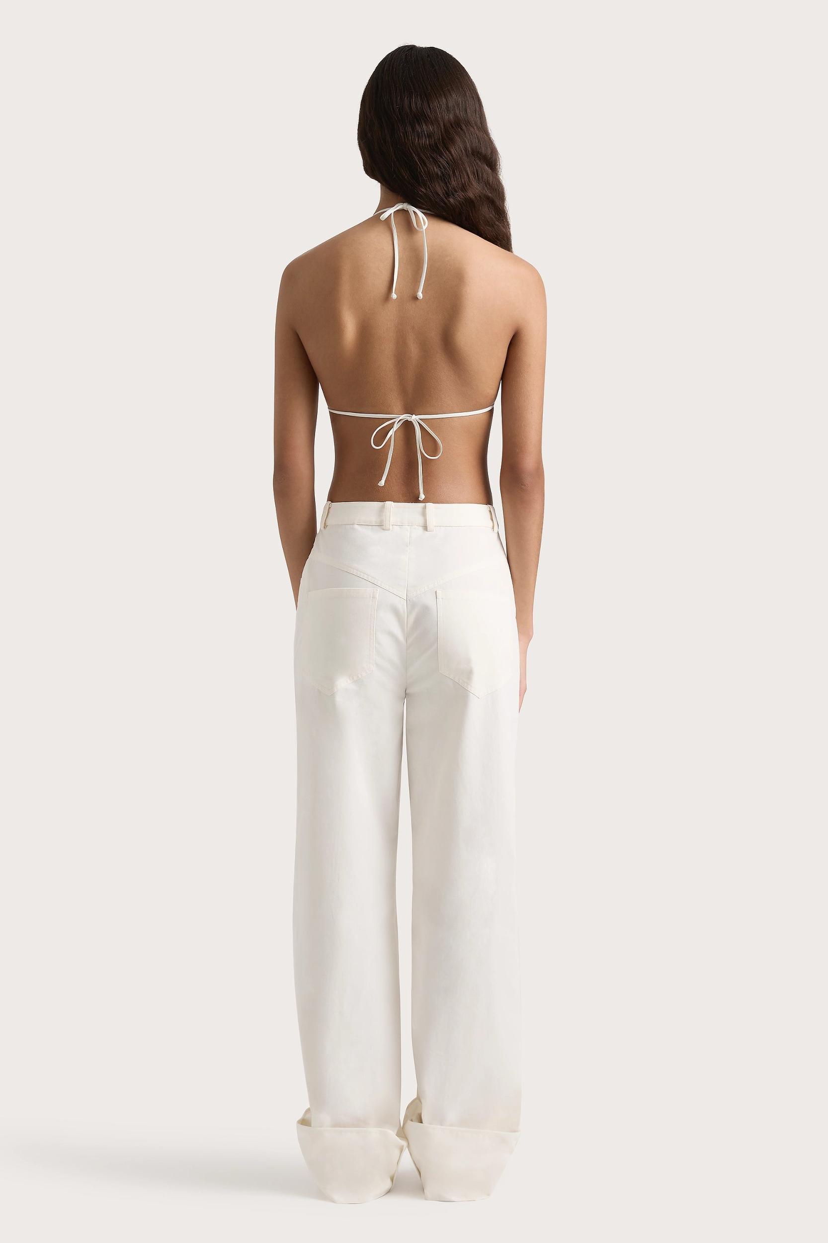 A classic everyday high-rise trouser that sits up at the waist with functional belt loops and side pockets, designed from 100% organic cotton in a crisp white. It has a straight, semi-fitted leg that is long in length but has a wide cuff detail at the hem, so can be cuffed as short as desired. Style with swim or a relaxed tee for summer wear. This style is true to size. Please note there is no elastic woven into the fabric so it does not offer any additional stretch. This trouser is long in length, however the wide cuff detail is designed to be cuffed according to height.