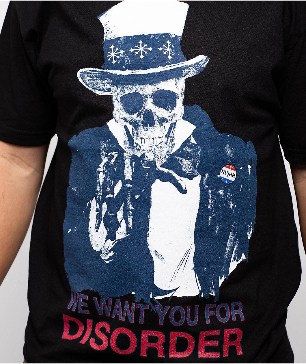 Available in a black colorway from Nyjah Huston's Disorder Skateboards, the We Want You t-shirt features a screen-printed graphic of Uncle Sam's skeleton on the front for a dark, political look. Acting as a recruitment poster, the image on the front