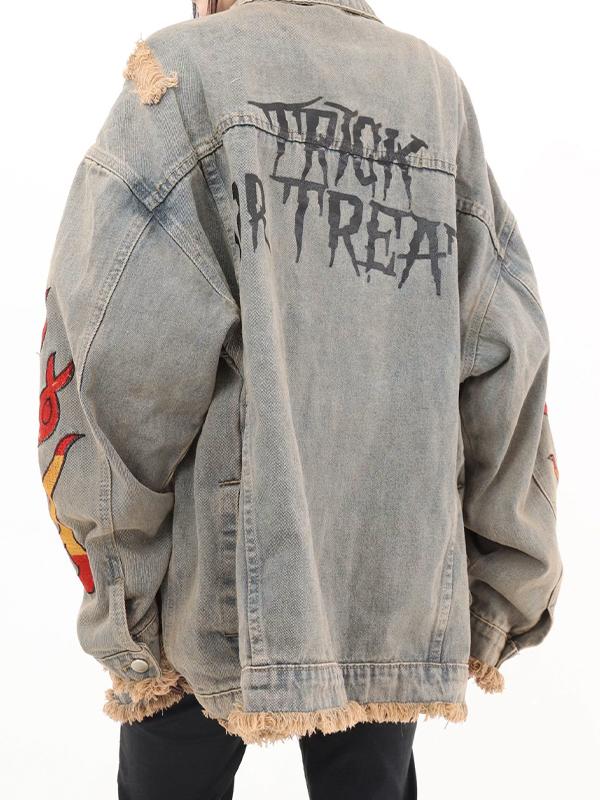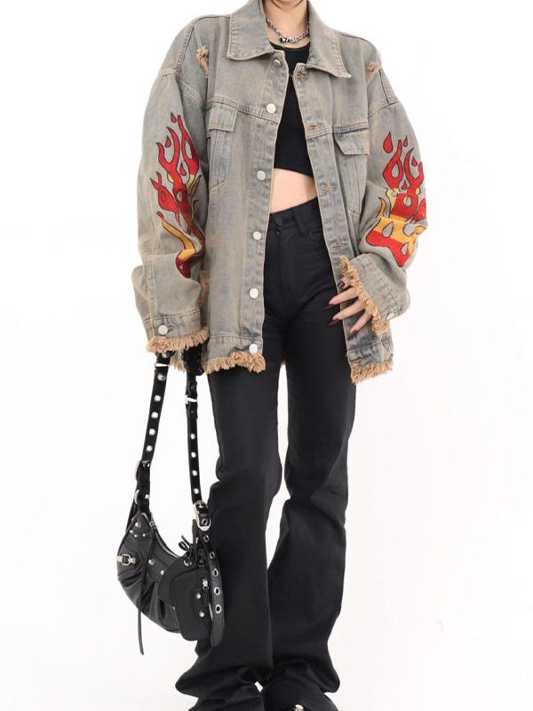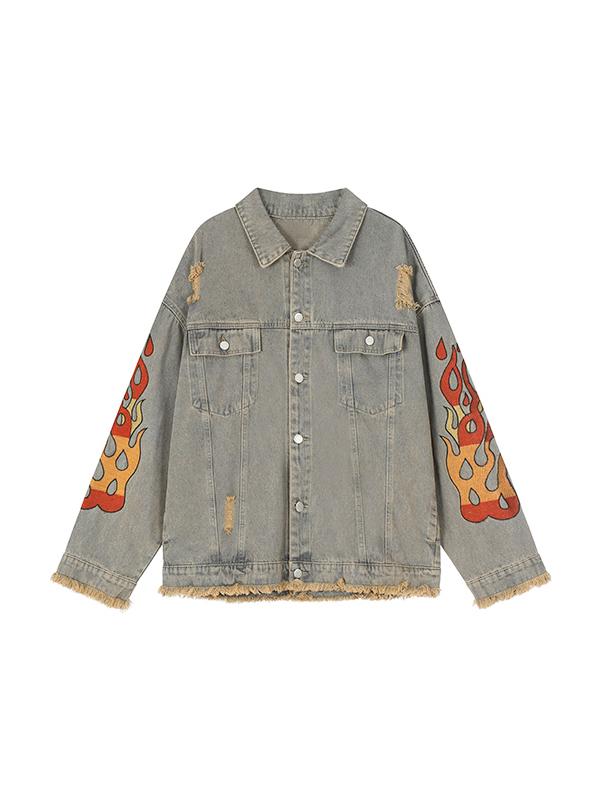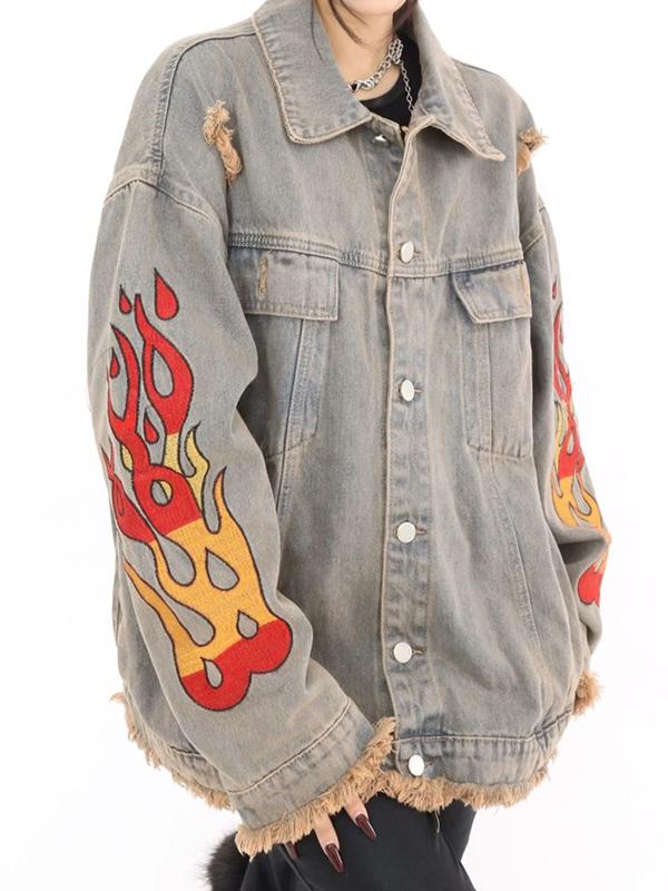 Distressed Flame Print Raw Edge Jacket