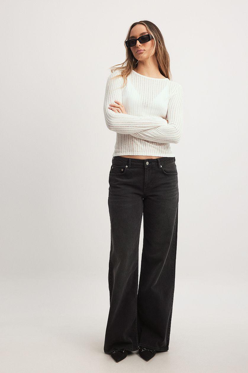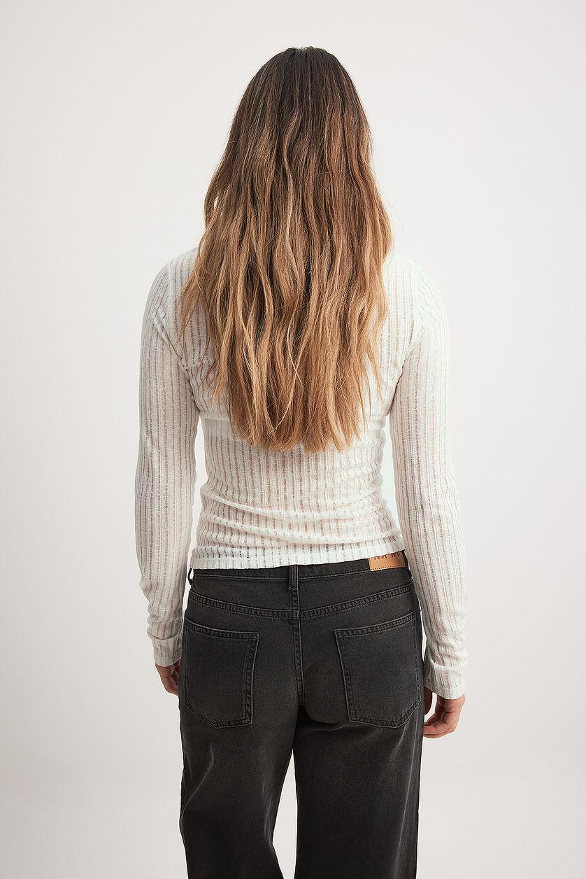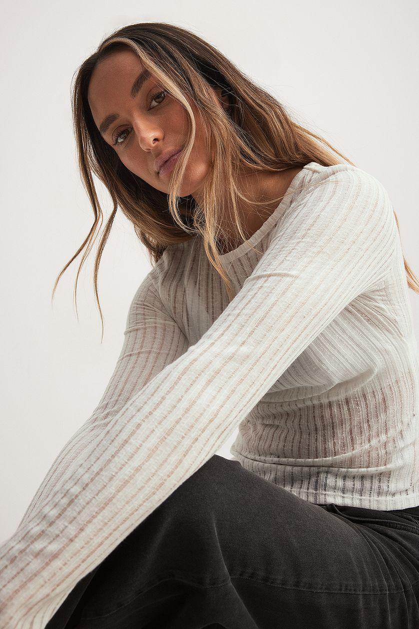 This long sleeve top features a relaxed form fit and a slightly stretchy sheer material with a distressed detail. It has a round neckline.
