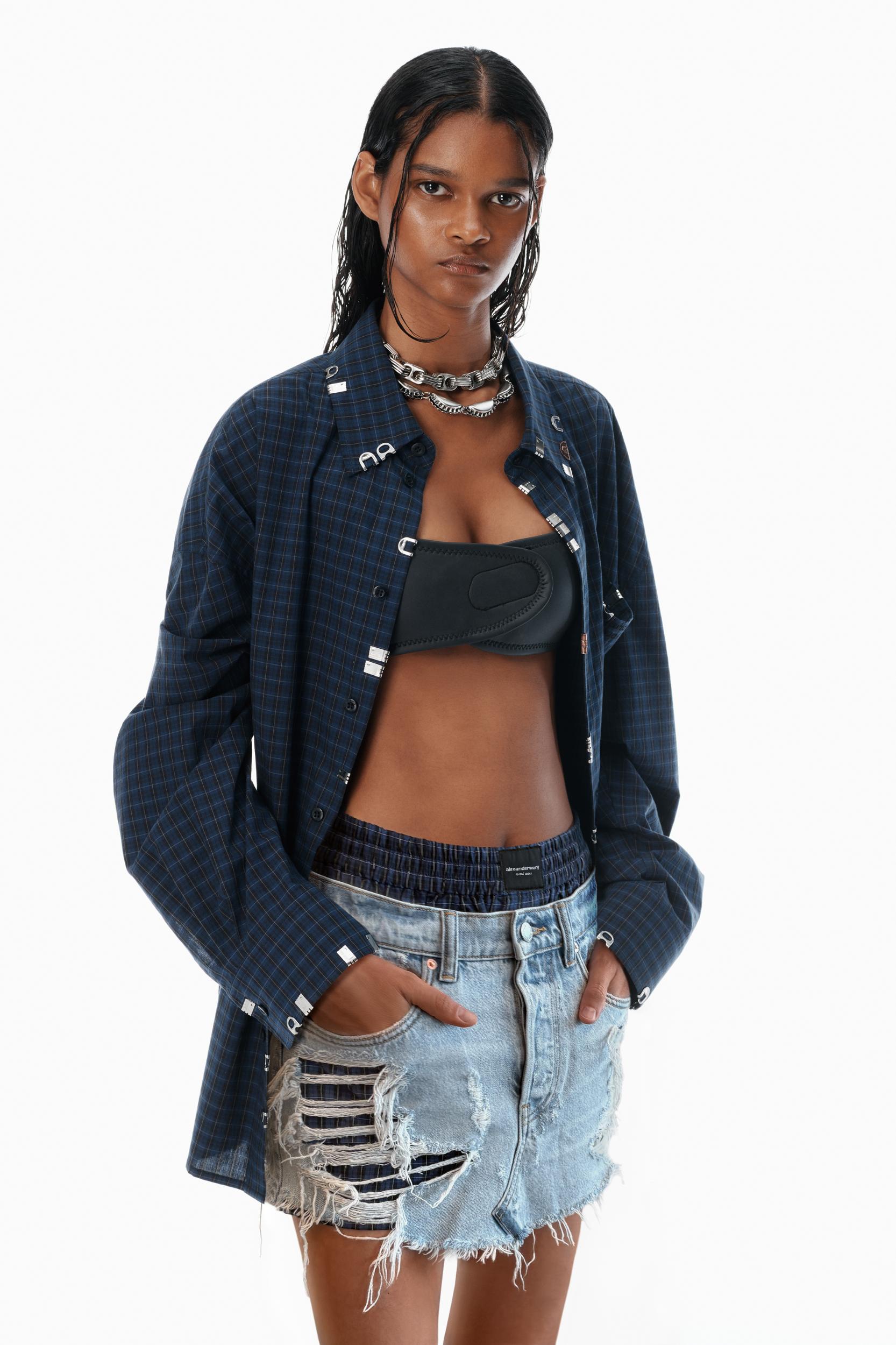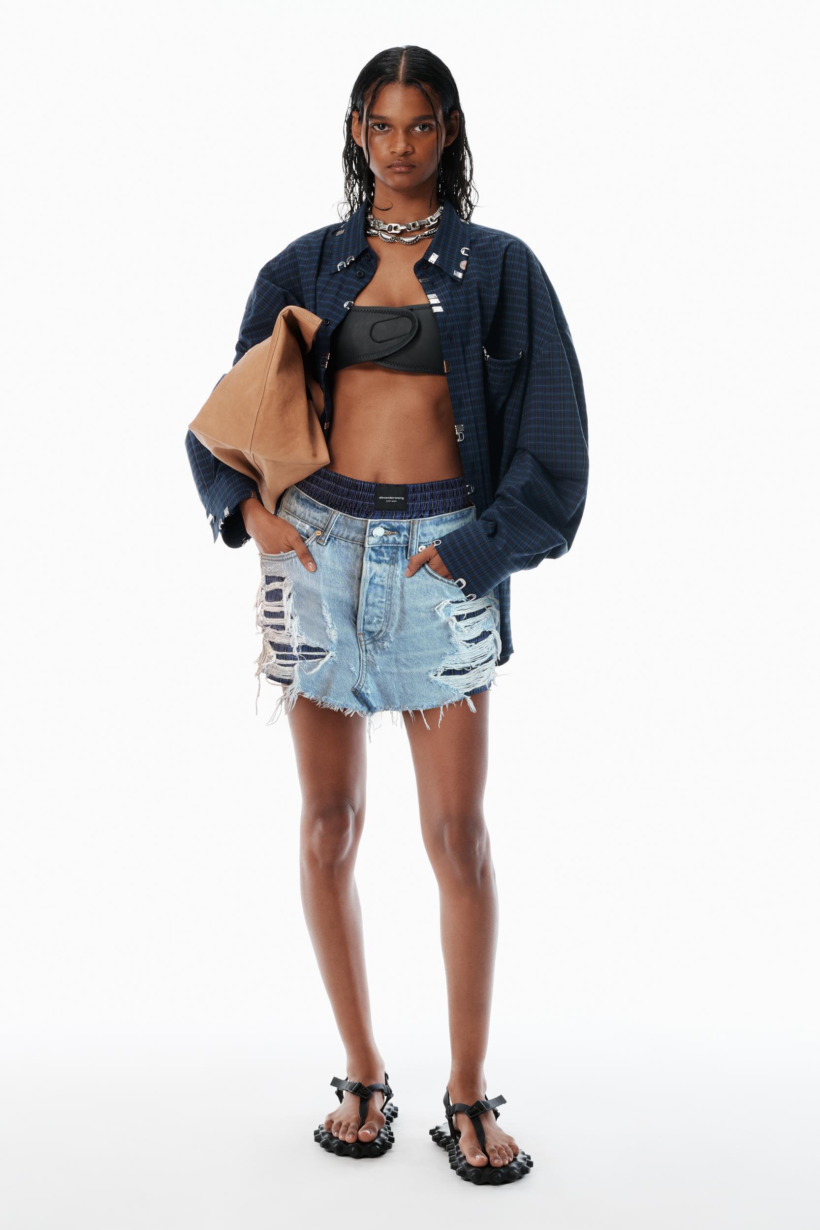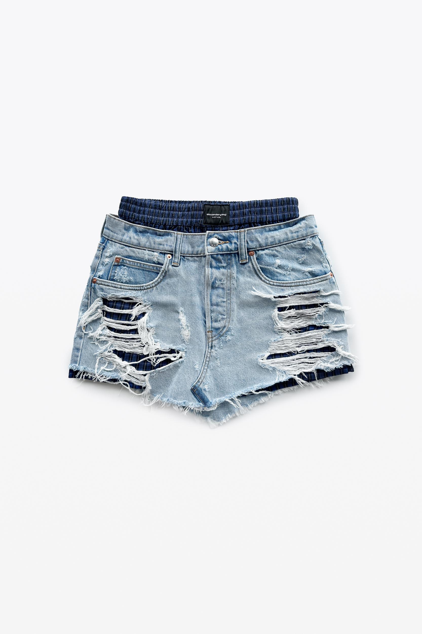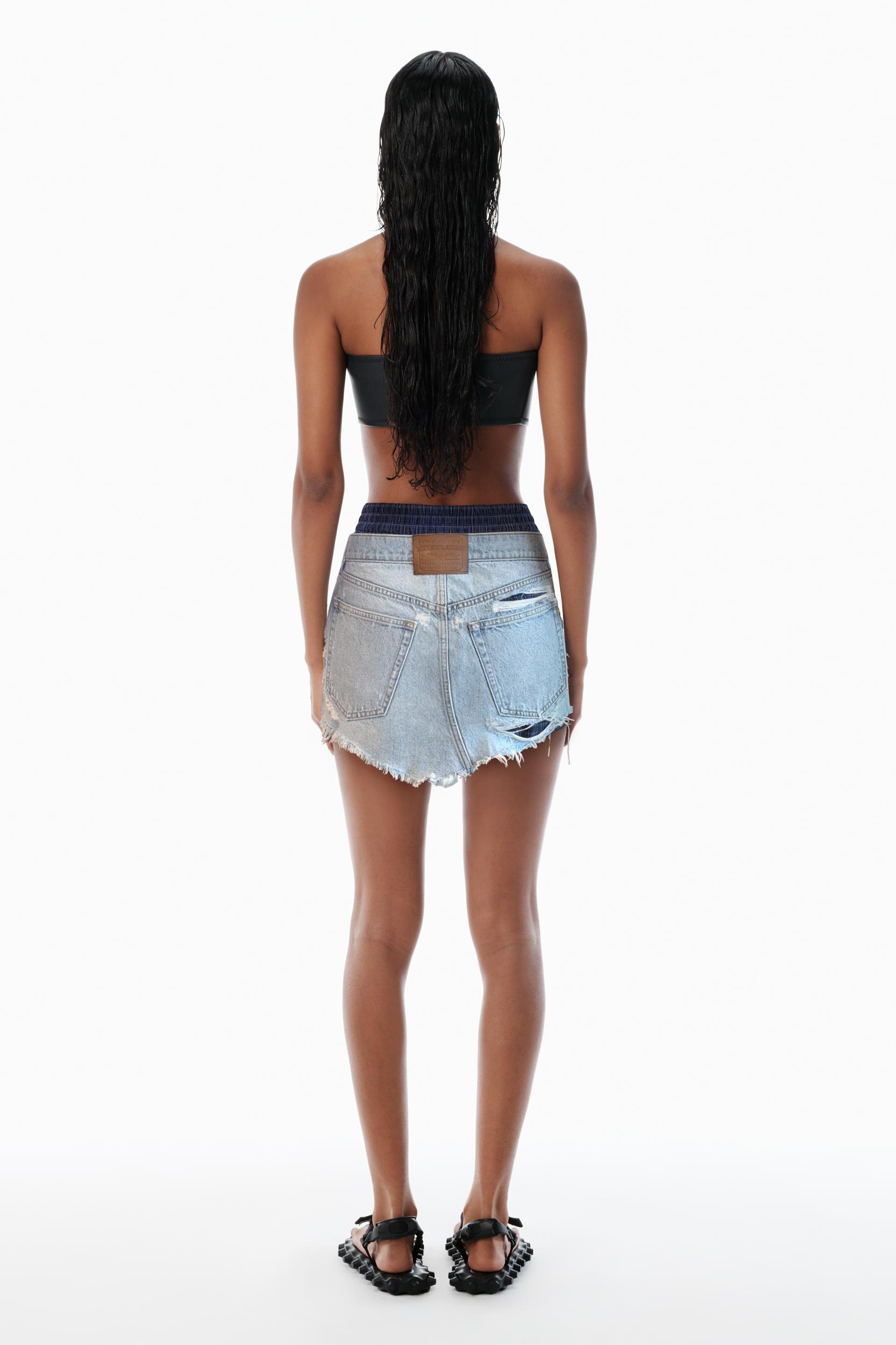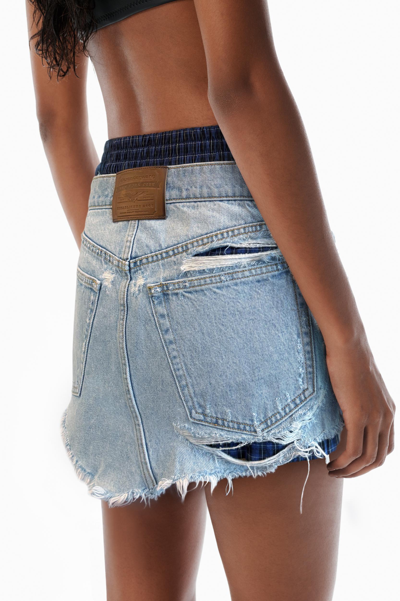 featuring hand-distressing along the throughout, this pre-styled denim skirt in a light bleach wash features a boxer-style waistband.