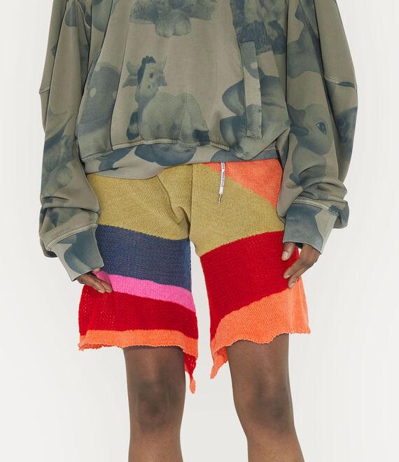 The Distressed shorts are offered in a cotton-mohair blend, featuring distressed stripes and net stitches - recalling the house's Punk aesthetic. The piece is receives a flared, asymmetrical wavy hem, complete with a ribbed waistband and an adjustable branded drawstring, embroidered with a multi-coloured orb on the hip.