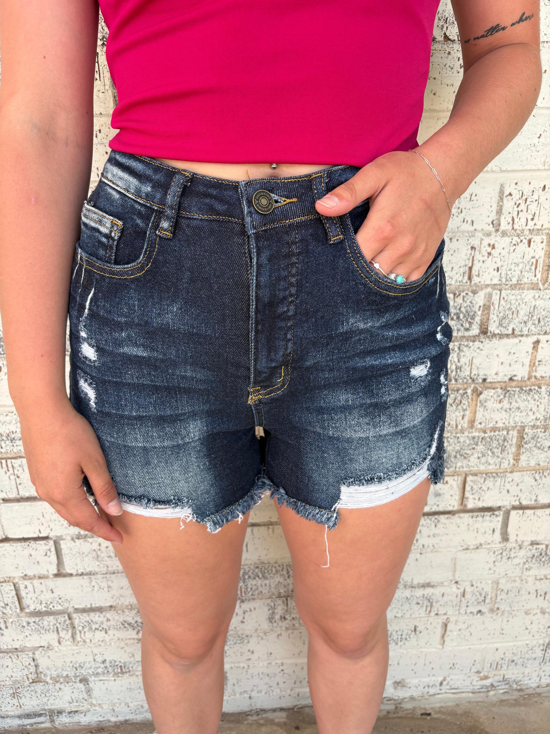 Distressed Tummy Control Denim Shorts - 2 Colors | Gussied Up Online Boutique Experience comfort and style with our Distressed Tummy Control Denim Shorts. Made from stretchy fabric, these high rise shorts offer a flattering tummy control feature. Available in light or dark denim, they add a touch of distressed detail to your look. Elevate your denim game with these must-have shorts.