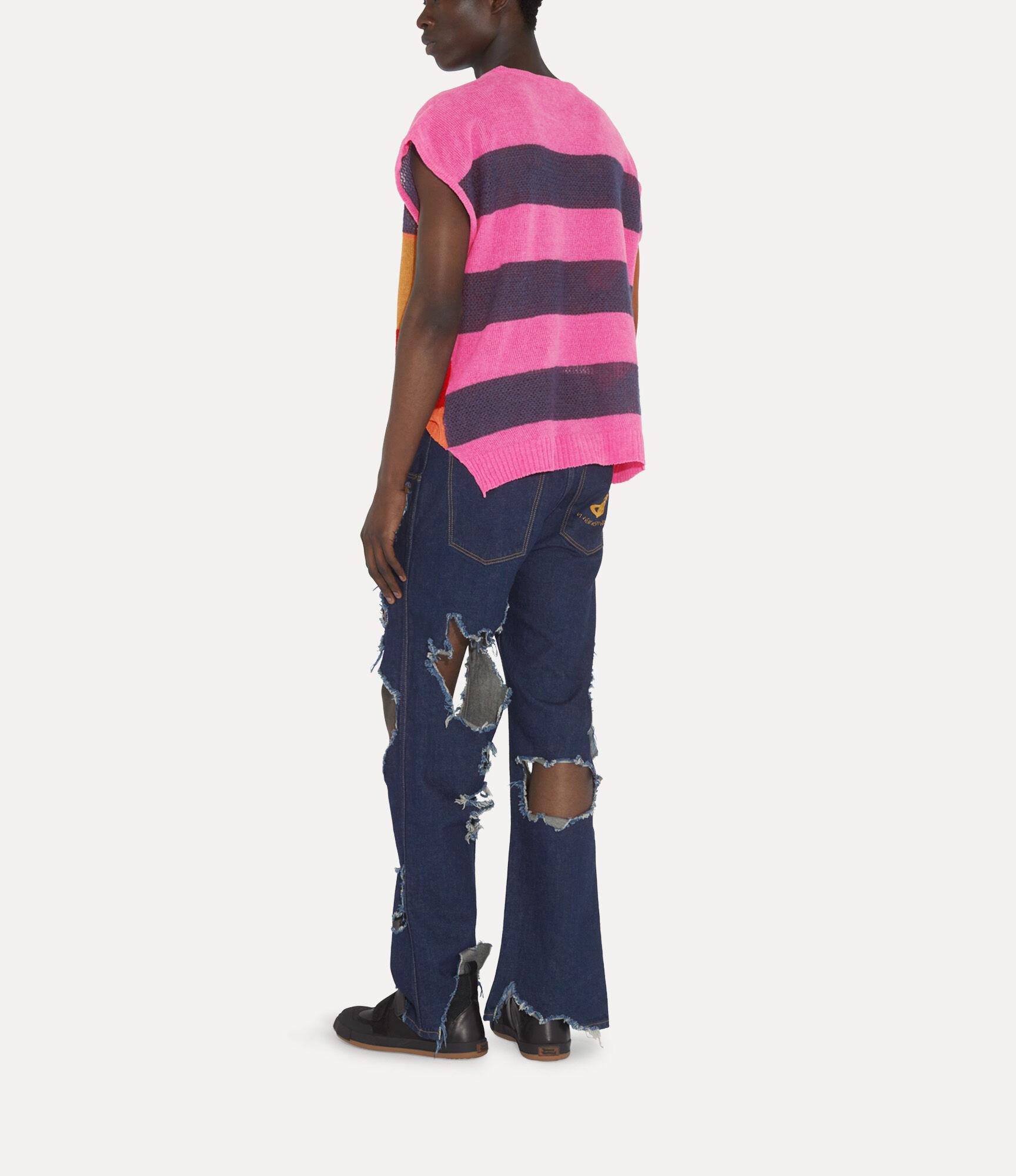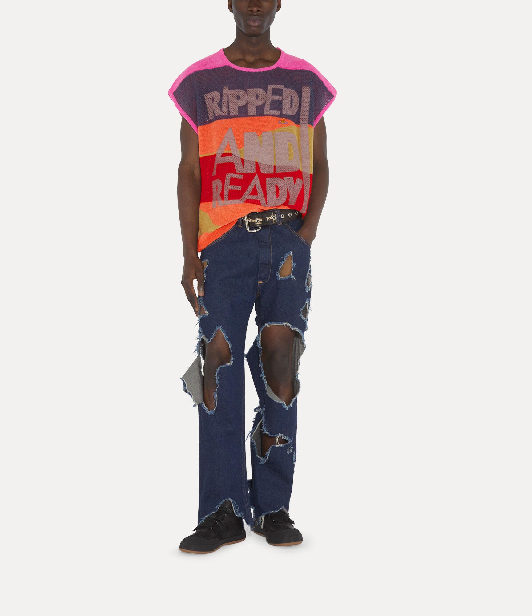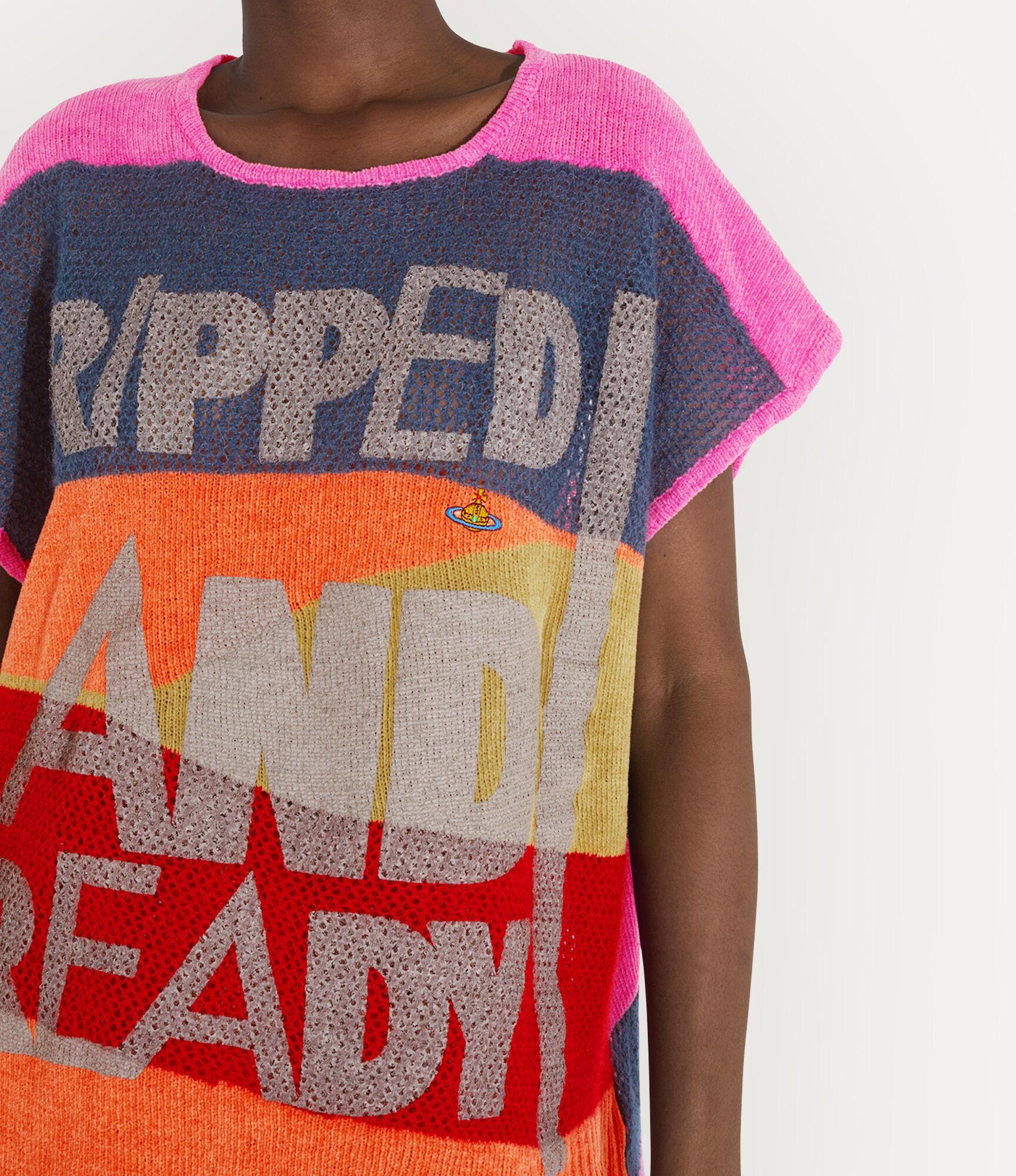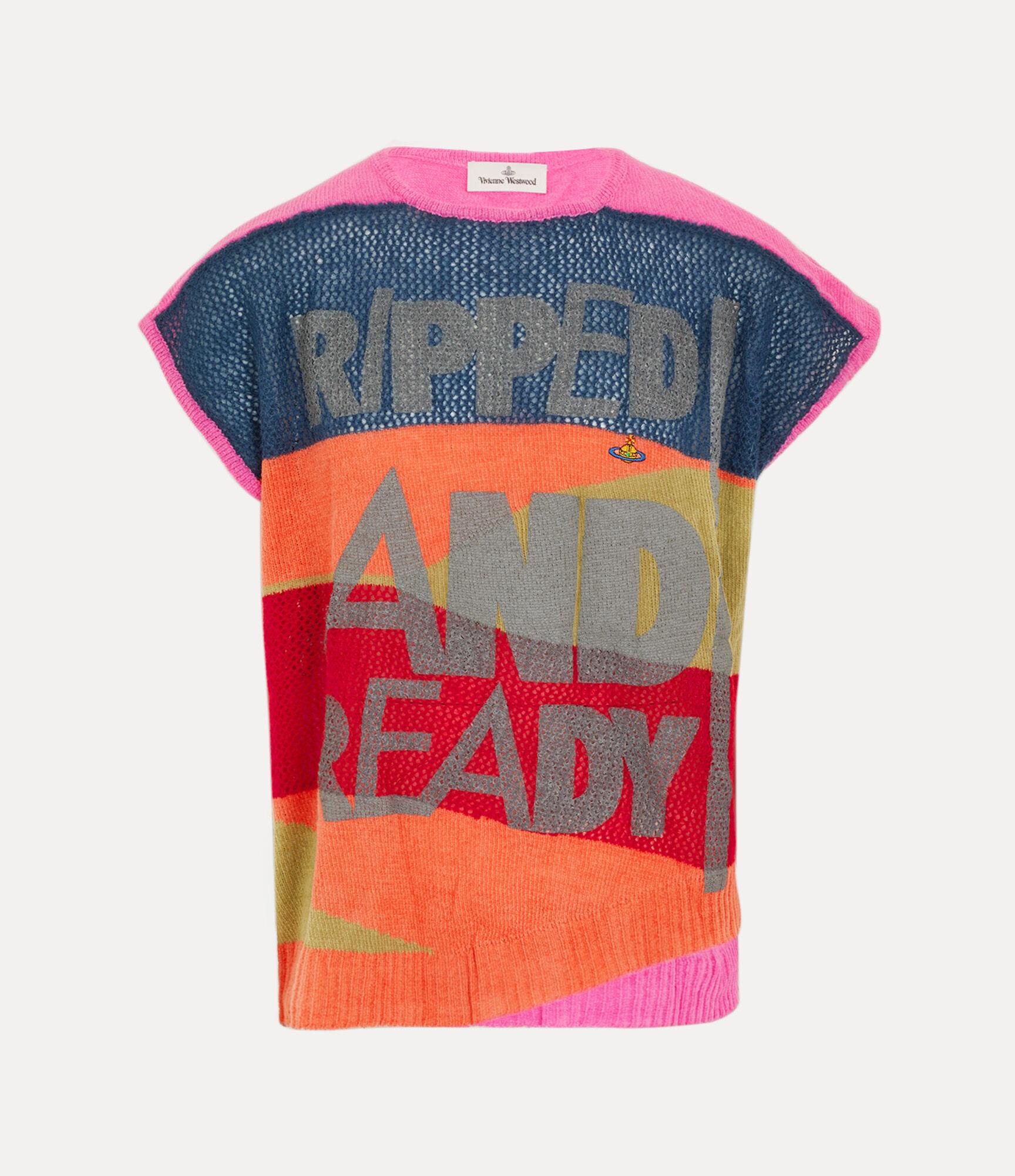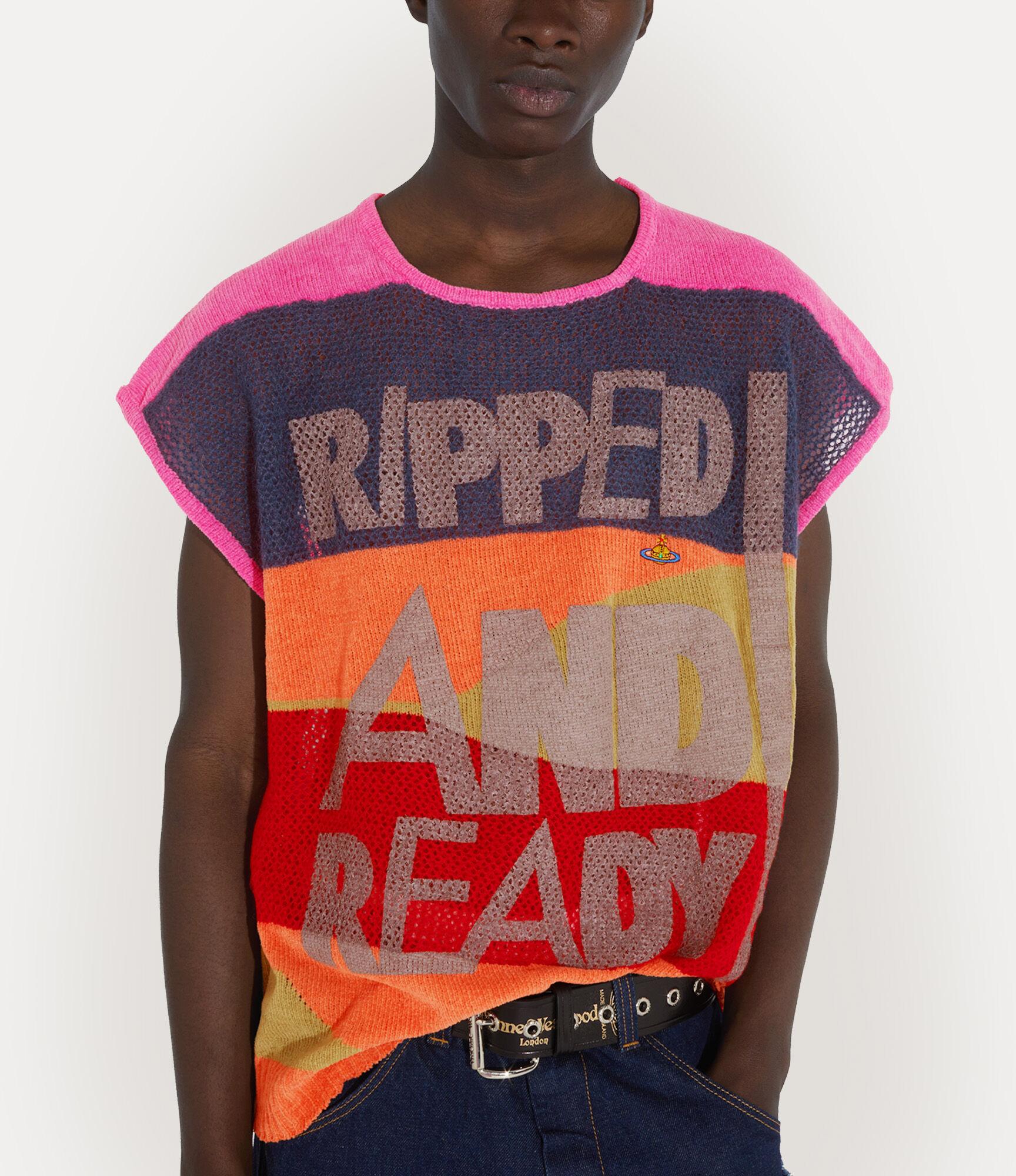 The Distressed vest is crafted from a cotton-mohair blend, featuring distressed stripes, color blocks, and net stitches. With an asymmetric front panel, the piece is adorned with a multi-coloured embroidered orb on the chest and the words "Ripped and Ready" across the front, evoking the house's archival Punk jumpers.