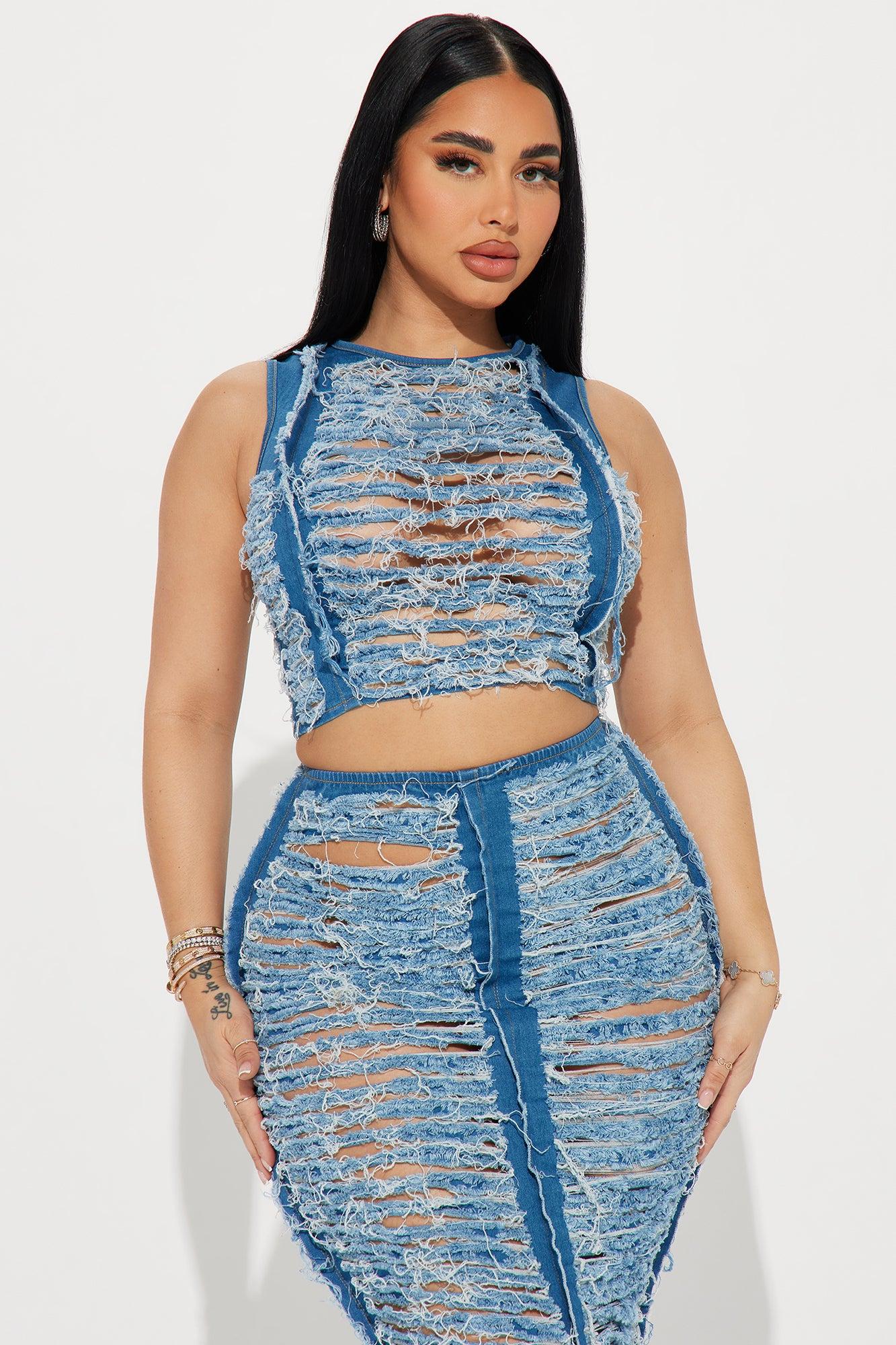 Available In Medium Wash. Denim Skirt Set All Over Distressed Detail Sleeveless Top Back Zipper Closure Maxi Skirt Back Zipper Closure Moderate Stretch Disclaimer: Due To The Distressing Process, Each Garment Is Unique. 97% Cotton 3% Spandex Imported California Proposition 65 WARNING: Cancer and Reproductive Harm - www.P65Warnings.ca.gov.
