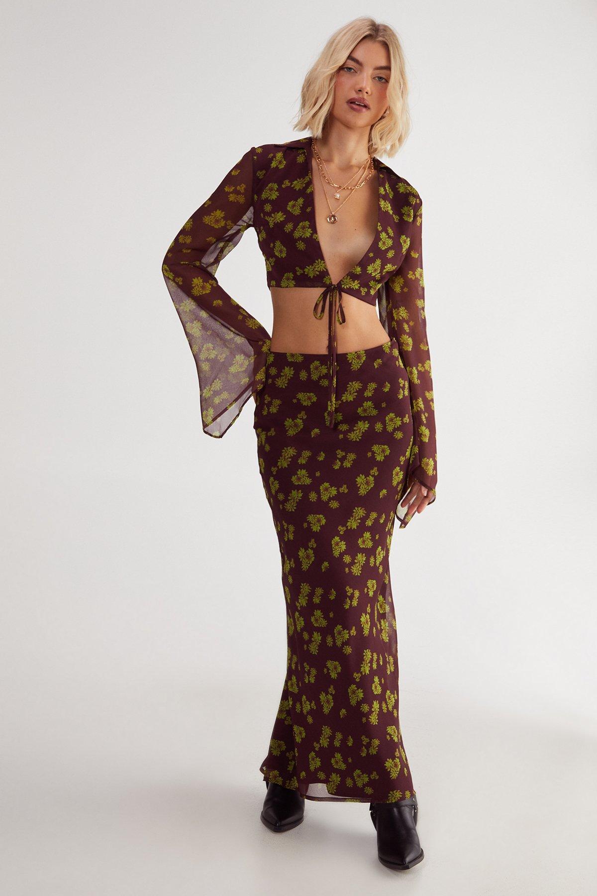 Ditsy Crinkle Chiffon Tie Front Fluted Sleeve Crop Top
