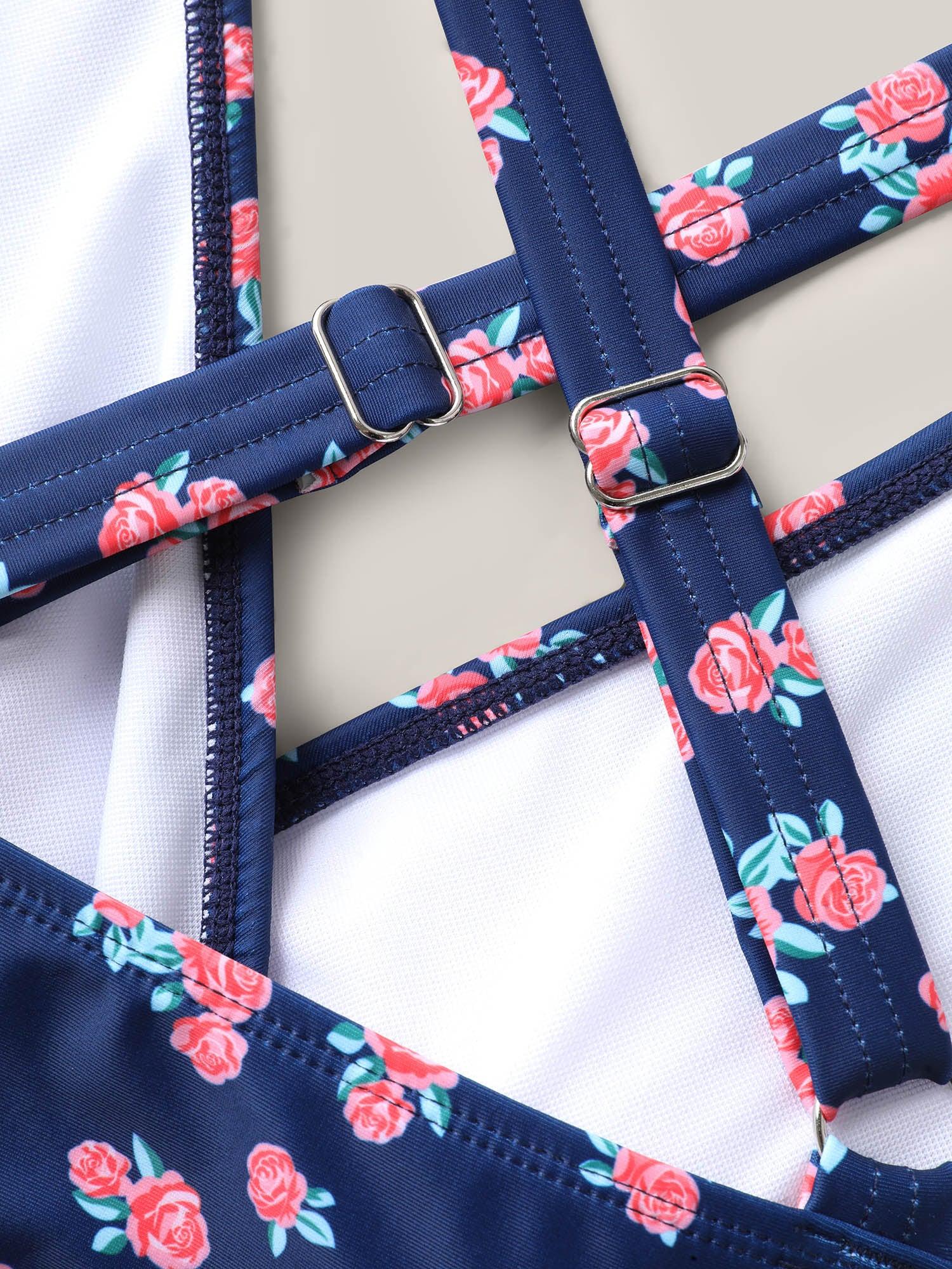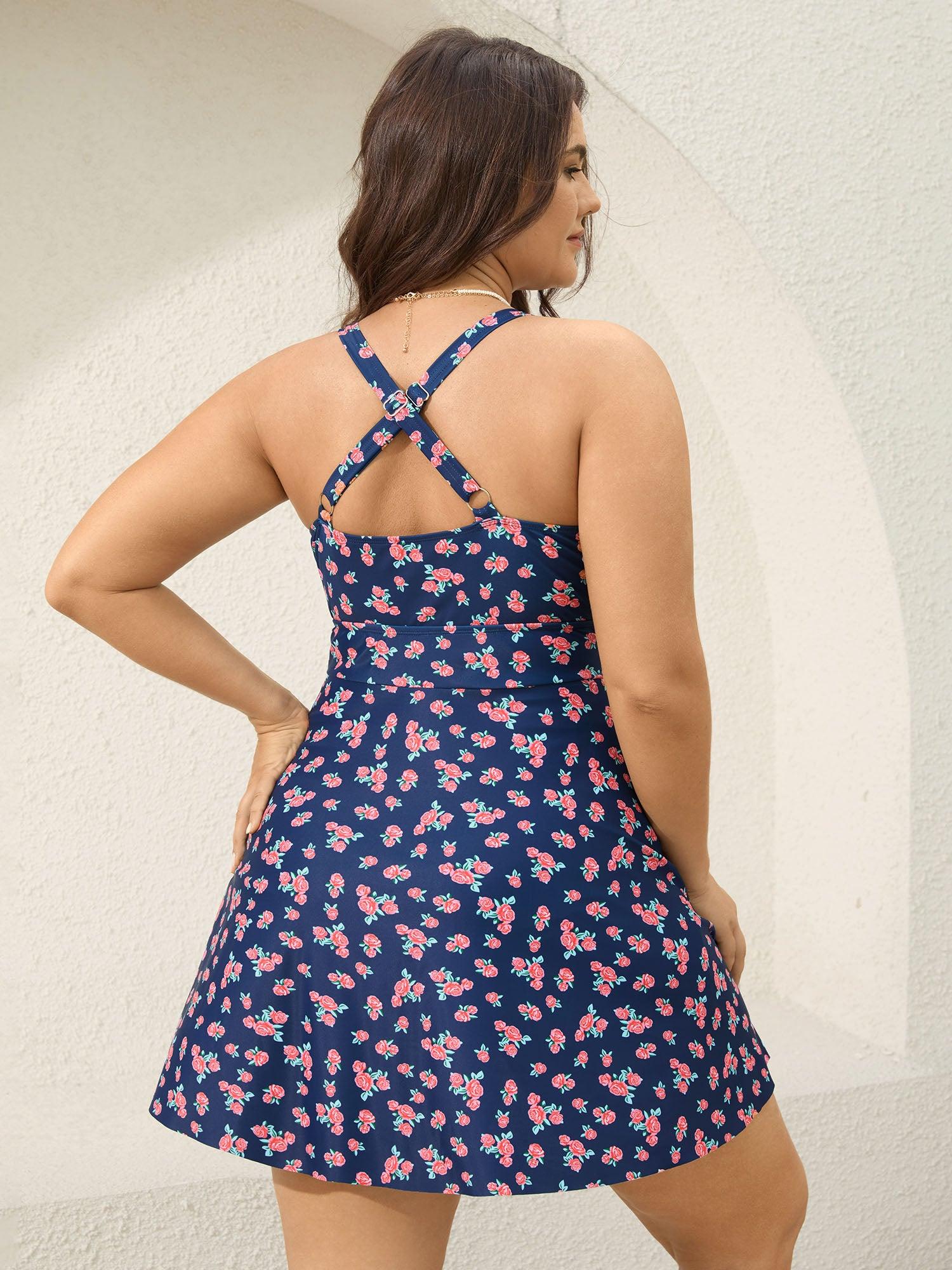Plus Size Ditsy Floral Wrap Crisscross Swim Dress Women's Swimwear Blue Vacation Bodycon V-neck High stretch Curve Swim Dresses BloomChic 12/L