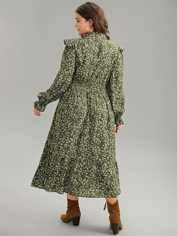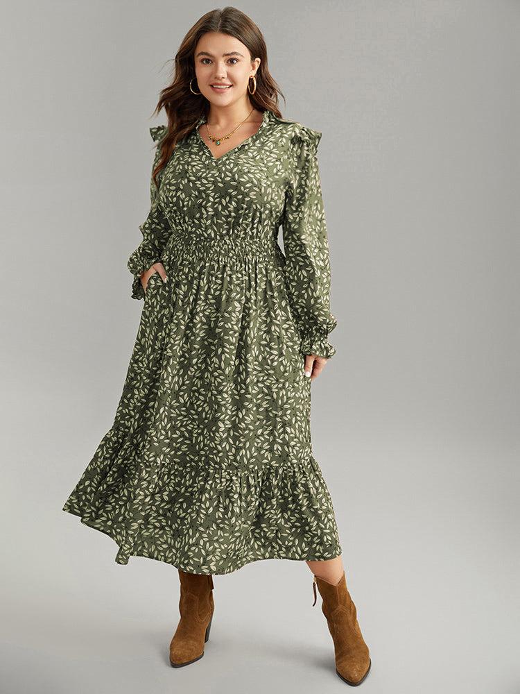 Shop Ditsy Floral Flutter Trim Pocket Shirred Dress now and redefine your style with confidence at BloomChic. Tailored for mid and plus-size women. This trendy Dress, sizes 10-30. You can never go wrong with BloomChic Dresses. Color:DarkBrown,Mint;Style:Elegant;Neckline:Notched collar;Sleeve Type:Lantern Sleeve;Pattern Type:Ditsy Floral;Details:Shirred, Pocket, Elastic Waist, Frill Trim, Printed;Pocket:It is perfectly sized to carry a phone.;Belt:No-belt