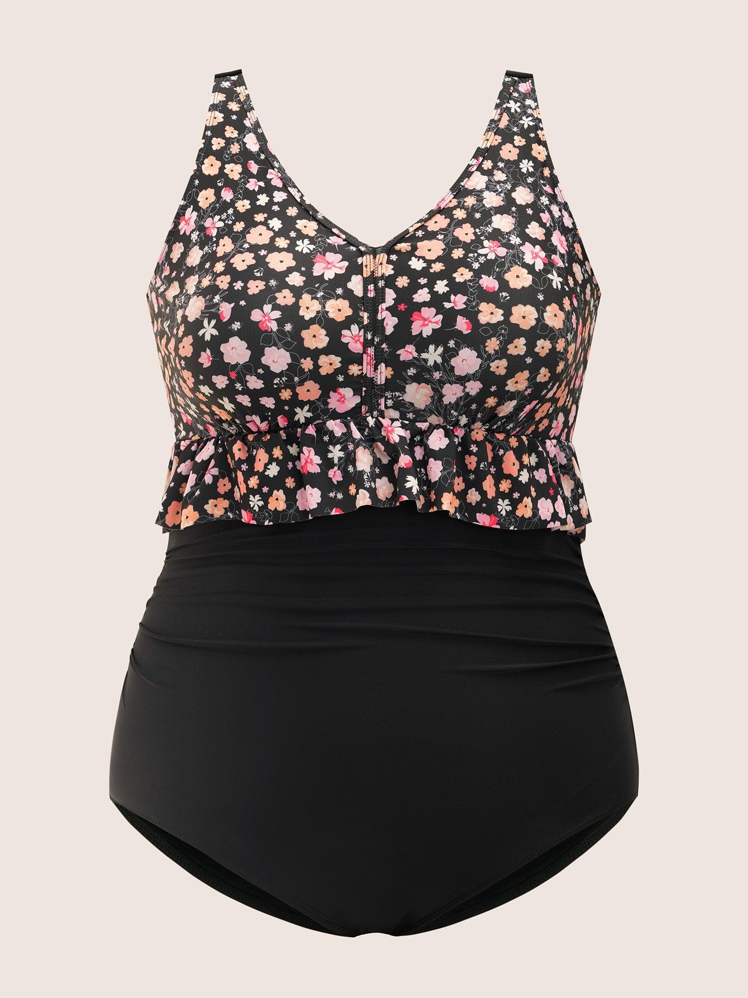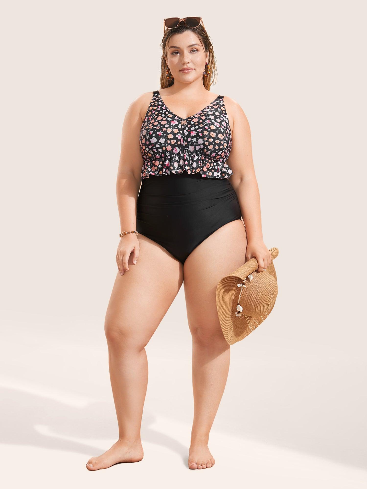 Shop Ditsy Floral Patchwork Ruffle Trim One Piece Swimsuit now and redefine your style with confidence at BloomChic. Tailored for mid and plus-size women. This trendy Swimwear Women, sizes 10-30. Season:Summer;Color:Black;Bra Type:Wireless;Coverage:Full;Waist Design:High Rise;Neckline:V-neck;Sleeve Type:Sleeveless;Prints:Ditsy floral;Details:Ruffles, Gathered, Patchwork;Pocket:No-pocket;Belt:No-belt;Chest pad:Removable Padding;Lining:Lining