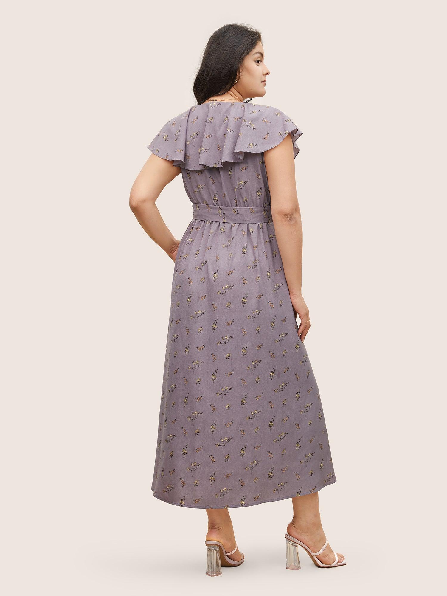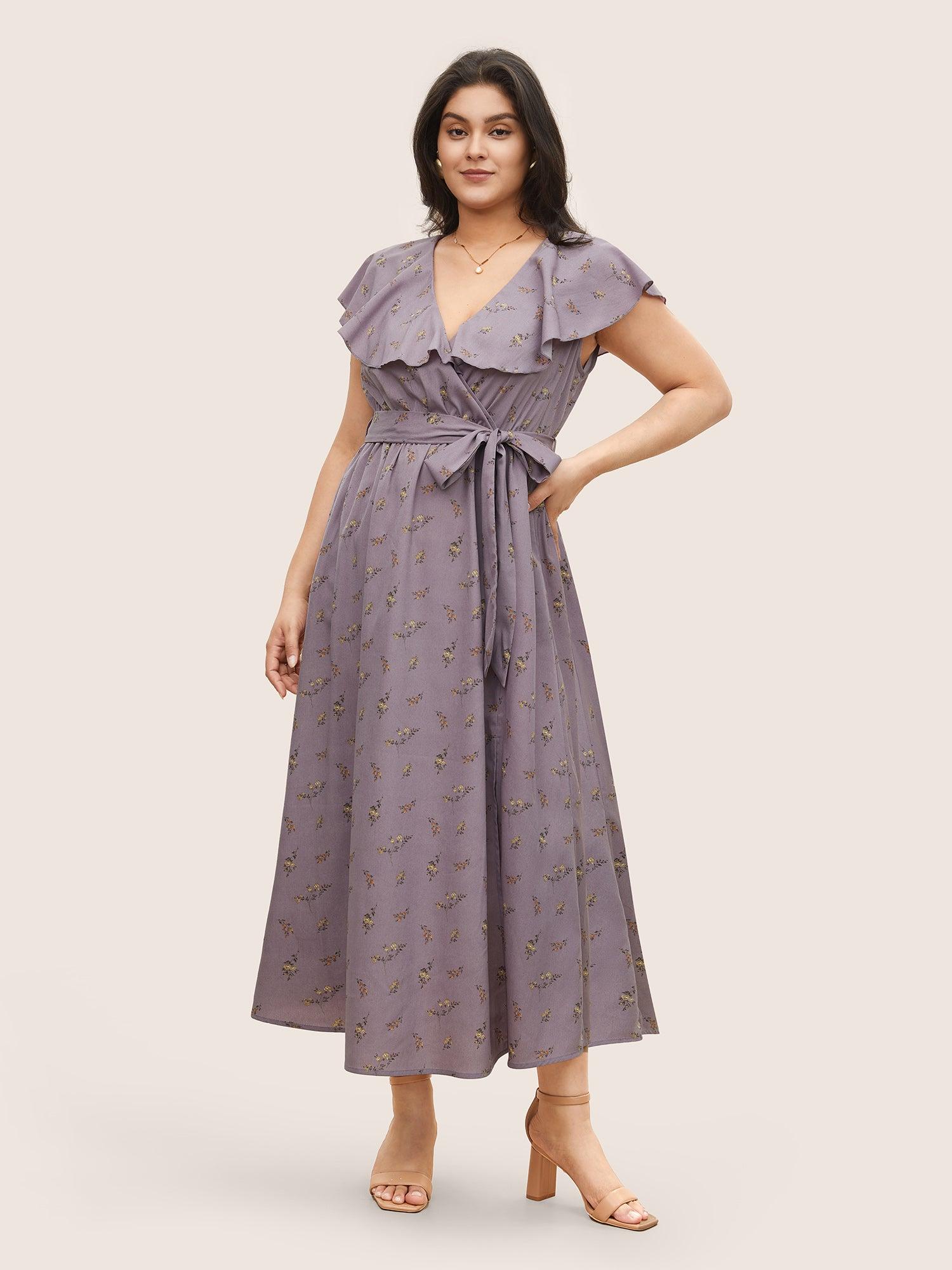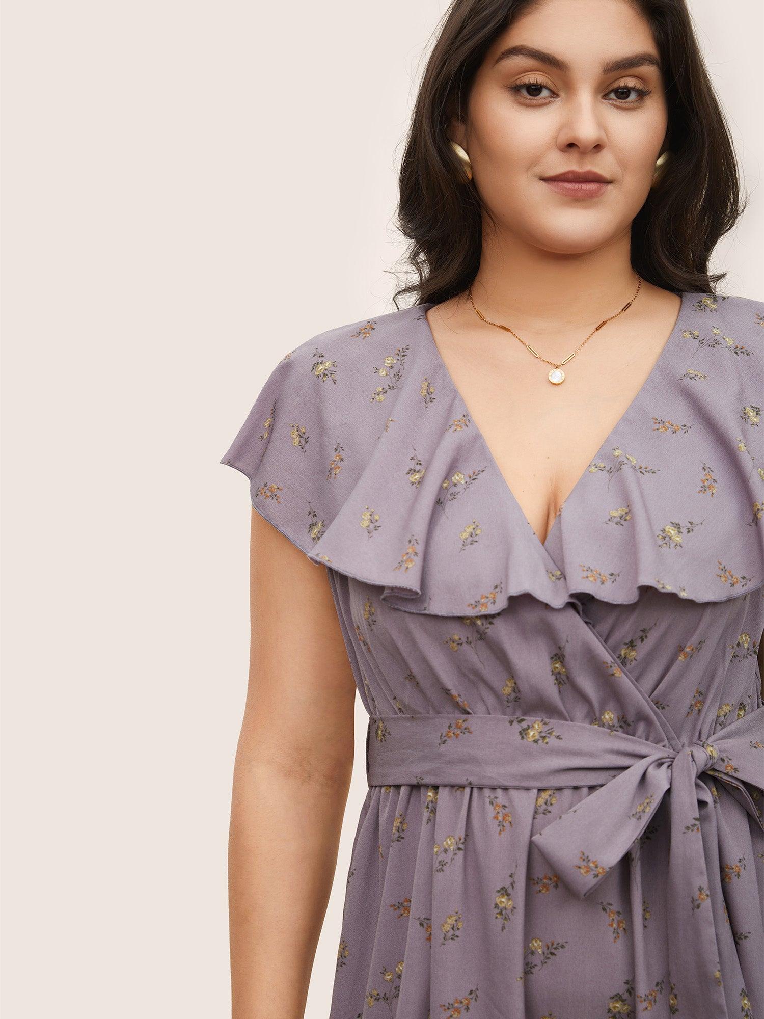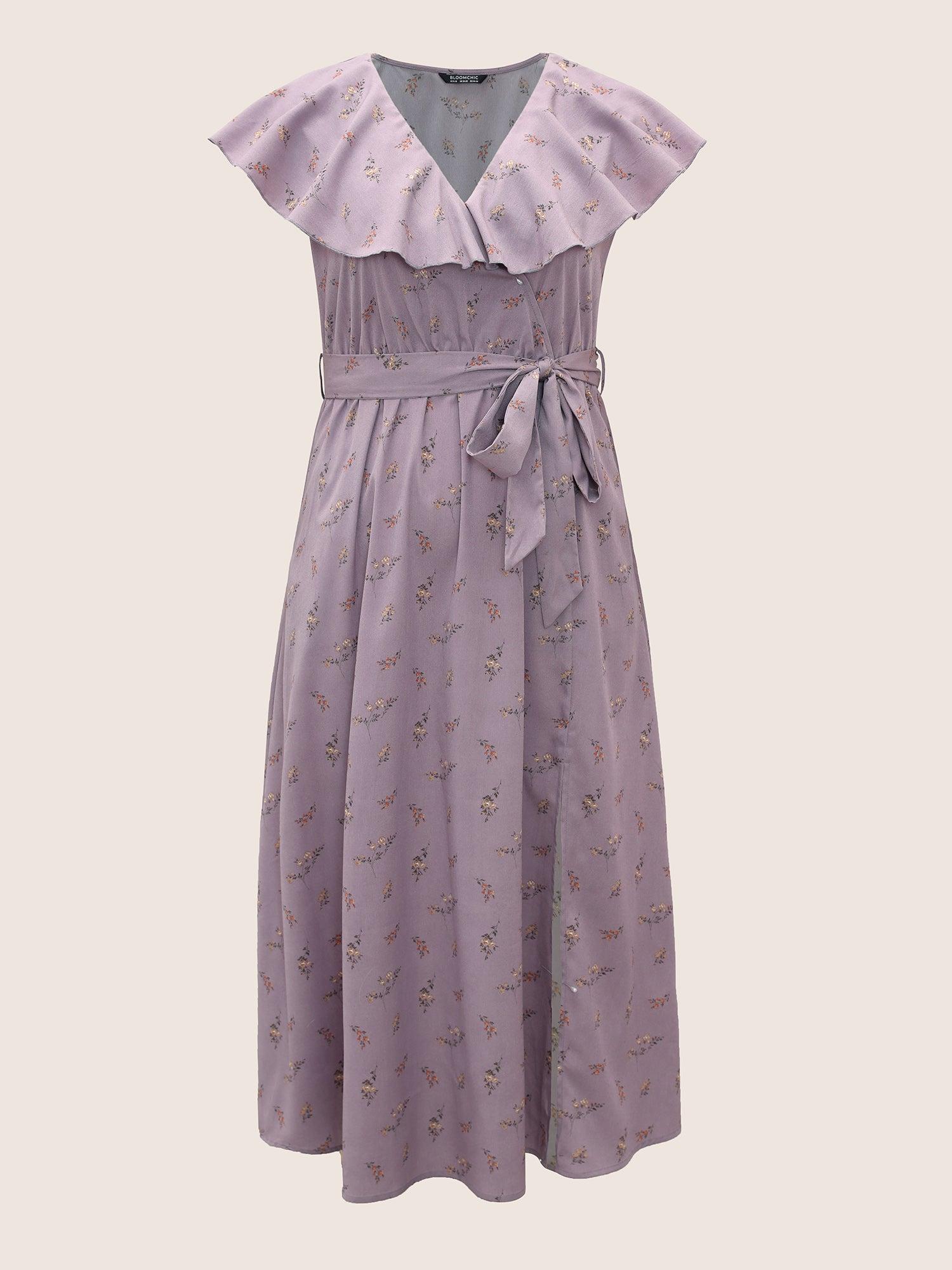 Shop Ditsy Floral Wrap Ruffle Cap Sleeve Split Hem Dress now and redefine your style with confidence at BloomChic. Tailored for mid and plus-size women. This trendy Dress, sizes 10-30. You can never go wrong with BloomChic Dresses. Season:Spring;Color:Mauve;Neckline:Overlap Collar;Sleeve Type:Ruffle Sleeve;Pattern Type:Ditsy Floral;Pocket:Side seam pocket;Belt:Belt