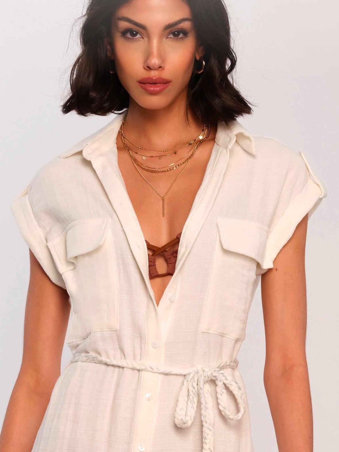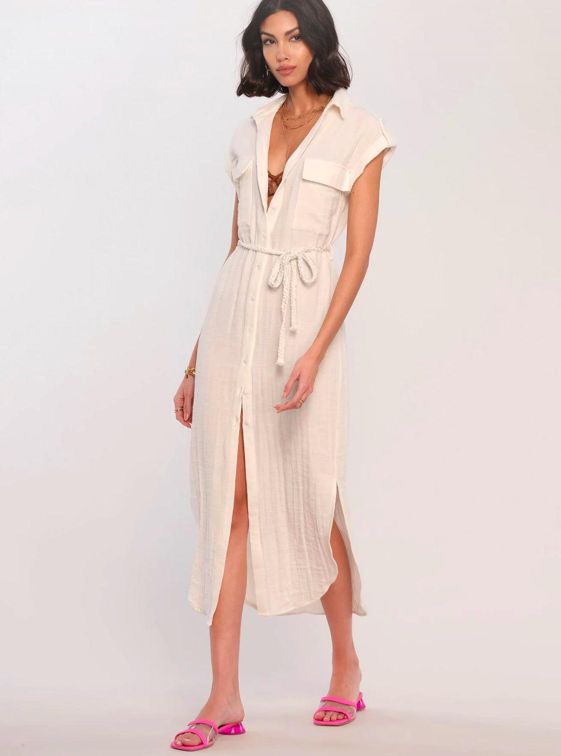 Meet the Dixie Dress, crafted from our washed cotton it's your go-to for those scorching summer days. It's designed with a front button-down style, patch pockets, cuffed sleeves, and a braided belt.