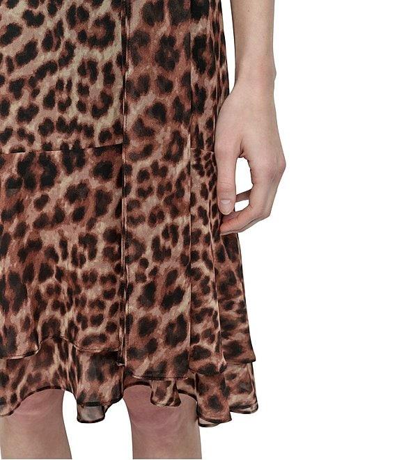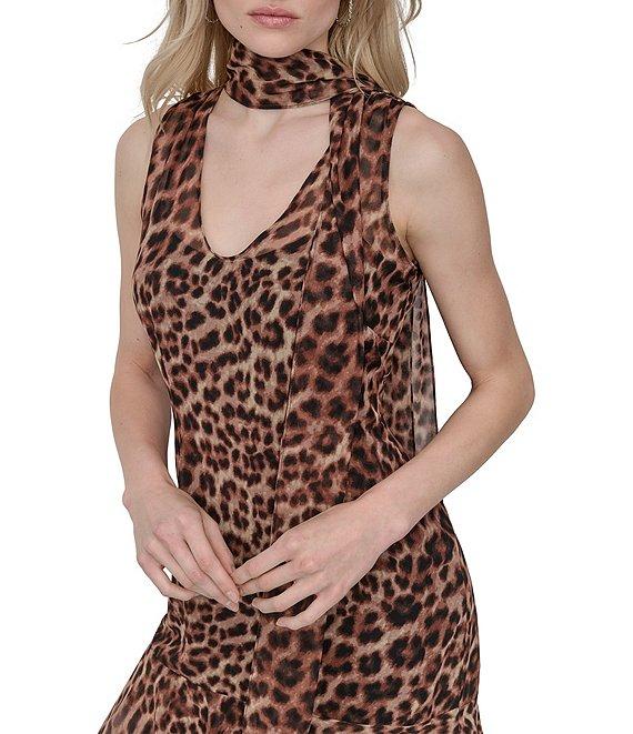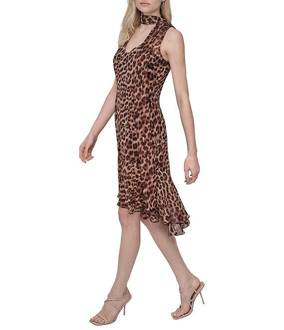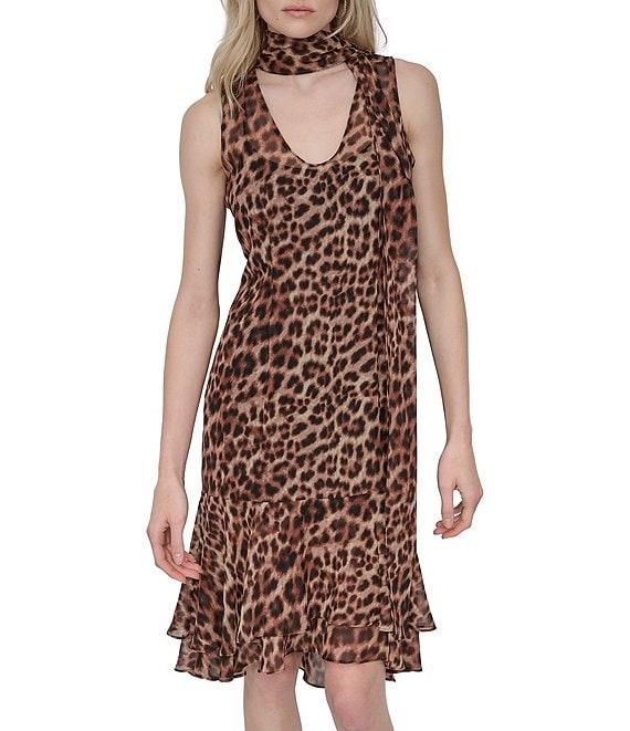 From DKNY by Donna Karan, this dress features: Chiffon fabrication V-neckline Sleeveless Fit and flare silhouette Ruffle hem Cheetah print High low hem Tie neck scarf Above the knee Lined Side zipper closure Approx. 34.75" in length Polyester Dry clean Imported.