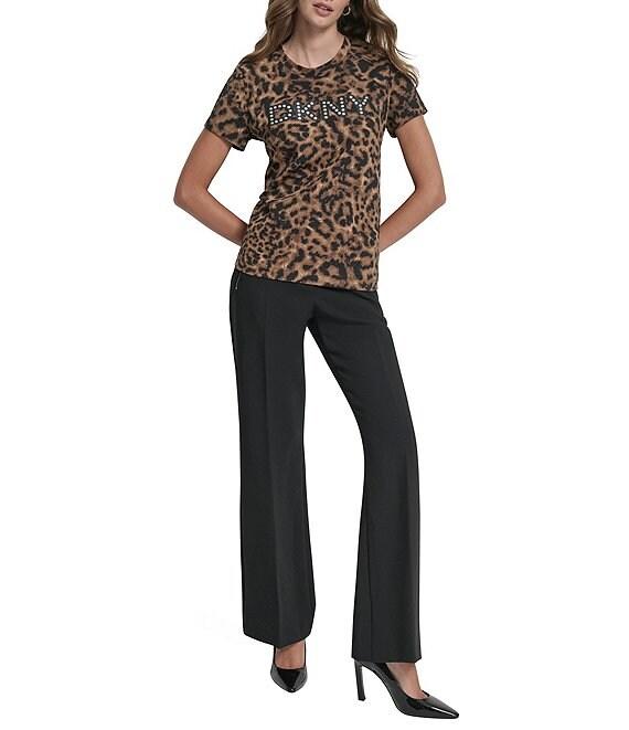 From DKNY by Donna Karan, this t-shirt features: Cotton blend fabrication Crew neckline Short sleeves Cheetah print Printed logo detail Straight hemline Pullover construction Approx. 24.5" length Cotton/elastane spandex Machine wash cold inside out/lay flat to dry Imported.