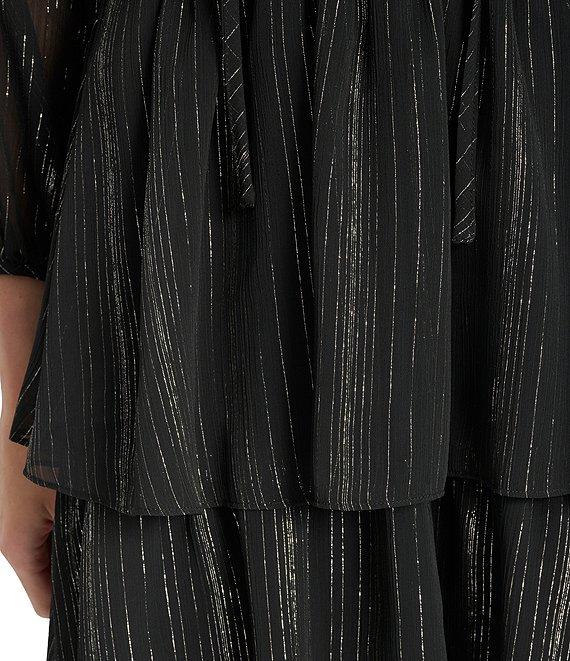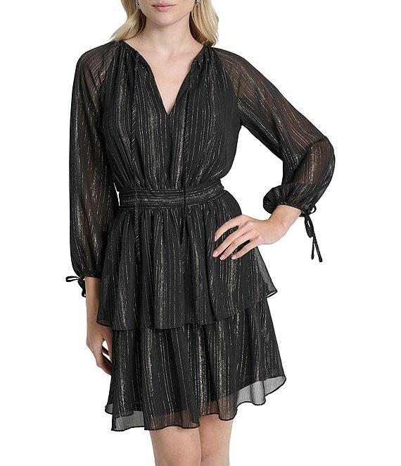 From DKNY by Donna Karan, this dress features: Chiffon fabrication Round neckline Center front keyhole with tie Long sleeves Tiered skirt Fit and flare silhouette Above the knee Lined Side zipper closure Approx. 36" in length Polyester Dry clean Imported.