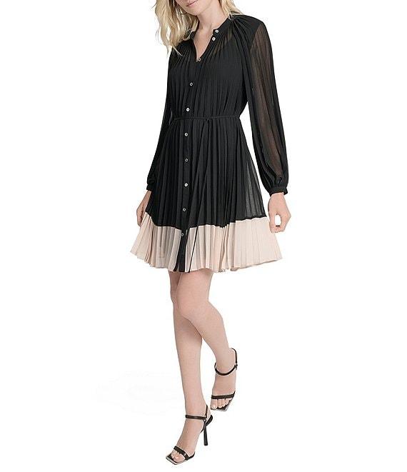 From DKNY by Donna Karan, this dress features: Chiffon fabrication Round neckline Collar Long sleeves Button front closure Lined with slip Adjustable straps on slip lining Self tie belt Removable belt Pleated skirt Above the knee length Color block hem Approx. 36.25" in length Polyester Dry clean Imported.