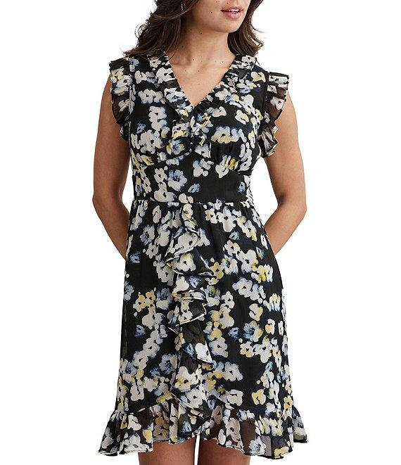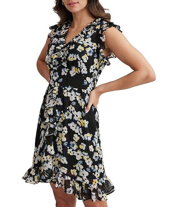 From DKNY by Donna Karan, this dress features:Chiffon fabricationV-necklineSleevelessFaux wrap silhouetteLinedFloral printRuffle detailsZip back closureApprox. 36.75" in center back lengthPolyesterDry cleanImported.