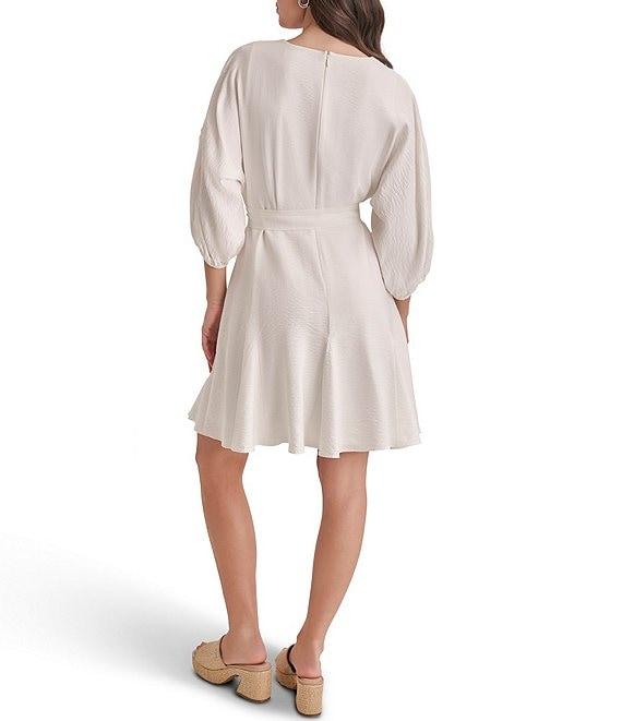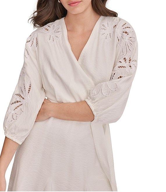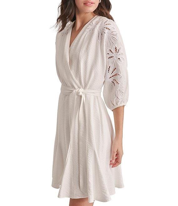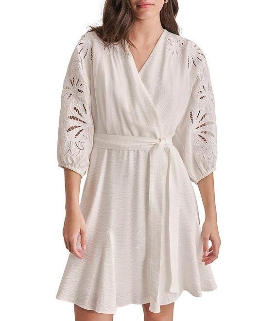 DKNY by Donna Karan Eyelet Surplice Neck 3/4 Sleeve Tie Belt Mini Dress