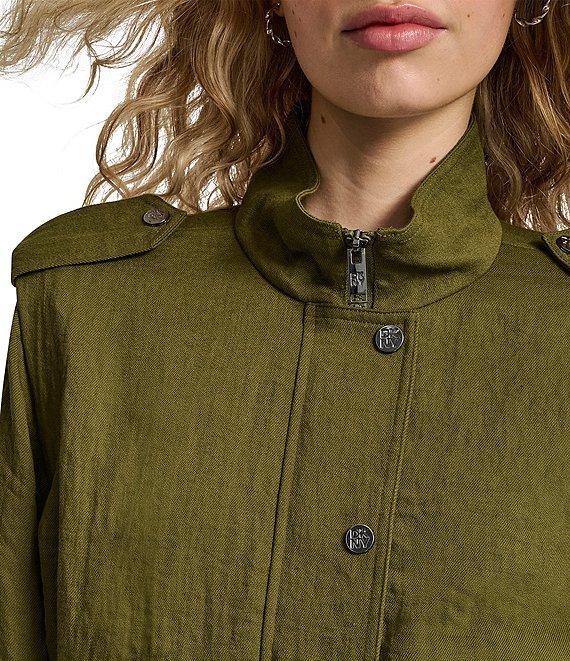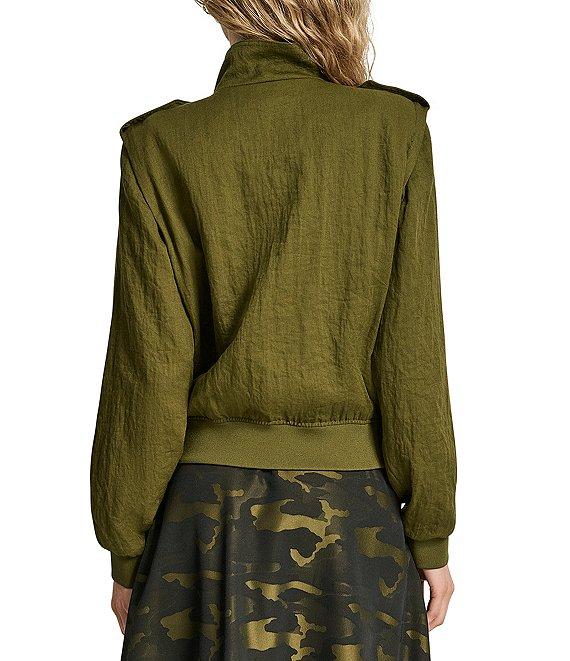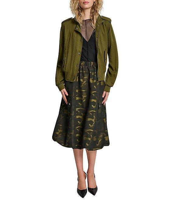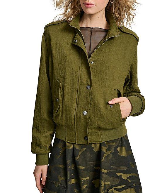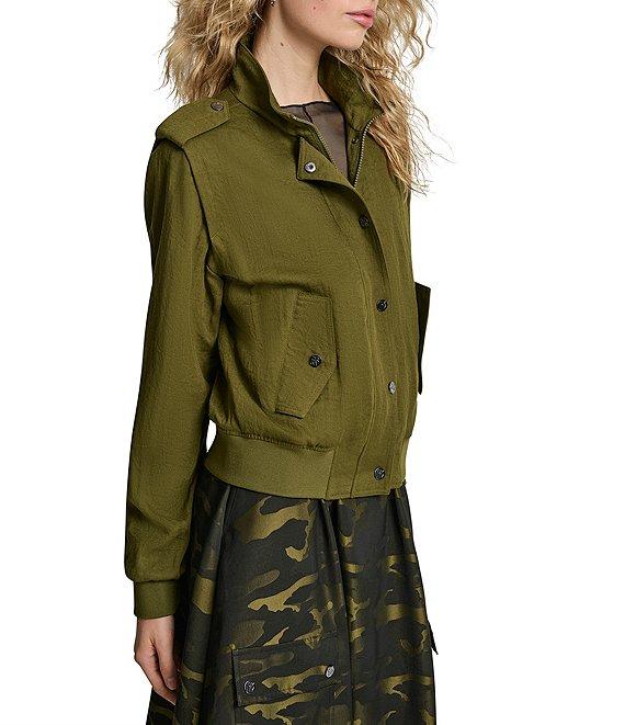 From DKNY by Donna Karan, this skirt features: Heavy twill fabrication Stand collar Shoulder epaulettes Long sleeves Waist pockets Lined Zip and button closure Approx. 22" length Viscose rayon/nylon: Lining; polyester Machine wash cold/ tumble dry low Imported.