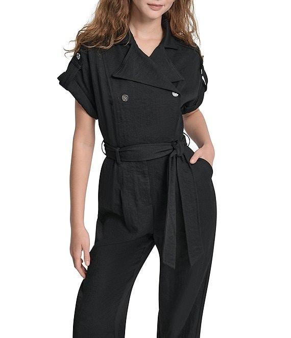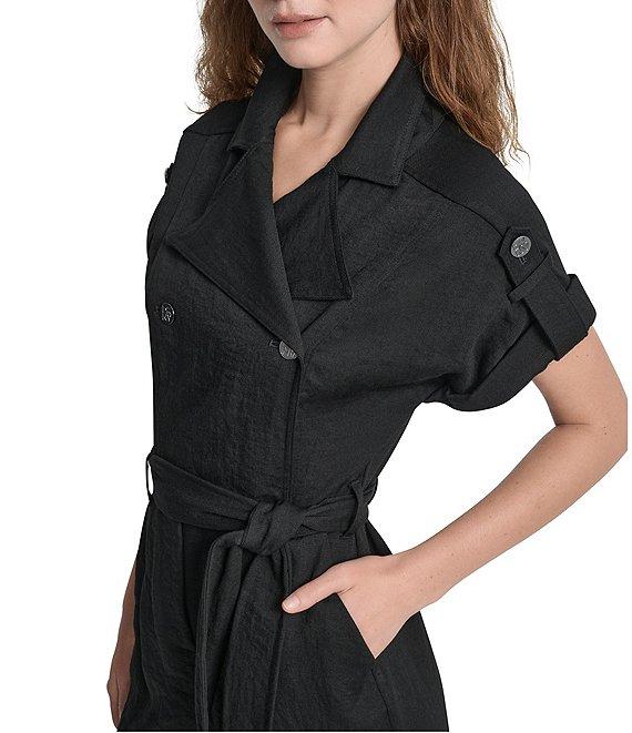 From DKNY by Donna Karan, this jumpsuit features: Heavy twill fabrication Notch collar Short sleeves Shoulder epaulettes Self tie belt Two front slant chest Front button closure Approx. 30.75" inseam, 12.24" front rise, 17.25" back rise Rayon/nylon Machine wash cold/flat dry or dry clean Imported.