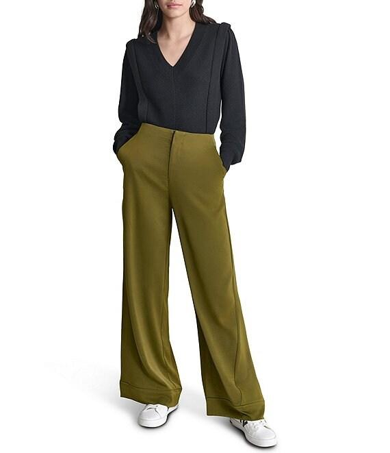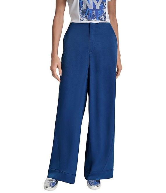 From DKNY by Donna Karan, these pants feature: Wide leg silhouette High rise Side seam pockets Pull on construction Approx. inseam 31", 12" front rise, 16.75" back rise Polyester Machine wash cold/tumble dry low Imported.