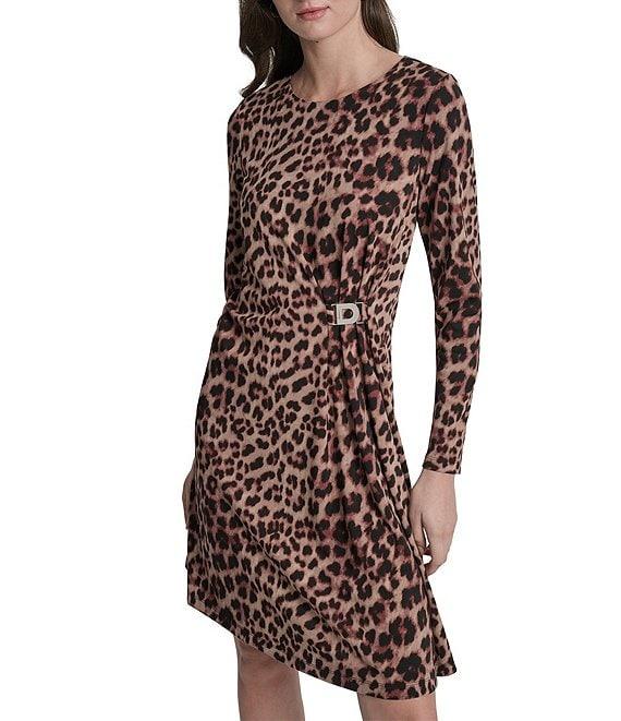 From DKNY by Donna Karan, this dress features: Jersey fabrication Round neckline Long sleeves Ruched bodice D-buckle hardware Above the knee length Hook and eye center back closure Approx. 39" in length from high point shoulder Polyester Dry clean Imported.
