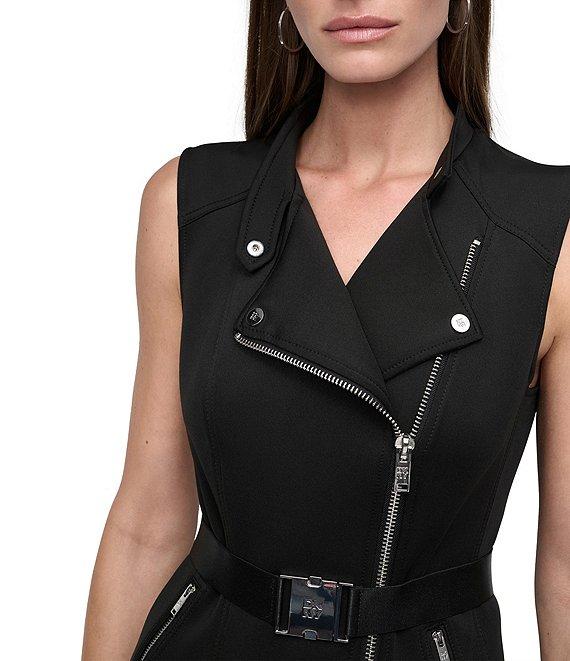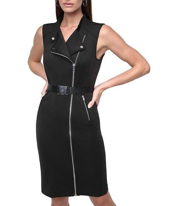 DKNY by Donna Karan Knit Notch Collar Neck Sleeveless Buckle Belt Front Zipper Sheath Mini Dress