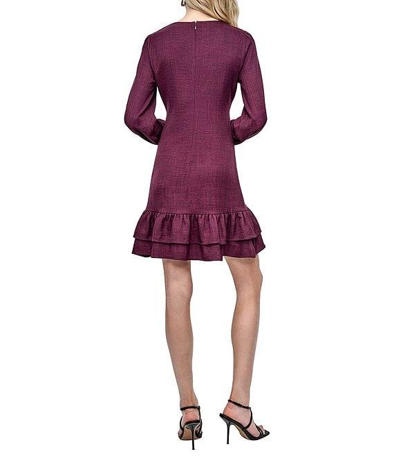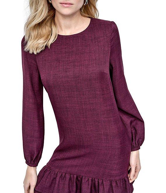 From DKNY by Donna Karan, this dress features: Mélange washer fabrication Round neckline Long sleeves Long bubble sleeves Double ruff hem Shift silhouette Center back zipper/ hook & eye Approx. 35" in length Polyester/spandex Dry clean Imported.